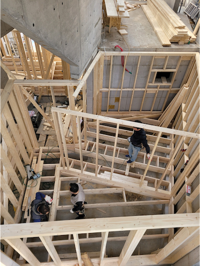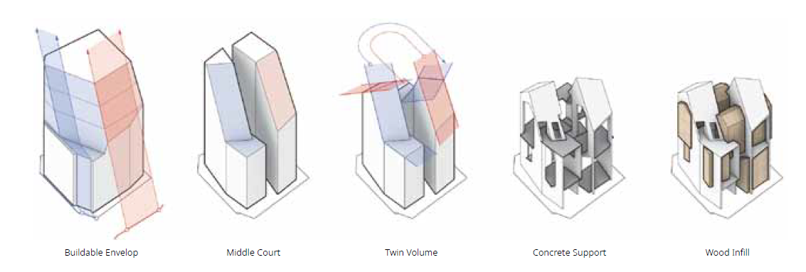 이 하이브리드적인 재료의 혼합은 서울의 고층 주거 현실에 대한 도전임과 동시에 실용적이면서도, 실내 조직에 대한 느슨한 용도(Loose-Fit)라는 사고를 구현한다. 이는 목조 건축을 고층화하는 데 처한 현실적이고 실무적인 한계를 받아들이면서도, 경량 목구조에 대한 이해, 이를 다룰 수 있는 국내 기술의 숙련도 그리고 단기 건설 시장의 급격한 변화를 반영한 결과이기도 하다. 더 나아가 목재와 콘크리트라는 재료 선택을 통해 기후 변화와 자원 고갈에 대한 서울의 건축적인 대안을 제시하며, 내부의 미시 기후를 만들기 위해 목재와 콘크리트에 대한 균형 잡힌 접근 방식을 강조했다.