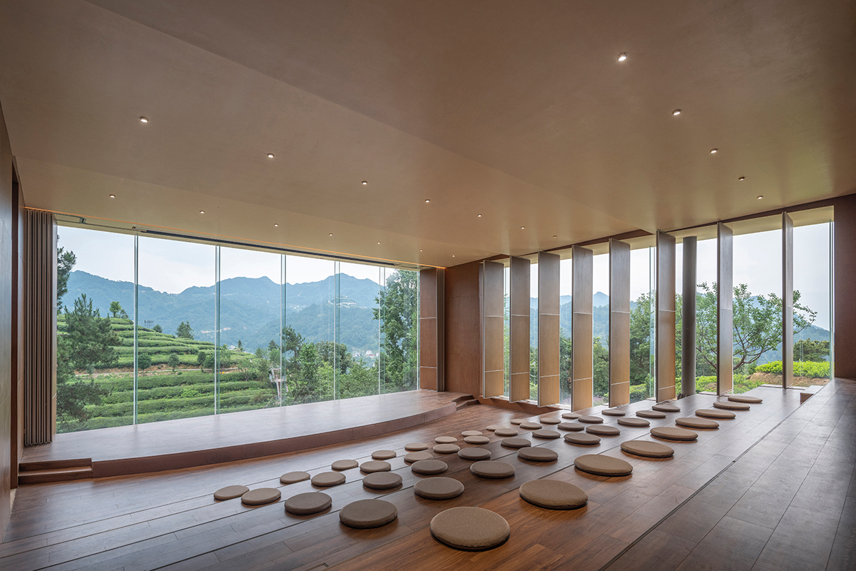 These halls can be used for film and TV show performances, wedding ceremonies, and other activities. The motorized screen panel system, which can be rotated and slid, allows for flexible modes of the audio-video hall. When the screen panels are opened, the tea garden landscape comes into view and serves as a natural background for music performances. When the panels are closed, the space becomes fully light-proof, providing a better environment for projections. The multi-functional hall offers a broad field of view and can be used as an ancillary space for the audio-visual hall or as an independent small exhibition space.