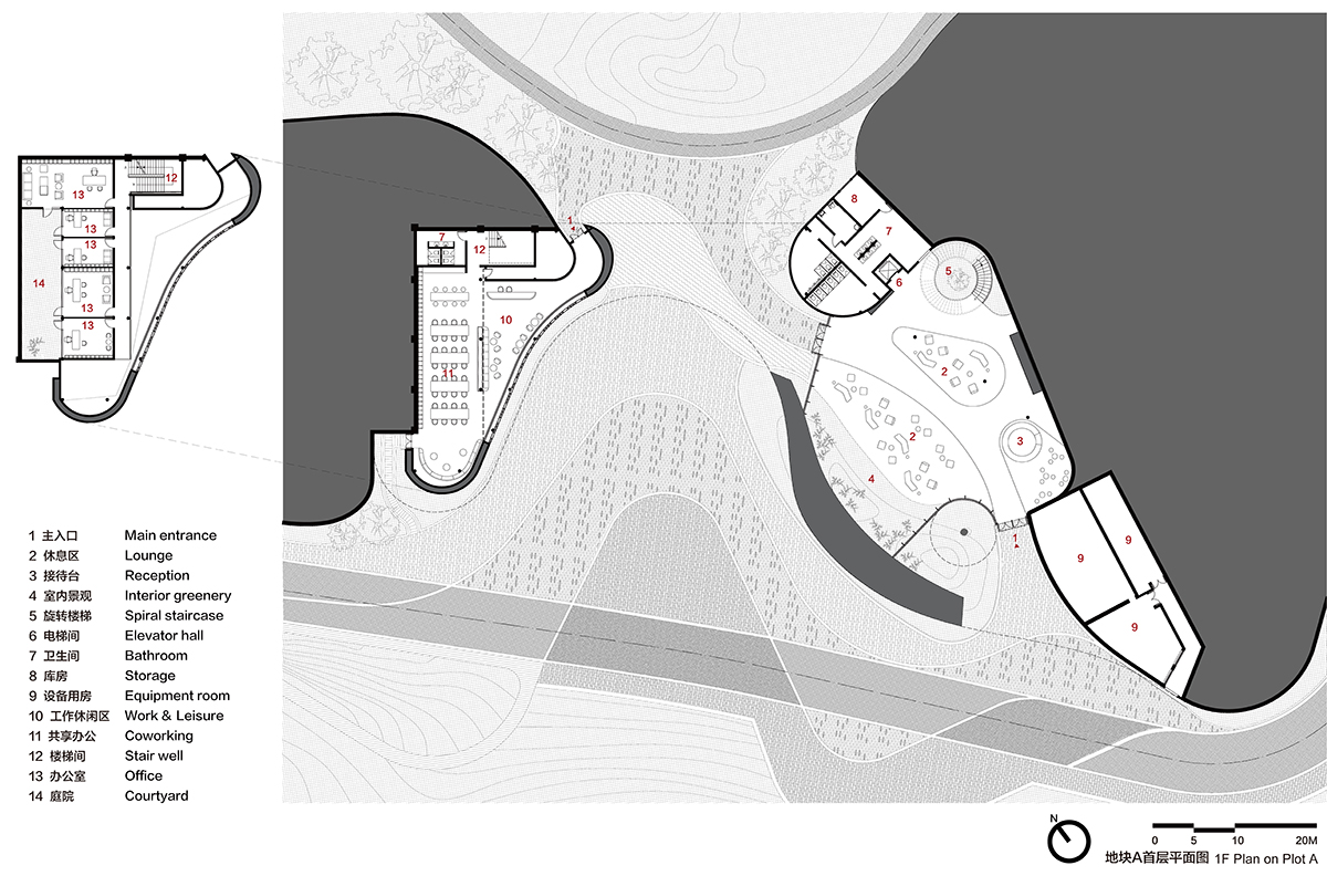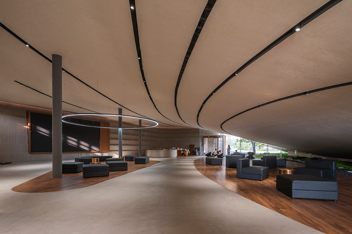 Beneath the large steps on Plot A lies the eastern part of the building's first floor, which is a tourist reception center. This area provides various functions such as reception, display, rest, waiting, and sale of agricultural products. The design maintains the complete curved shape of the top surface beneath the steps, and creates a circular tea tree courtyard that defines the main entrance.