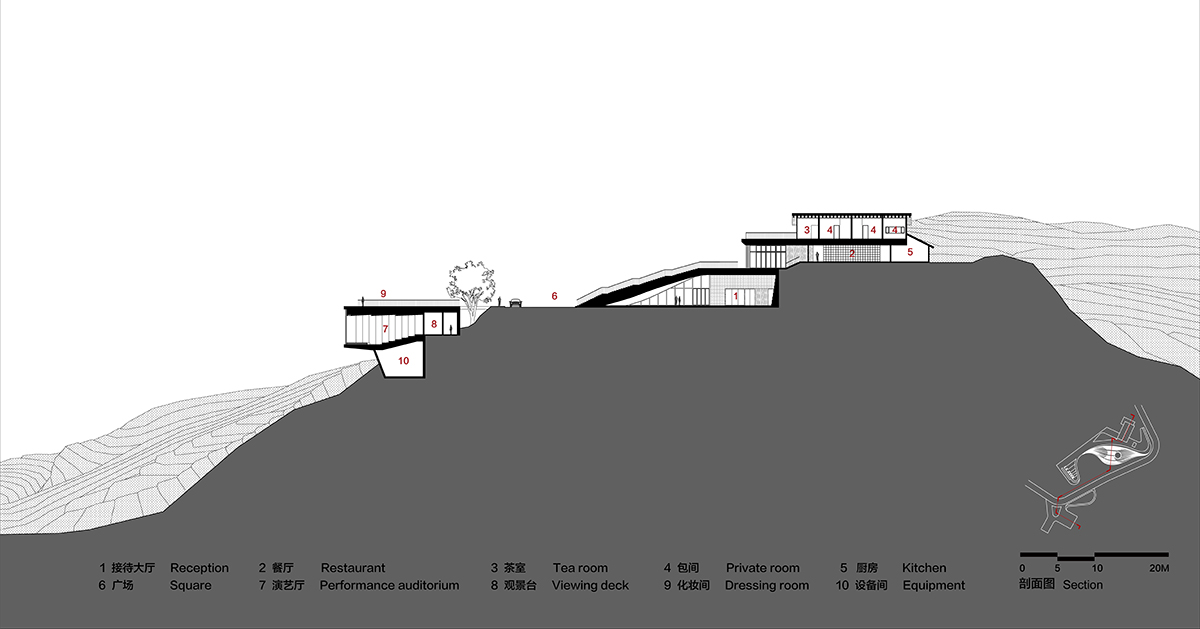 In winding tea mountains, it's challenging to find flat ground, which makes the square in front of the hill very precious. So, the square is retained and extended to the top of the hills, creating a “bridge”-like building between the hills.