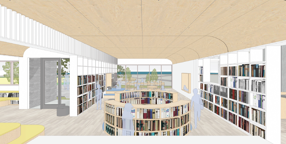 누구나 쉽게 도서관을 이용할 수 있도록 1층에 자료실, 다목적실 등 도서관의 주요 프로그램을 모두 배치하고, 상대적으로 독립적 성격을 갖는 북카페와 힐링 공간은 테라스로 확장되는 2층에 두어 외부 조망이 가능하도록 하였다. 홀과 일반자료실은 복층 공간으로 구성하여 1층과 2층 공간이 시각적으로 연계되며 개방적인 공간이 되도록 하였다. 운영 공간은 1층에 집중 배치하여 도서관 관리 업무의 효율성을 높이고자 했다.