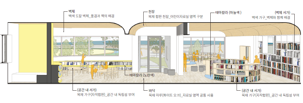 - 열린 공간 안에서 서가와 가구로 각 자료실의 공간 구획