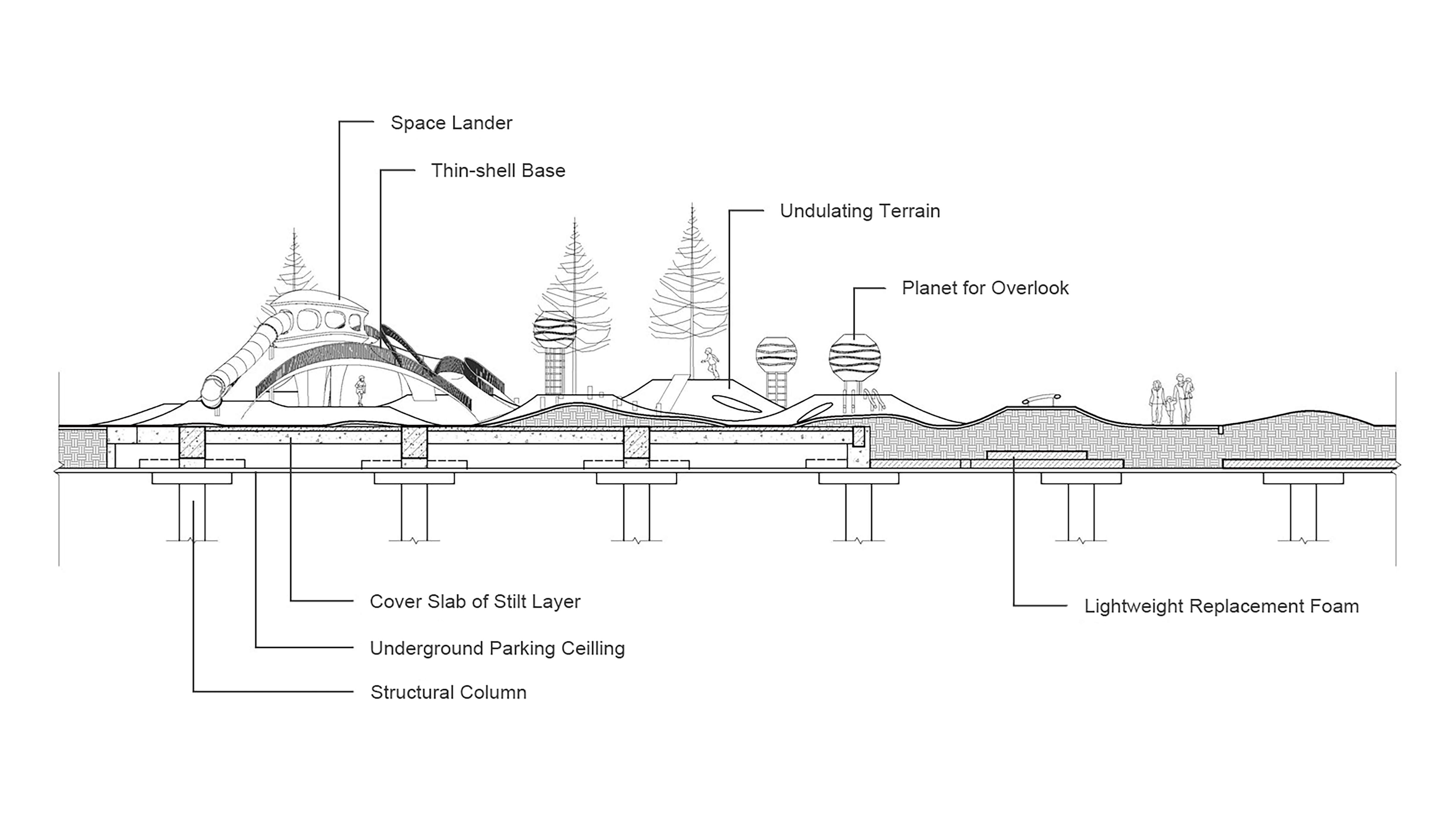 The undulating concrete shell structure mimics natural cave-like topography, offering climbing spaces above and sheltered areas below. Inspired by the load transfer mechanism of natural arches, it enables large spans and ultra-thin structural thicknesses, visually integrating with the landscape. This enhances the visual cohesion of the artificial structure while reducing the need for columns, optimizing spatial efficiency.
