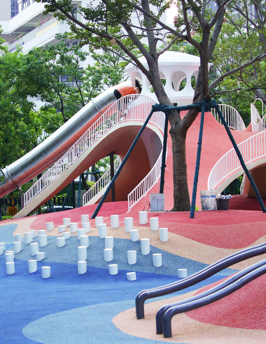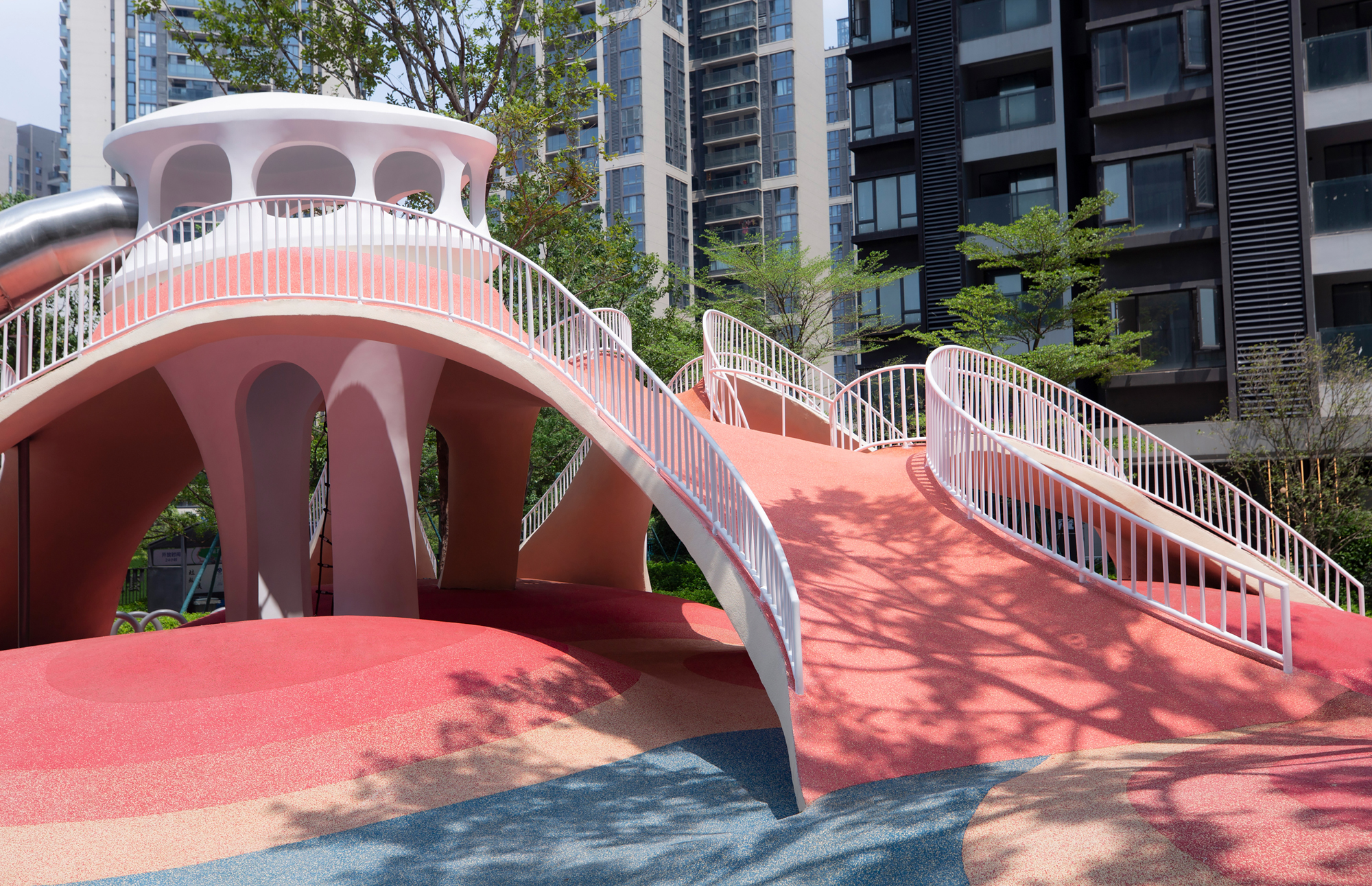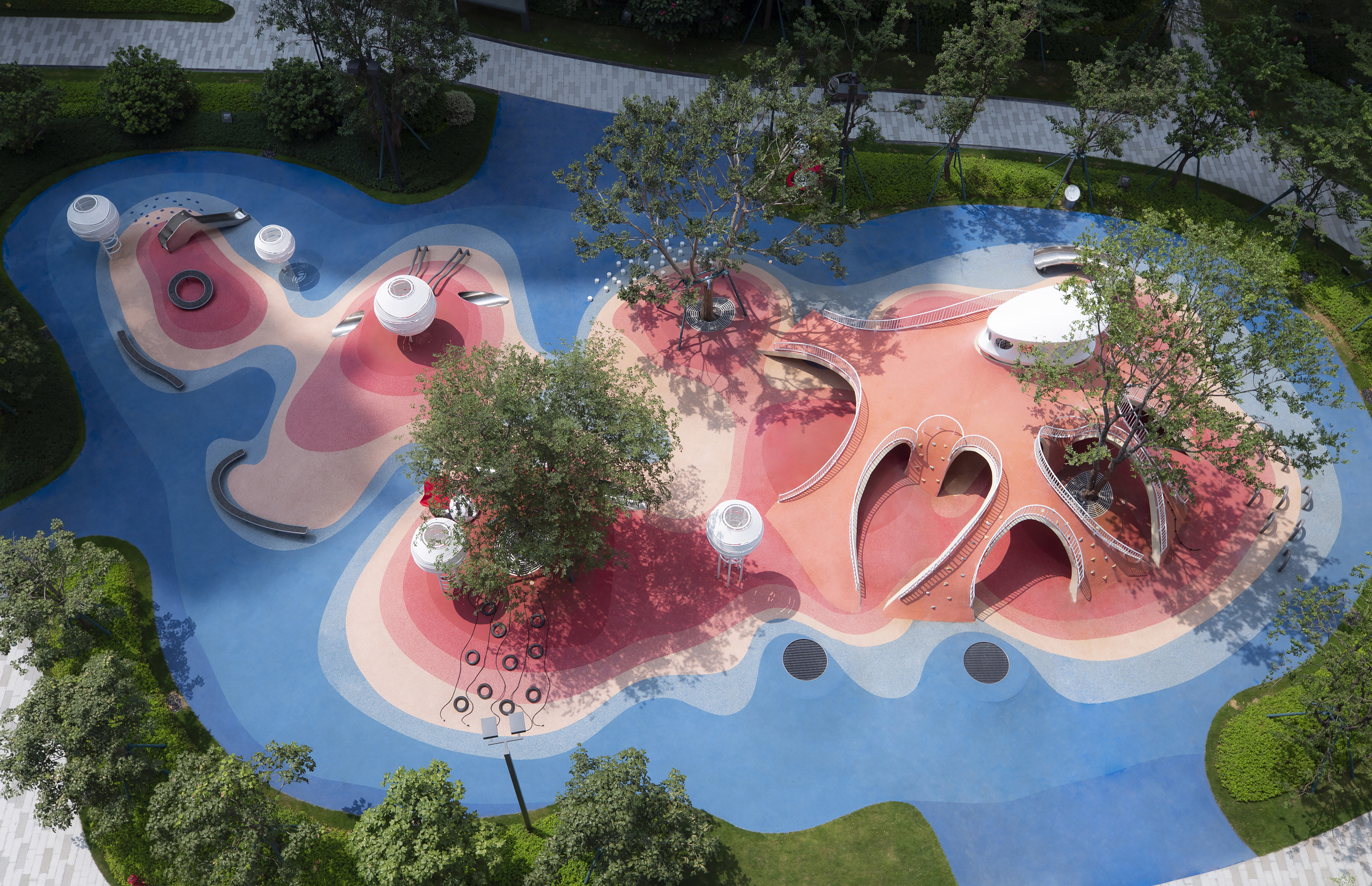 굴곡이 심한 붉은 모래언덕은 즐거움 가득한 지형을 제공한다. 우리는 일련의 매우 기능적인 어린이 활동 시설을 지형에 통합하여 자연스러운 조화를 만들었다. 이 프로젝트는 파라메트릭 디자인, 배수 최적화 시뮬레이션 및 구조적 형상탐색 알고리즘과 같은 고급 설계 기법을 사용하여 자연환경과 조화롭게 결합한다. 이는 어린이와 어른 모두가 야외 놀이와 탐험의 즐거움에 몰입하도록 영감을 주는 것을 목표로 한다.