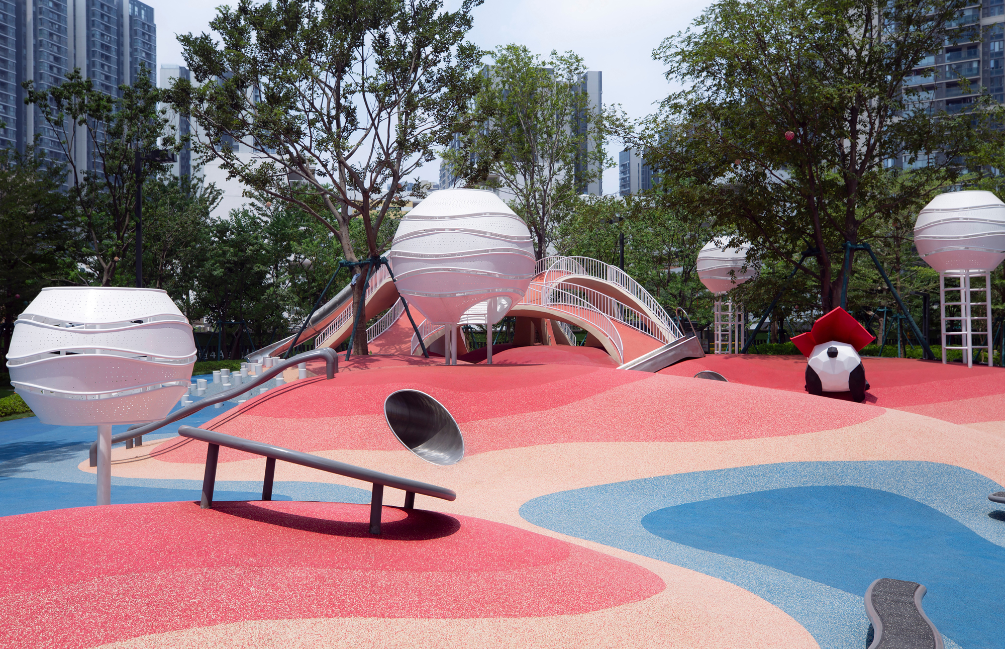The undulating red dunes offer a playful terrain. We have integrated an array of richly functional children's activity installations into the topography, creating a natural harmony. Utilizing advanced design techniques such as parameterized design, drainage optimization simulation, and structural form-finding algorithms, the project harmoniously merges with its natural surroundings. It aims to inspire both children and adults to immerse themselves in the joy of outdoor play and exploration.