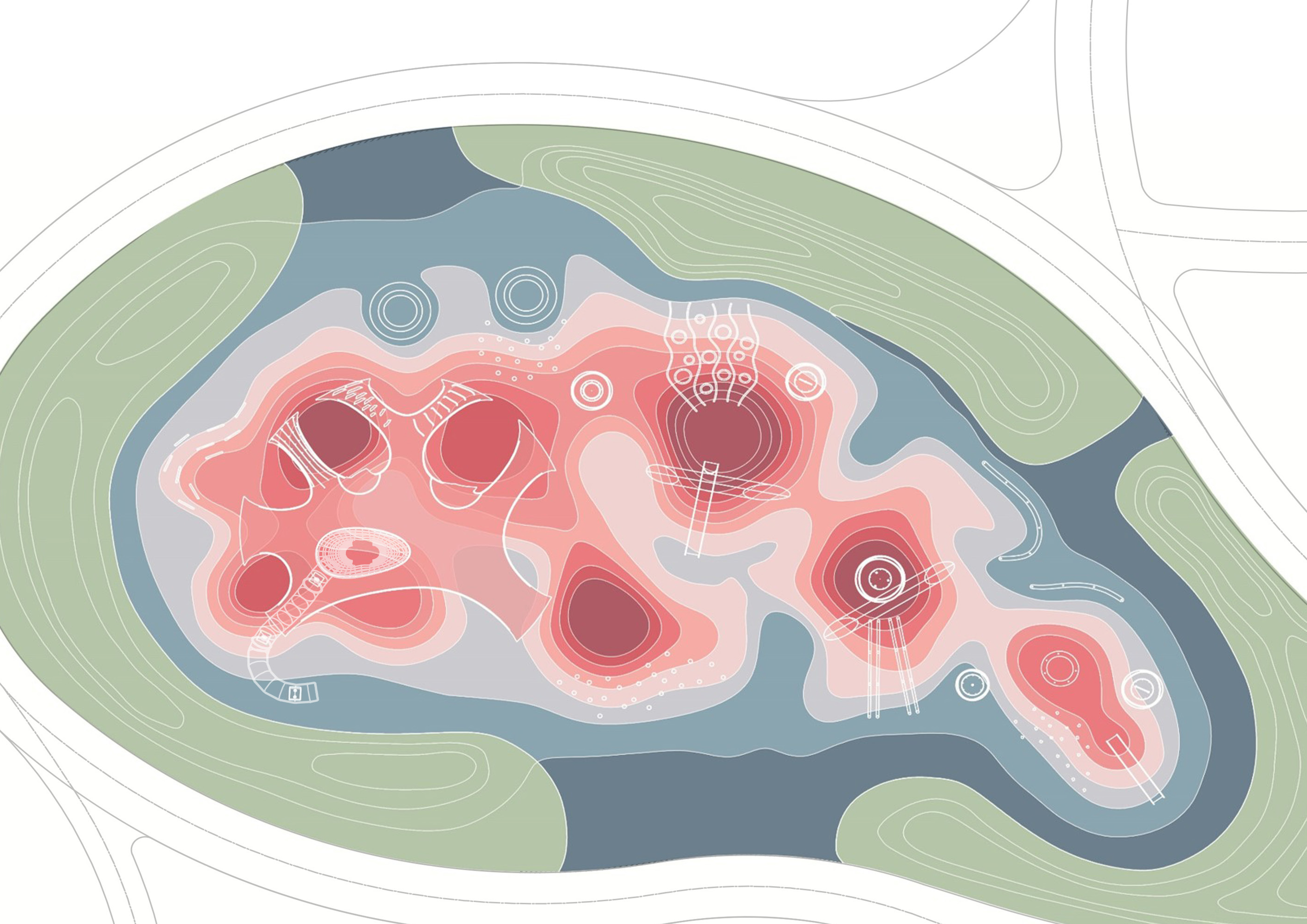 전체 지형의 디지털 생성은 지형의 복잡성과 경사도를 고려하여 다양한 연령대별로 구분된 구역을 묘사한다. 어린이 활동시설은 자연환경과 매끄럽게 어우러져 응집력 있는 공간을 형성한다.