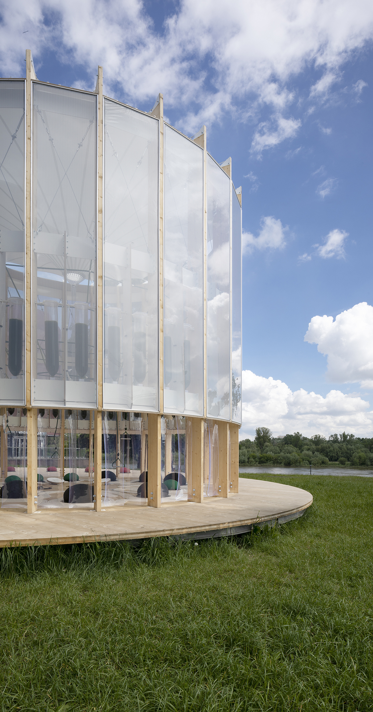 AirBubble invents a new architectural typology. It incorporates a cylindrical timber structure wrapped in an ETFE membrane protecting 52 glass algae reactors. This creates a real urban algae greenhouse. The space is equipped with ropes, foot pumps and bouncy spheres, and can function as both playground and outdoor classroom. The white bubbling noise of the algae gardening system masks the surrounding urban noise to provide a calming atmosphere in which to play and interact. The filtering process is enhanced by the architectural morphology of the playground structure. The ETFE membrane – an evolution of the PhotoSynthetica urban curtain system presented in Dublin in 2018 by ecoLogicStudio – controls the microclimate inside AirBubble. The inverted conical roof membrane further stimulates the air recirculation and natural ventilation, which in turn keeps the play area clean. The AirBubble monitoring system integrates urban air pollution sensors and is connected to a data processing platform capable of comparing measurements in real time and of highlighting the Air Quality Index for six core pollutants: fine particulate PM2.5 and PM10, ground level Ozone (O3), Nitrogen Dioxide (NO2), Sulphur Dioxide (SO2) and Carbon Monoxide (CO).