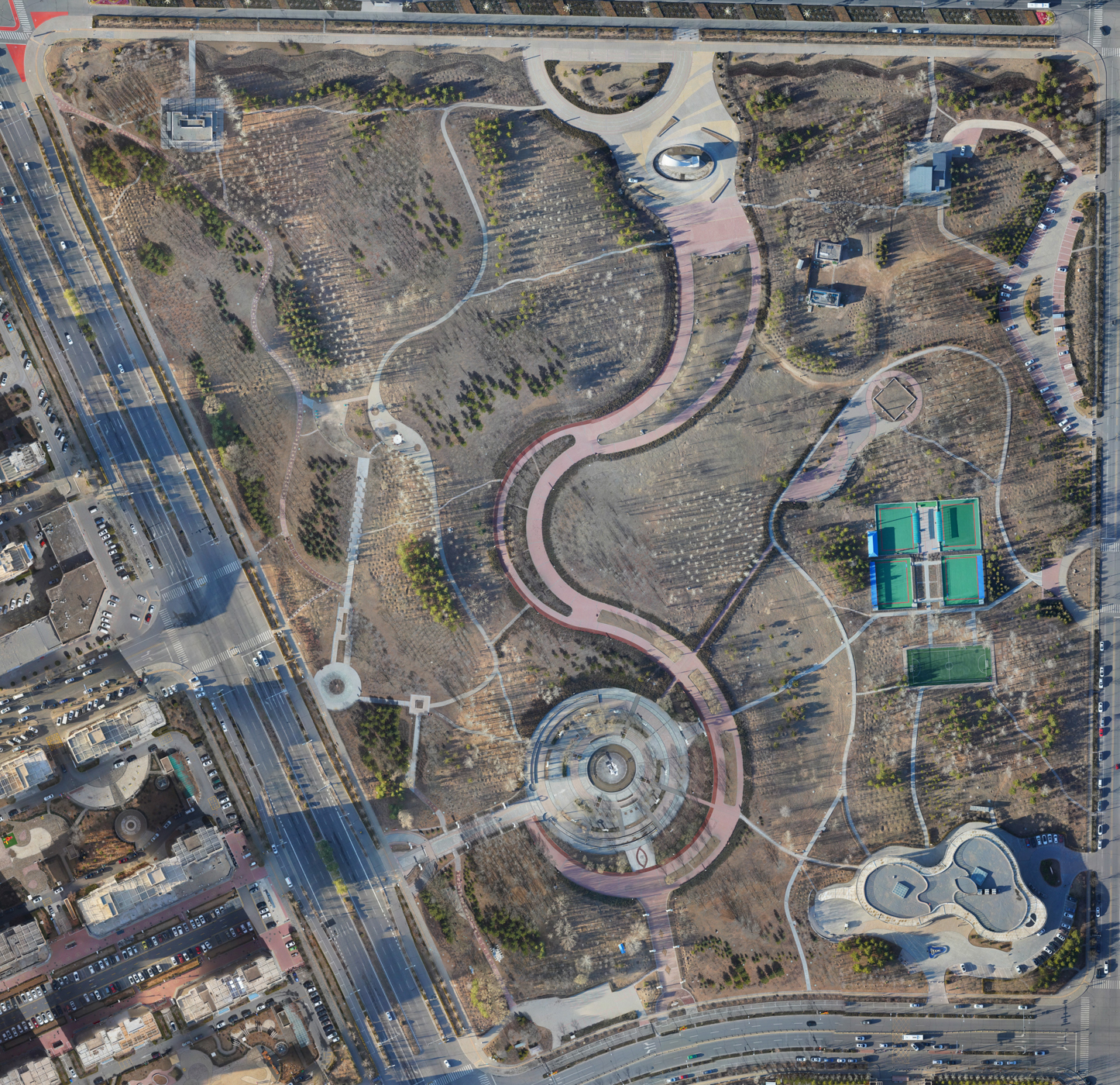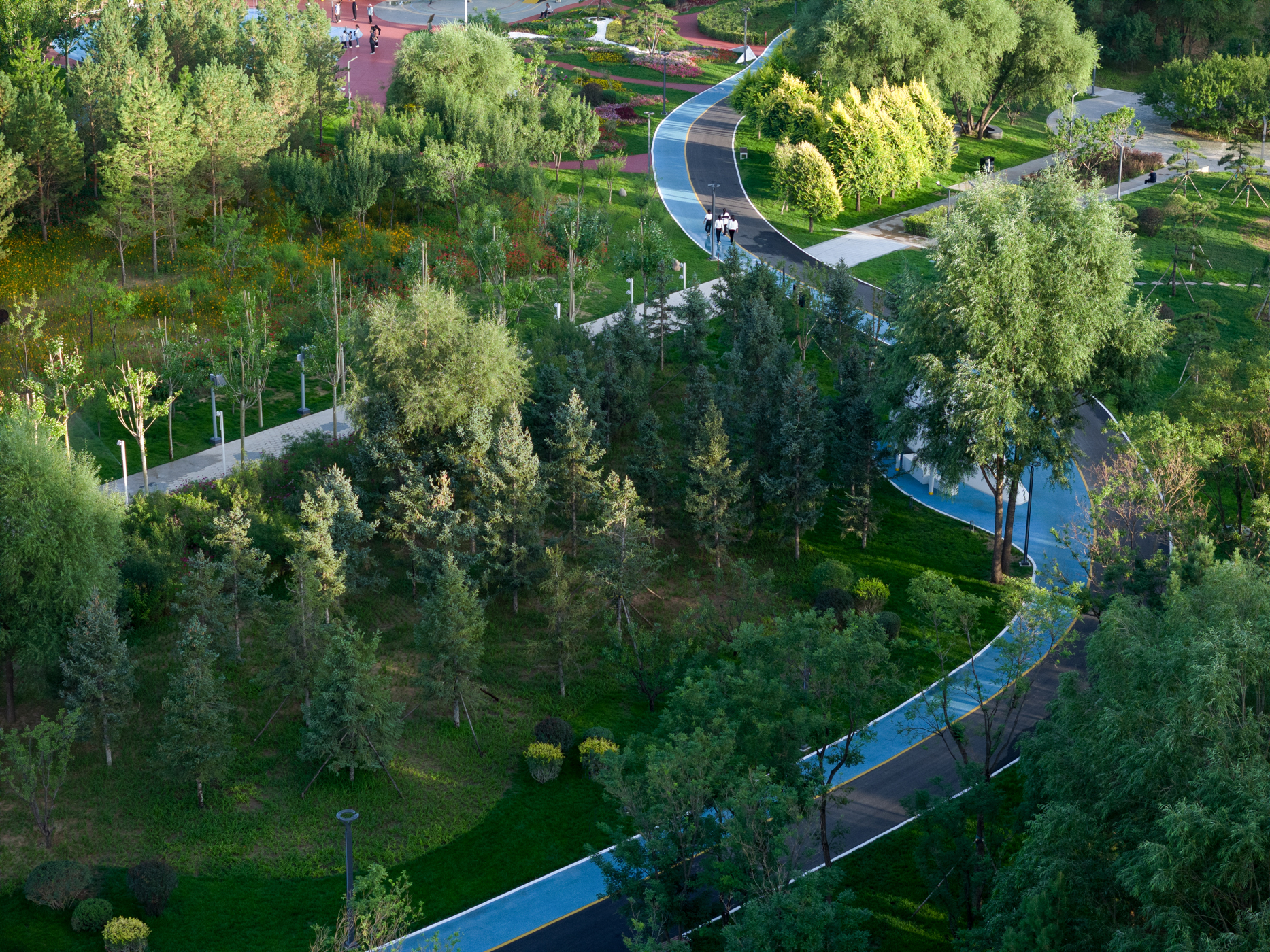 PLAT ASIA is designated to renovate an urban square, "SHIJIE" in Kangbashi District, Ordos, China, into an all-people-friendly smart sports park to satisfy the necessity of increasing seeks for a healthy lifestyle using the public place. The new sports park includes a comprehensive ball court area, three runways, a gate-ball area, a kids' playground, a landscape architecture integrated with a rooftop lookout, and the park's management service center. Designers take the sand as structure, grassland as the ground, rivers as the circulation, call back the memory in the place and make the park belong to locals. The comprehensive playground takes people together to exercise and communicate, activating a vigor for the city. The landscape mainly keeps the character of woodland pasture in the Ordos, allowing some human-scale leisure activities in the grassland, such as camping, a popular lifestyle nowadays. Landscape designers keep the original tall arbor trees well-growing and remove the dense and messy bottom bush that obstructs the sight of open surroundings. This transparent landscape layer keeps a connection with people and nature. Plant new native species with original Populous alba, Pinus sylvestris, and Salix matsudana to grow a local plant ecosystem. The shading system keeps one design language. Besides the natural tree shelters, membrane structure pavilions are posited in different places and spaces, support a comfortable rest area along the tracks, and encounter space in a walkway to help care for kids, which applies to diverse scenes. Those shelters with curved ridge lines and directions keep out the sun all day and respond to the dunes, especially in Ordos.