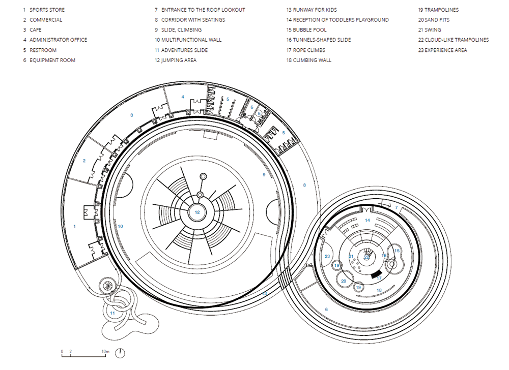 중국 어얼둬쓰에 있는 도심 광장 ‘쉬지에(SHIJIE)’가 전국민적인 스마트 스포츠파크로 개조되어, 시민들의 건강한 라이프 스타일에 대한 욕구를 충족시키는 공간으로 새롭게 태어났다. 스포츠파크는 종합 구기장, 3개의 활주로, 게이트볼, 어린이 놀이터, 옥상 전망대와 통합된 조경, 공원 관리 서비스 센터 등을 포함하며, 어얼둬쓰의 독특하고 자연과 공존하는 풍경을 공간적인 경험으로 전환시키는 장소가 되었다. 건축가는 모래를 구조물로, 초지를 땅으로, 강을 순환물로 삼아 그 장소에 있는 기억을 상기시키고 공원을 지역 주민들의 것으로 만들었다. 어얼둬쓰 스포츠파크는 사람들이 함께 운동하고 소통하기 위해 모이며 도시를 위한 활력을 불어넣는다. 어얼둬쓰의 지역 생태계와 삼림 목초지의 풍경을 즐기면서 요즘 인기 있는 여가 생활인 캠핑도 가능하다. 디자이너들은 기존의 키가 큰 식목 나무를 잘 자라게 유지하고 개방된 환경의 시야를 방해하는 빽빽하고 지저분한 바닥 덤불을 제거하며 풍경이 사람과 자연 사이가 연결될 수 있게 한다. 뜨거운 햇빛을 막는 차양막은 자연 나무 쉼터 외에도 막 구조의 정자가 곳곳에 배치되어 편안한 휴식 공간을 제공하며, 아이들을 돌보는데 도움을 준다. 곡선 지붕을 가진 쉼터들은 햇빛과 어얼둬쓰의 모래 바람을 막아준다.