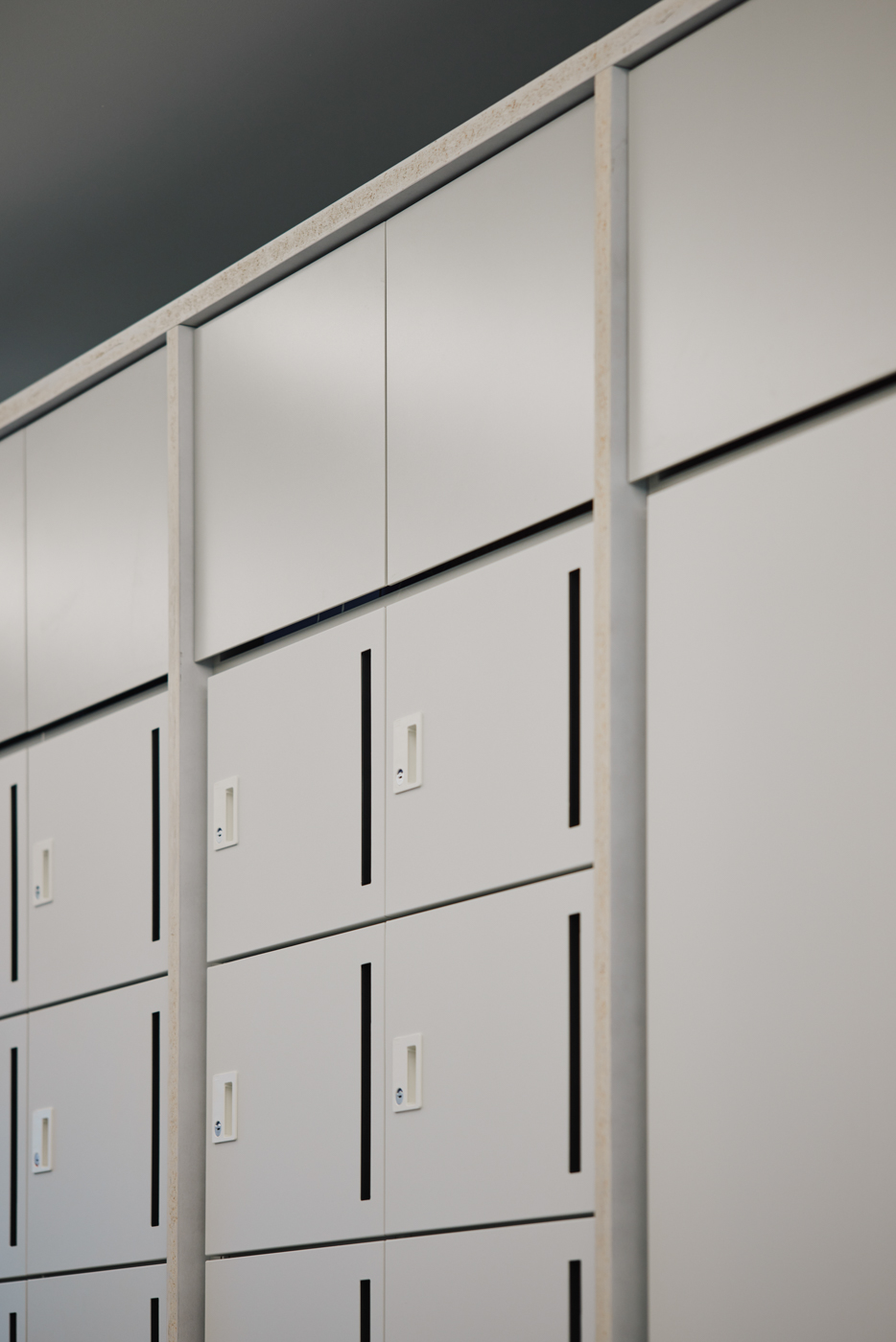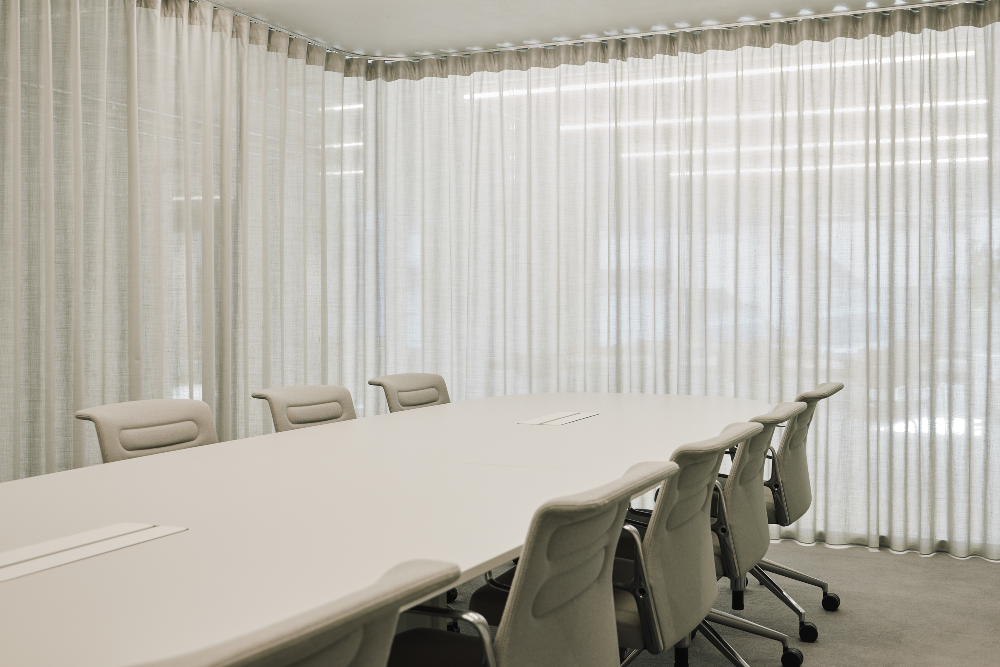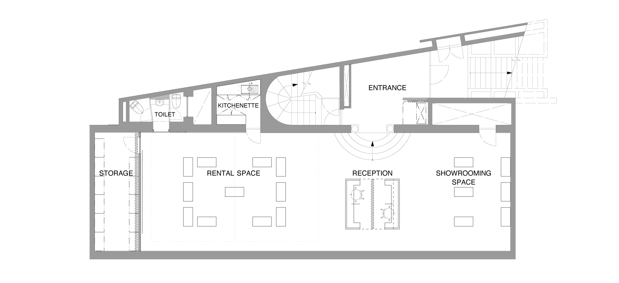 출입구는 2개로 하나는 쇼룸과 임대공간이 위치한 지하 1층, 다른 하나는 방문객과의 만남이 이루어지는 1층에 있다. 남쪽에 입구가 있지만 주변에 건물이 많아 상층부가 더 자연광을 받는다. 지하층은 화강암으로 되어 있고 자연광을 받지 않는다. 독특한 분위기의 바닥을 유연하게 사용할 수 있도록 입구 앞에 커튼 레일을 설치하여 커튼으로 공간을 분리하였다. 핵심 색상은 은색으로 모든 용도에 적합하지만 무거운 분위기를 만들지는 않는다.