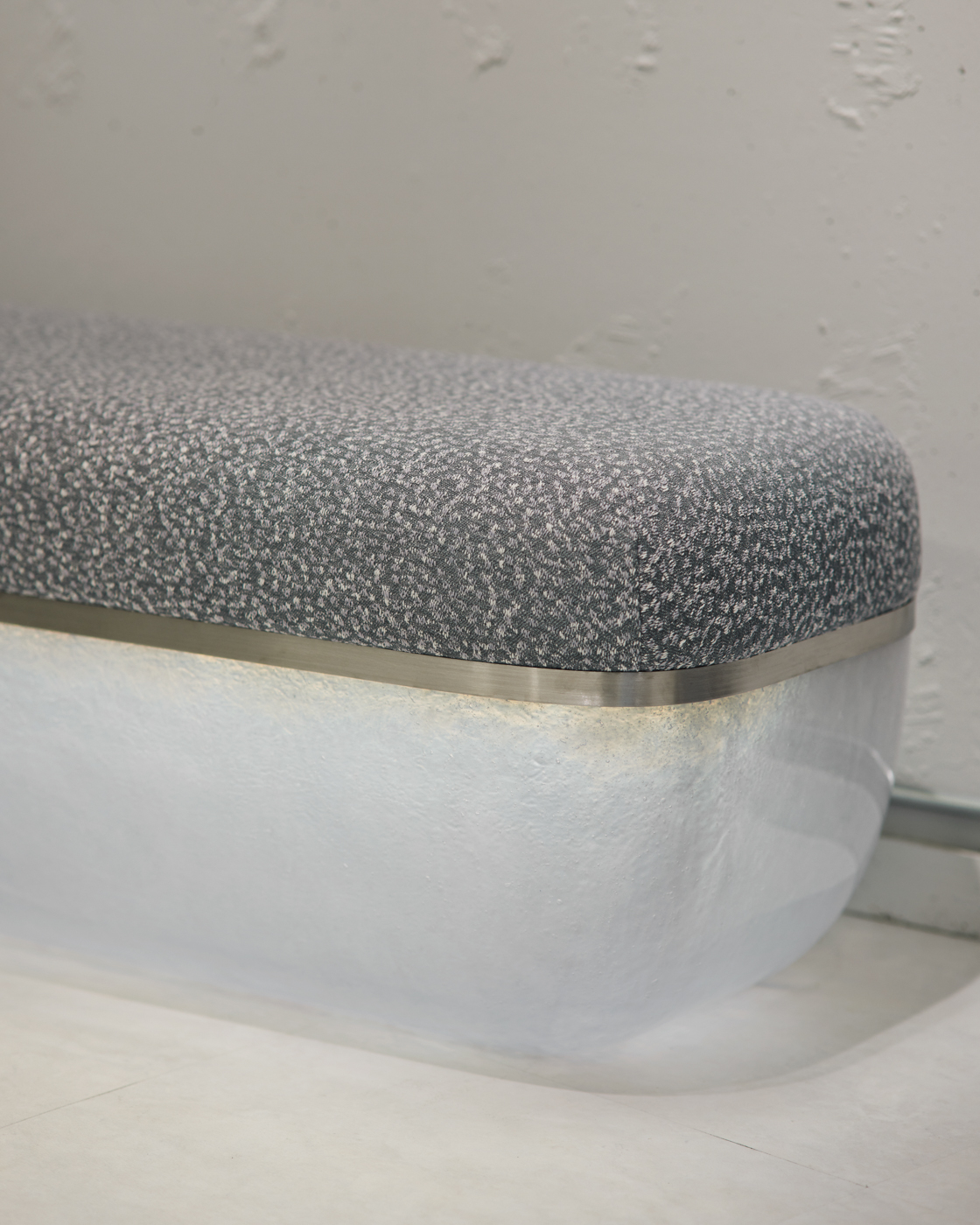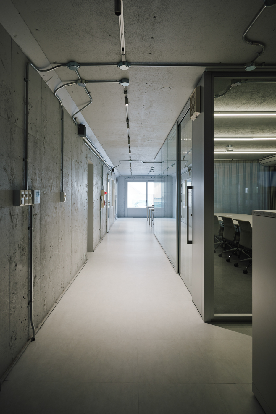 출입구는 2개로 하나는 쇼룸과 임대공간이 위치한 지하 1층, 다른 하나는 방문객과의 만남이 이루어지는 1층에 있다. 남쪽에 입구가 있지만 주변에 건물이 많아 상층부가 더 자연광을 받는다. 지하층은 화강암으로 되어 있고 자연광을 받지 않는다. 독특한 분위기의 바닥을 유연하게 사용할 수 있도록 입구 앞에 커튼 레일을 설치하여 커튼으로 공간을 분리하였다. 핵심 색상은 은색으로 모든 용도에 적합하지만 무거운 분위기를 만들지는 않는다.