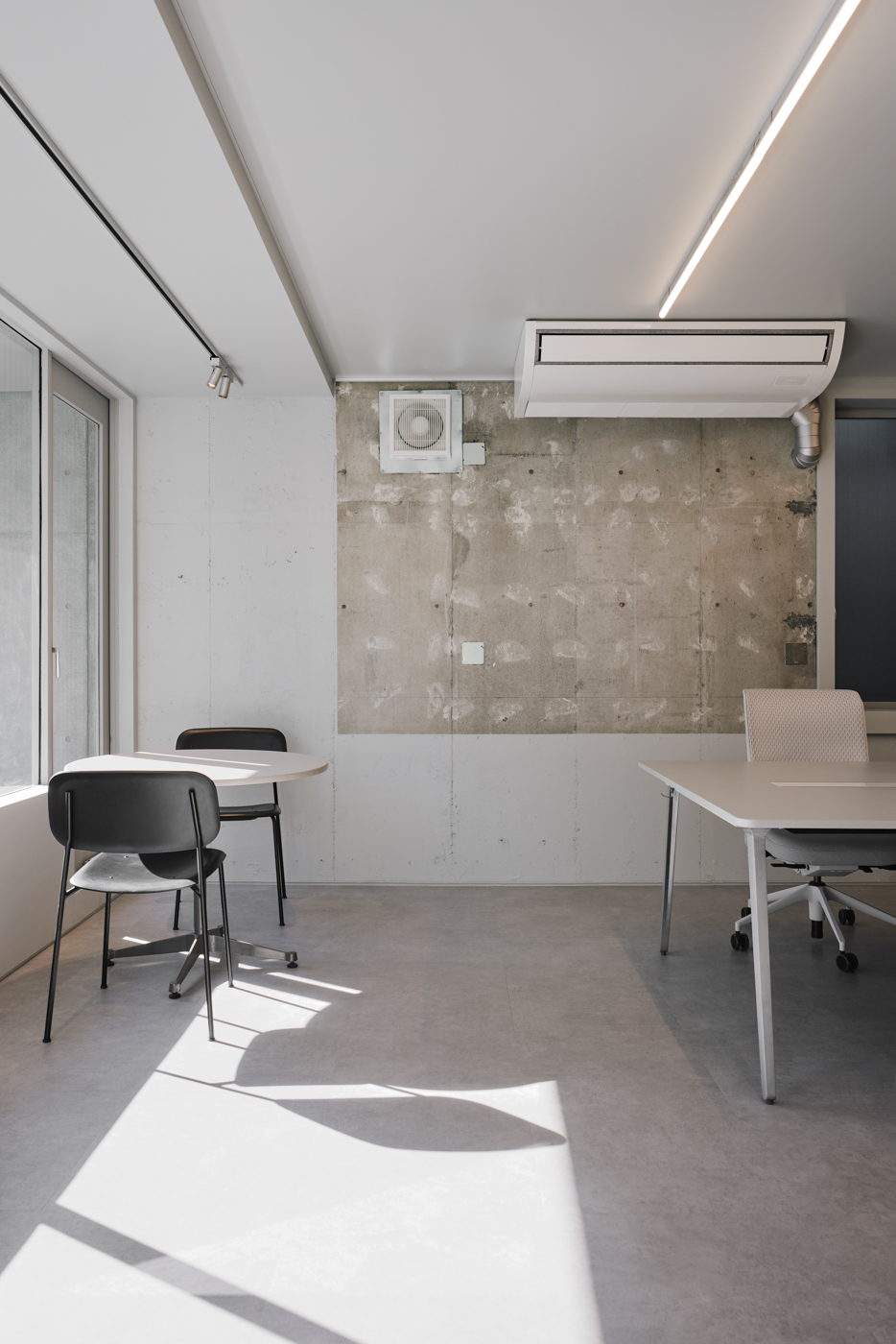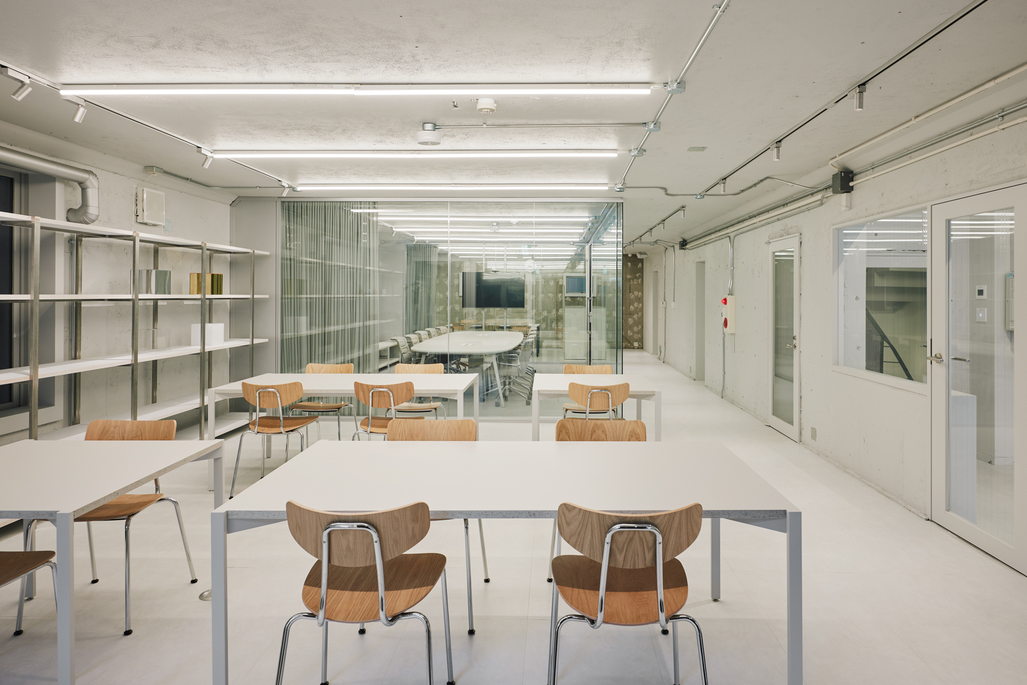 This is an Interior design project for the relocation of the new office building of KYOYA Corporation which is a long-established company founded in 1928 that provides promotion, interior design, and display services. This project site is located in an area dotted with fashion brand offices, a short walk from JR Harajuku Station in the Sendagaya direction. The project utilizes an existing building with one basement floor and three stories above ground. The building was originally a vocational school, and was converted into office space, showroom and rental space.