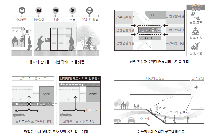 자동차를 비롯한 탈것은 단순한 이동 수단에서 이동 수단의 이동 방법을 연결하는 통합서비스로 변화하고 있다. 이에 따라 복합환승주차장 역시 그에 맞는 맞춤형 계획이 필요했다. 남양주시 다산역 복합환승주차장이 지역사회를 연결하는 친환경 공유교통서비스의 거점 역할을 수행할 수 있도록 사용자 중심 디자인과 자산관리공사 위탁운영의 두 가지 관점으로 바라봤다. 그리하여 기능성, 공공성 및 연계성, 수익성을 모두 아우를 수 있는 건축적 해법을 모색했다. 먼저 주차장의 특성과 기능을 고려한 최적의 주차 공간을 계획했다. 주차의 효율성을 고려해 기준층 주차대수를 최대 41대 확보하였고, 효율성 및 안전성을 위해 6.5m 이상의 주차 통로와 7.5m 이상의 램프 폭, 6.5m 이상의 회전 반경을 확보했다. 또한 보행자 안전성 확보를 위해 모든 주차 후면부에 보행 통로를 확보하여 교행을 방지했다. 다음으로 상가와 공원, 다산역 등과 연계하여 공공성을 확보하였다. 선큰 공간의 제안은 다산역과의 연계성을 고려했고, 공원 및 광장과 연계한 입체식 동선체계 구축으로 접근성을 강화했다. 루프탑 특화와 환승주차장 전용 커뮤니티 라운지 공간의 구축은 이용자의 편의성을 고려한 것이다. 마지막으로 접근이 용이한 저층 근린생활시설 조닝 및 동선 계획으로 수익성을 확보했다. 근린생활시설을 지하 1층, 지상 1층과 2층에 집약적으로 배치하여 수익성을 고려하고, 접근이 용이한 별도의 입체식 동선체계로 저층부 근린생활시설의 활성화를 도모했다. 각 층에는 퀵커머스 플랫폼, 공유교통 플랫폼, 커뮤니티 플랫폼 등 층별 특화 공간을 계획하여 근린생활시설이 더욱 활성화될 수 있도록 의도했다.