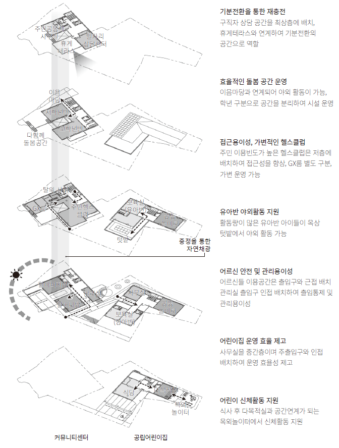 각 시설들은 사용자의 성격을 반영하여 위치를 선정했다. 거동이 불편한 어르신들은 접근이 용이한 1층에 공간을 마련하고, 돌봄 공간은 이음마당에서 외부 활동이 가능한 위치 자리한다. 주민이용빈도가 높은 헬스클럽은 저층, 구인자 상담 공간은 최상층에 배치하고 휴게테라스에서 기분전환의 시간을 갖을 수 있도록 배치했다. 어린이집 유아반은 텃밭 활동을 할 수 있는 위치에 배치했다.