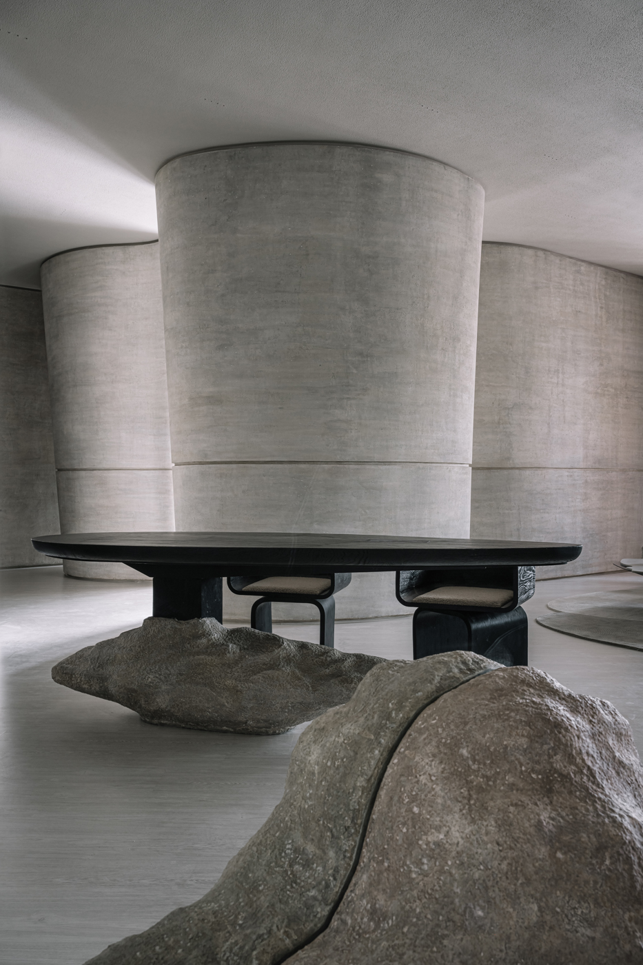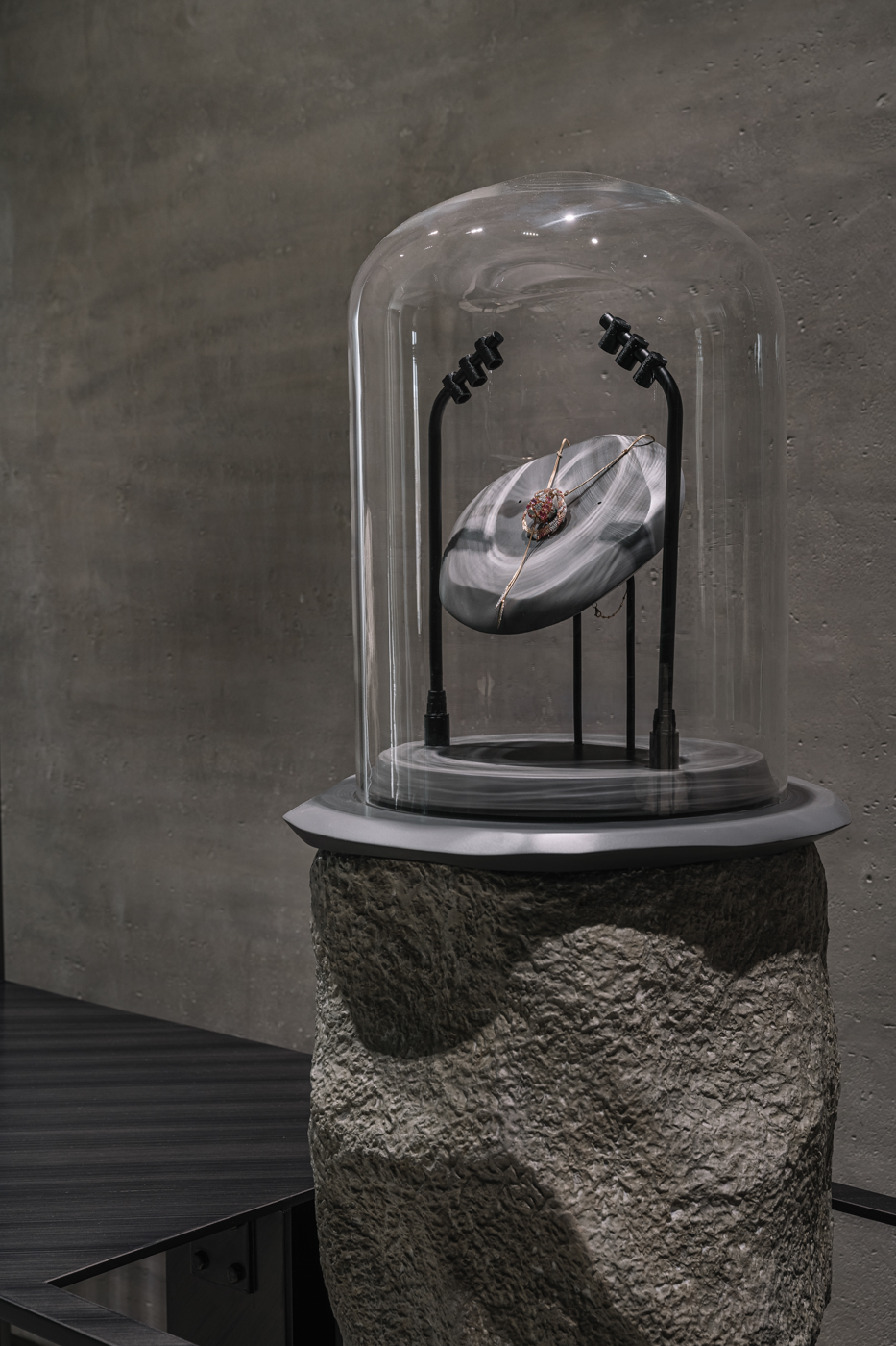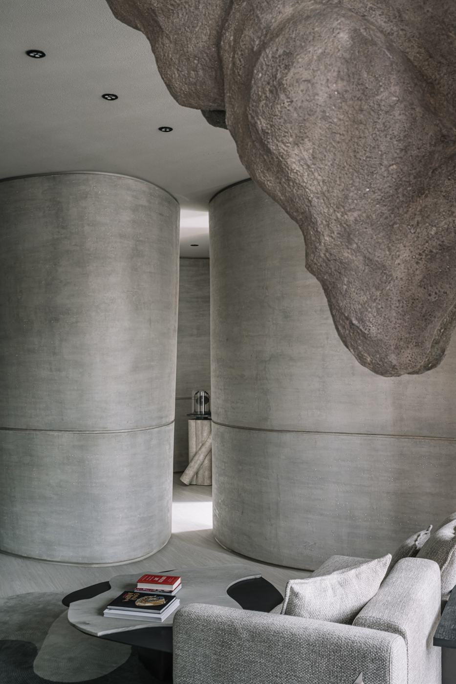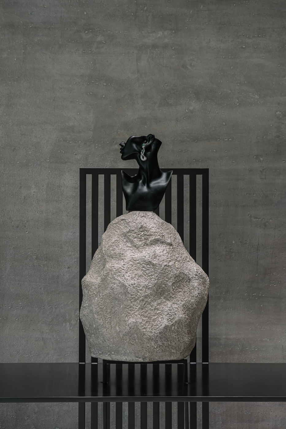 The interior architecture of the boutique takes inspiration from stone caves, adopting a minimalist approach. Sculpted, fluid walls and strategic lighting are used to create a space that feels uncluttered and organic. The walls are covered with a bespoke texture that resembles travertine stone. The display elements in the boutique are inspired by raw rock formations and are custom-made from metal, fiberglass, and glass. To break up the textures, the lounge area features soft carpets, plush upholstery, and a mirror with rock details attached. Every aspect of the boutique, from the plinths to the furniture and décor, was designed and executed in-house.