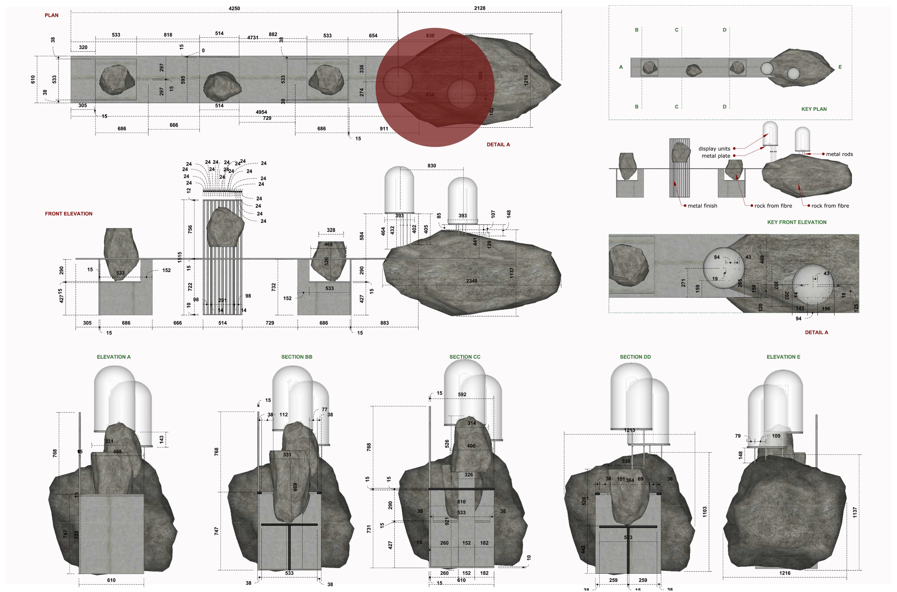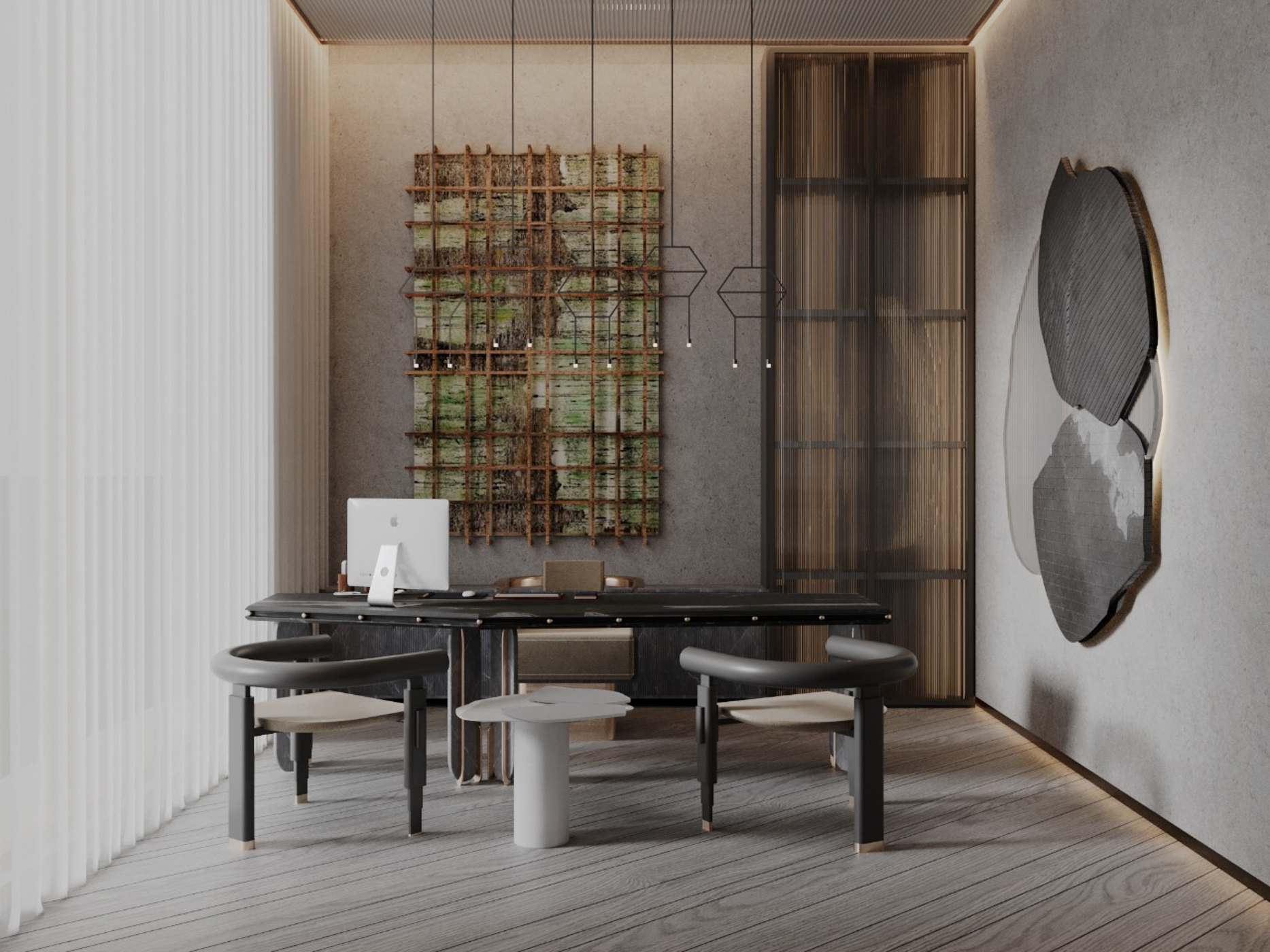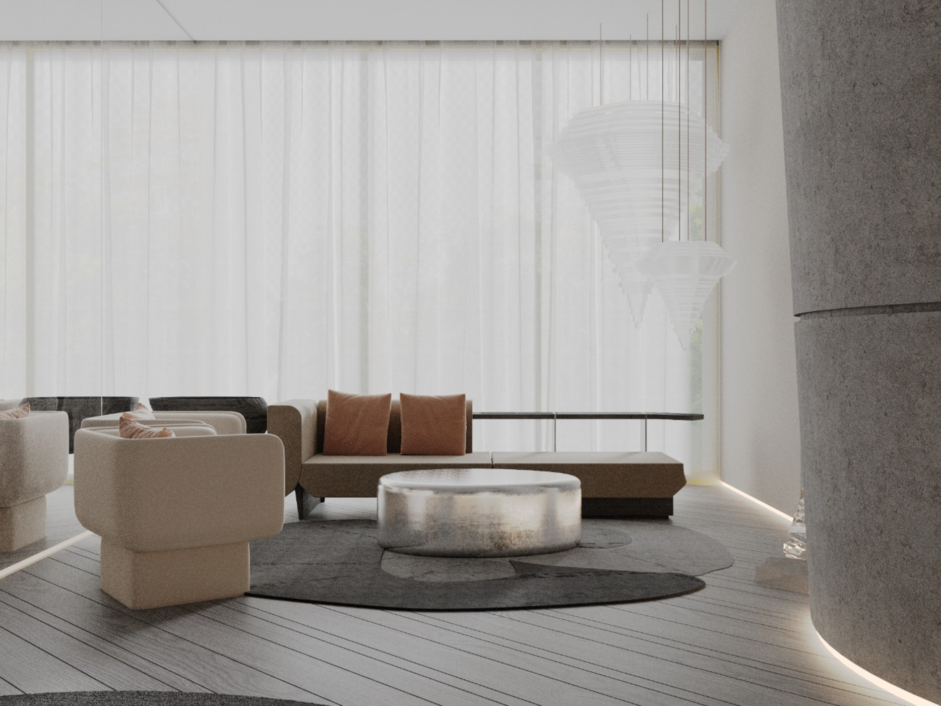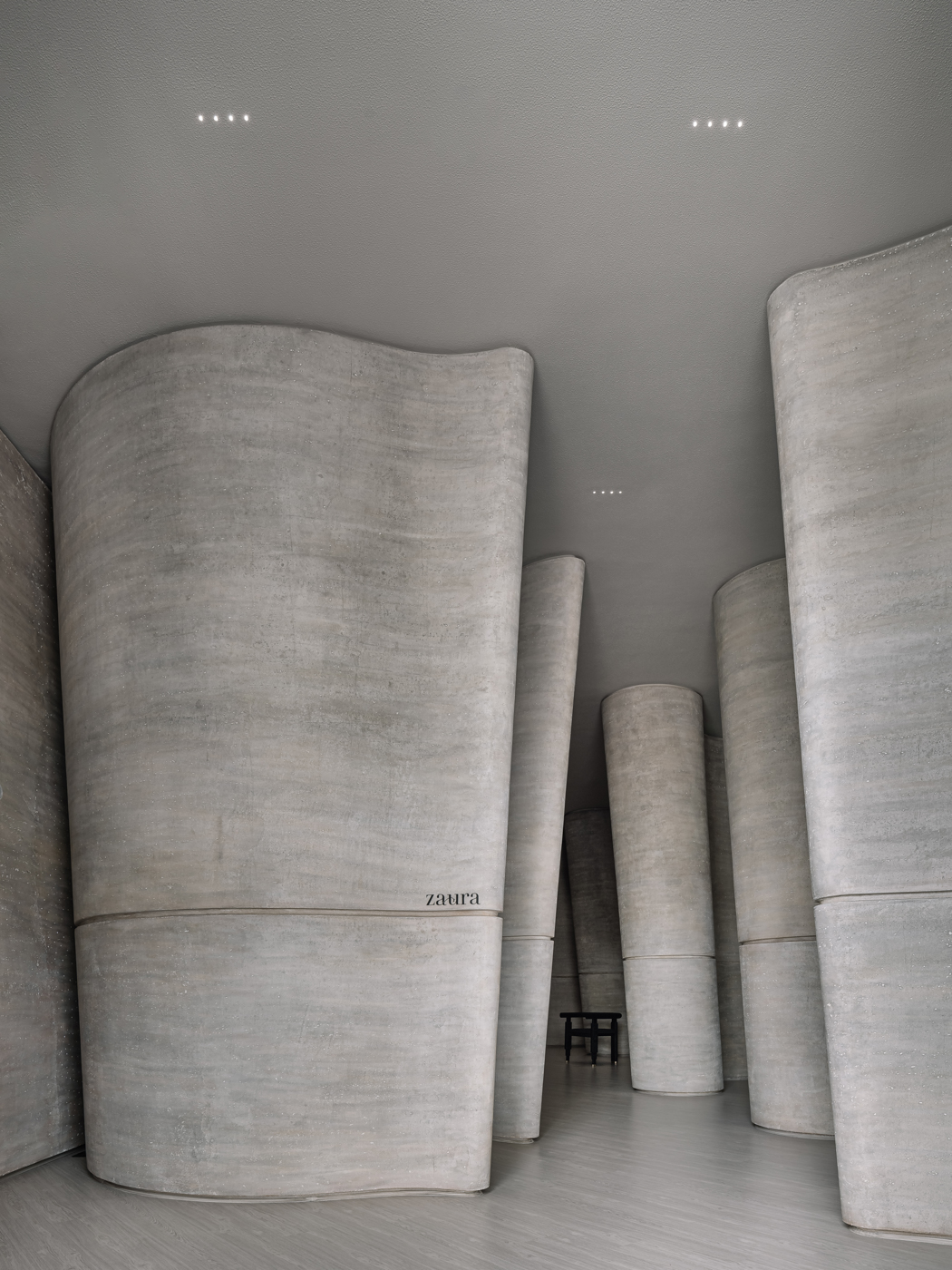 The interior architecture of the boutique takes inspiration from stone caves, adopting a minimalist approach. Sculpted, fluid walls and strategic lighting are used to create a space that feels uncluttered and organic. The walls are covered with a bespoke texture that resembles travertine stone. The display elements in the boutique are inspired by raw rock formations and are custom-made from metal, fiberglass, and glass. To break up the textures, the lounge area features soft carpets, plush upholstery, and a mirror with rock details attached. Every aspect of the boutique, from the plinths to the furniture and décor, was designed and executed in-house.
