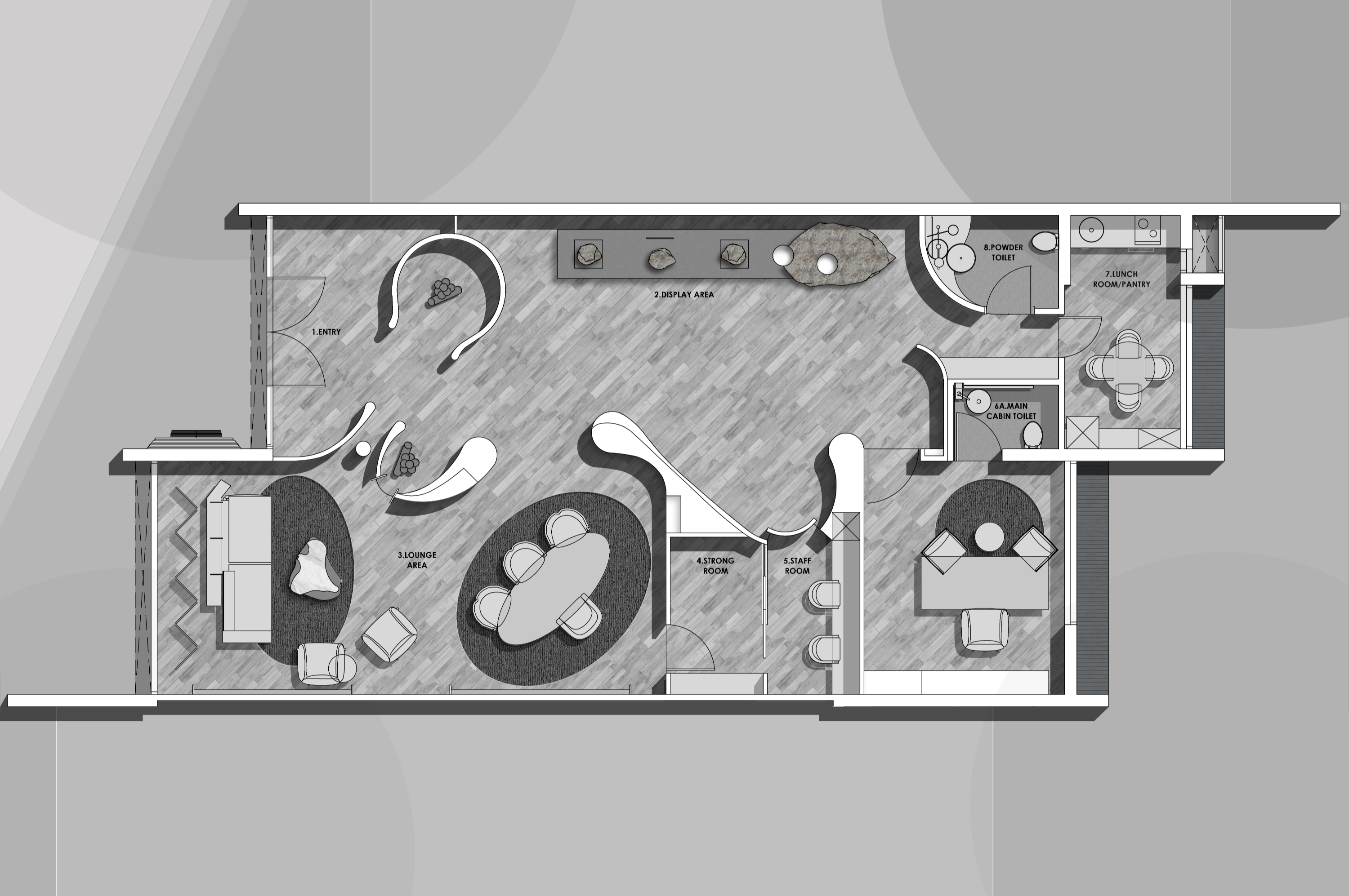 R+R 아키텍트는 자연에서 영감을 받은 요소들로 멋진 보석 부티크를 디자인했다. 부티크는 1층에 위치해 있으며 1600평방피트에 걸쳐 있다. 매장 내 라운지 공간과 쇼 공간이 구분되어 고객들이 원활하게 이동할 수 있도록 세심하게 구성했다. 이들 방은 개방된 레이아웃으로 연결되어 있어 넓은 경험을 제공한다.