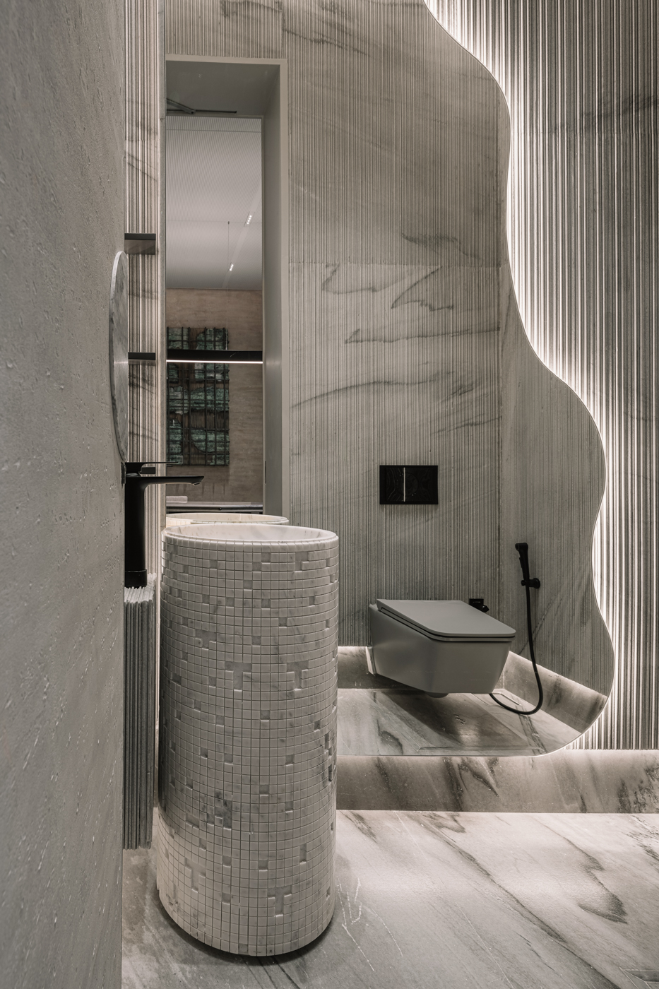 The bathroom in the store combines natural shapes, intricate stone, and soft lighting to enhance the materials and maintain the store's overall organic atmosphere. The goal was to design an interior that exceeds mere display purposes, instead, guiding customers on an immersive and ongoing experience.