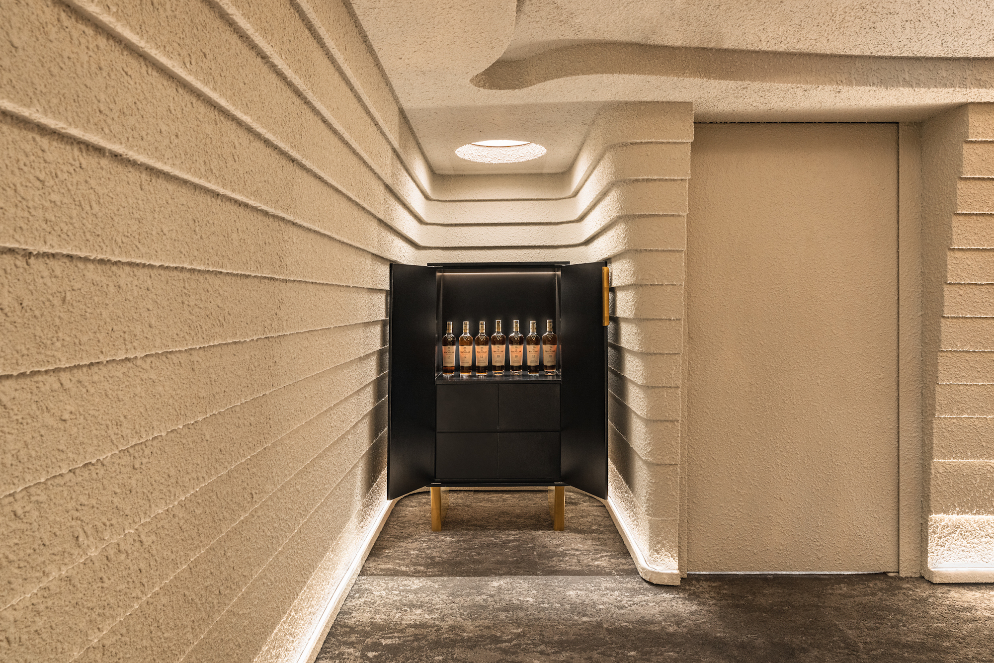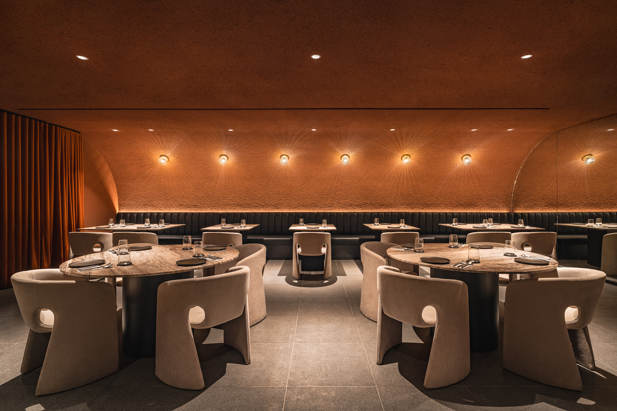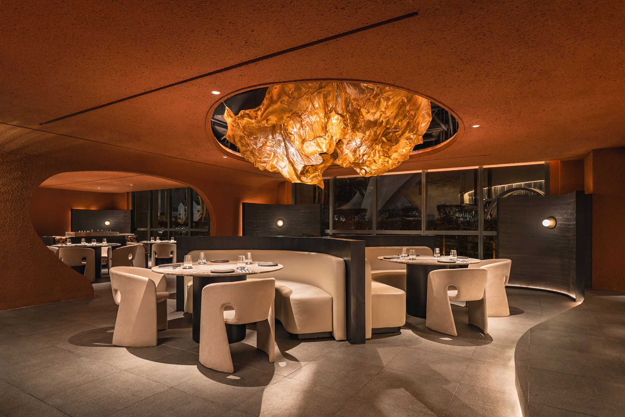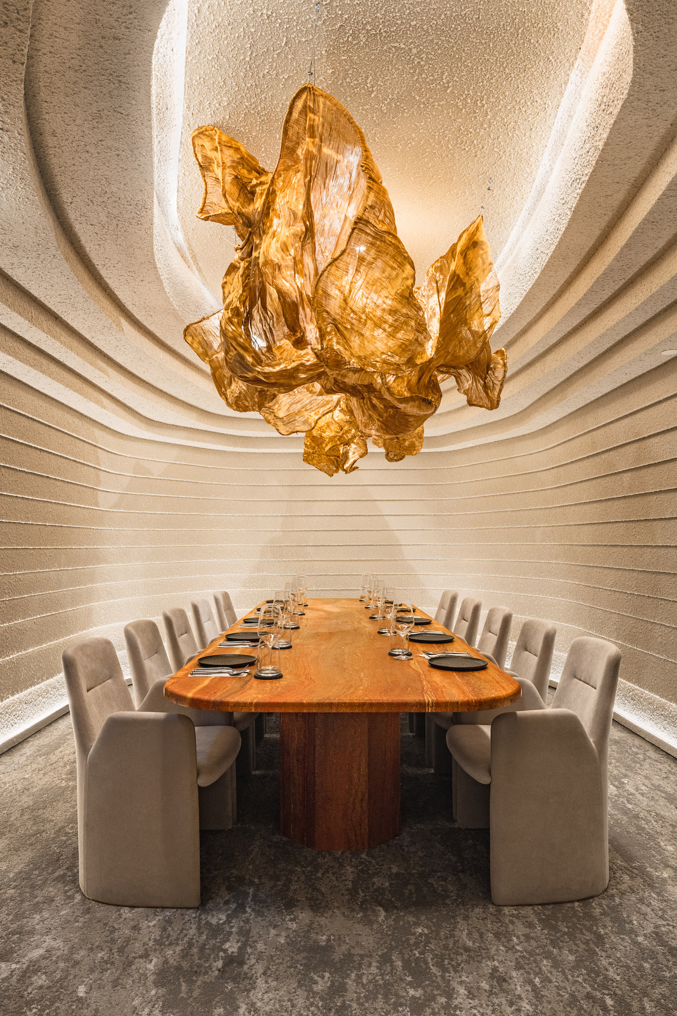 The two main features of the space, a circular bar counter constructed out of red travertine and a plush banquet sofa seating area, anchored by a fiery gold metal mesh sculpture are both abstract interpretations of the elemental force of heat and fire. For those seeking an interactive dining experience, the Chef’s Table offers a U-shaped counter constructed from grey travertine, accommodating up to 20 guests eager to engage with the chefs and witness the primordial style woodfire cooking up close. The private dining room transports diners into a cocoon-like sanctuary, drawing inspiration from the organic contours of a cave, with cascading layers and a floating fire mesh sculpture above a striking red travertine dining table.
