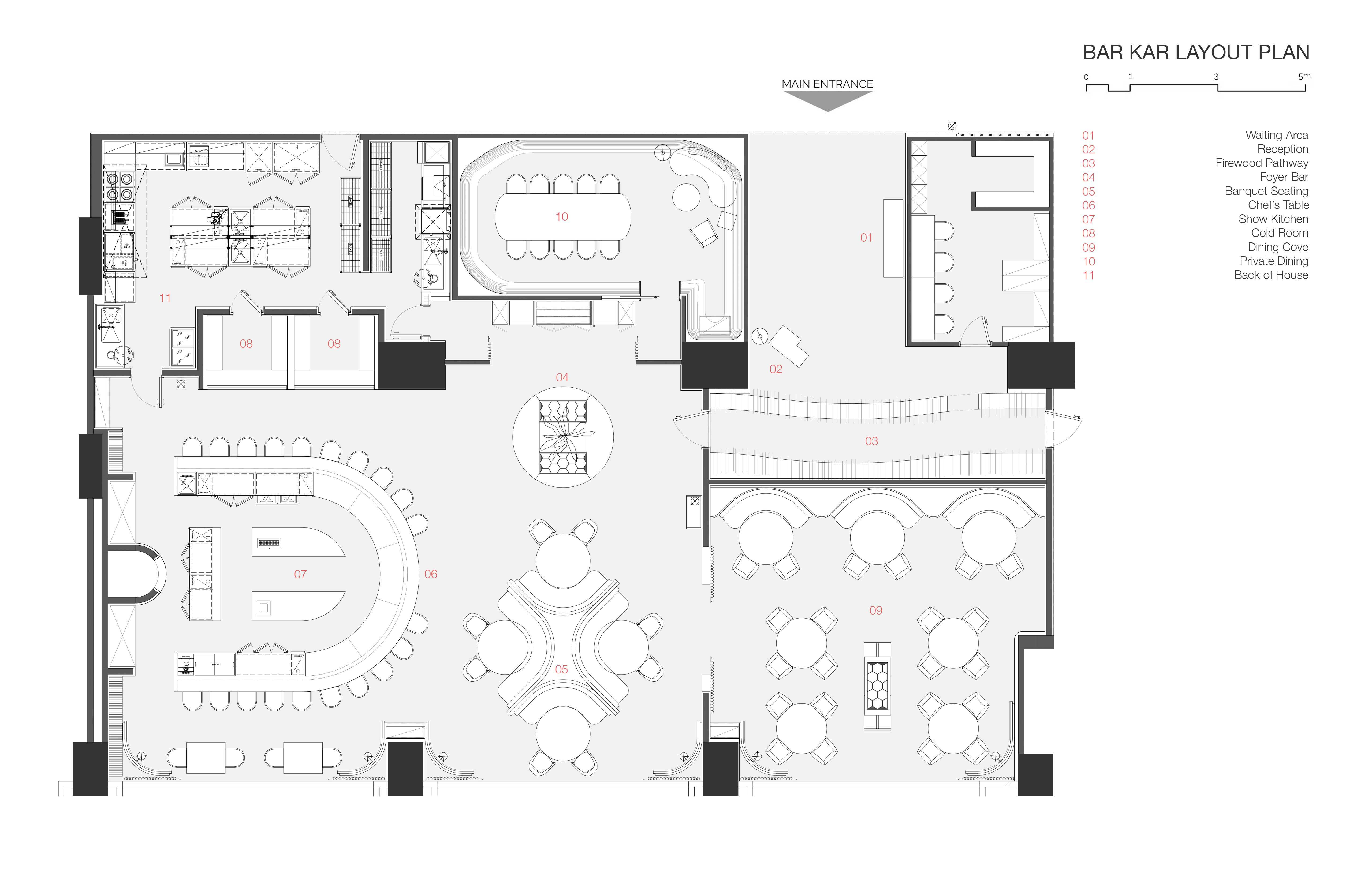 Bar Kar is an immersive wood-fired restaurant that revolves around the concept of primordial community cooking. With wood as the focal point guests are first ushered through a pathway lined with actual firewood and inside, the cavernous interior was inspired by the ancient earth oven pits which in primordial times were used to cook and smoke food in the ground. A circular Chef’s Table allows customers to be up close with the chefs to interact and experience the cooking journey.