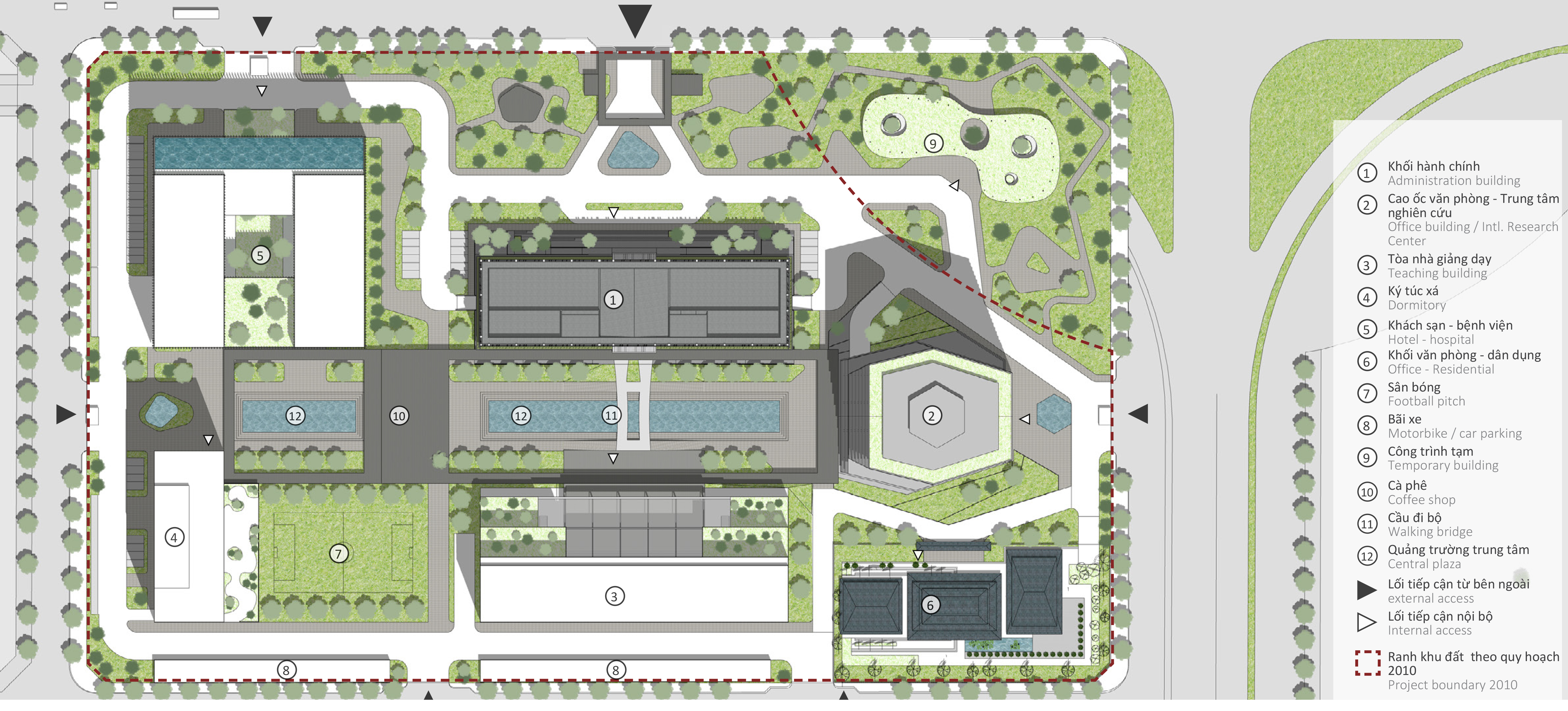 따라서 DE-SO Asia는 기본적인 볼륨과 본래 내부 레이아웃을 그대로 유지하면서 건물의 정면을 완전히 새롭게 재설계했다. 이 프로젝트의 주된 특징인 건물을 둘러싸고 있는 복도를 개방하여 야외 통로를 만들어 자연적인 순환이 이루어지게 하고 편안함을 주는 동시에 유지 관리 비용도 절감시켜준다. 대학 캠퍼스 전체에 대한 마스터 플랜과 향후 주변의 다른 프로젝트의 개발을 위한 제안을 위임 받았다.
