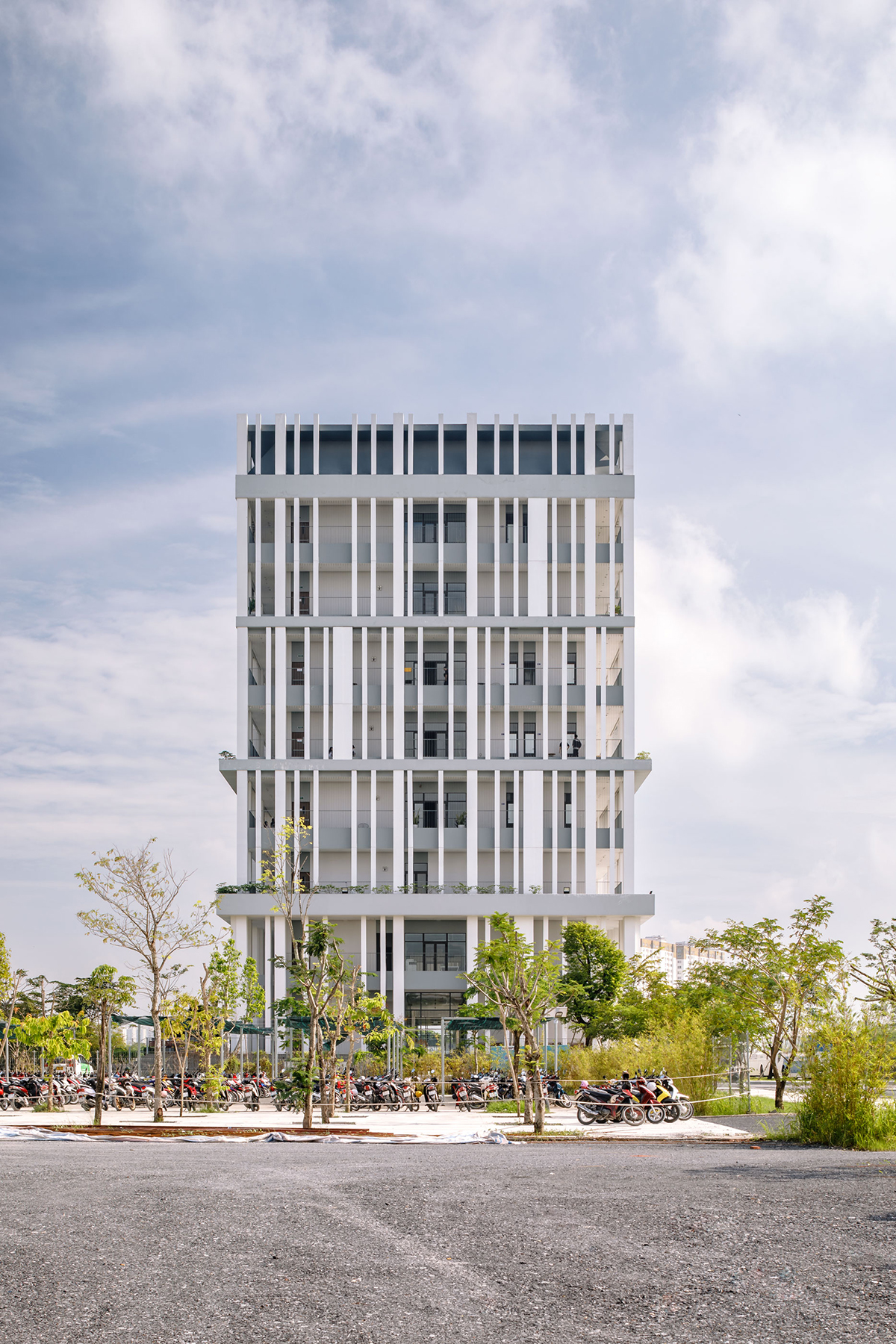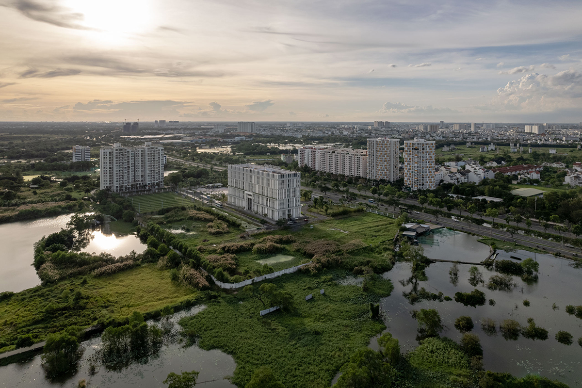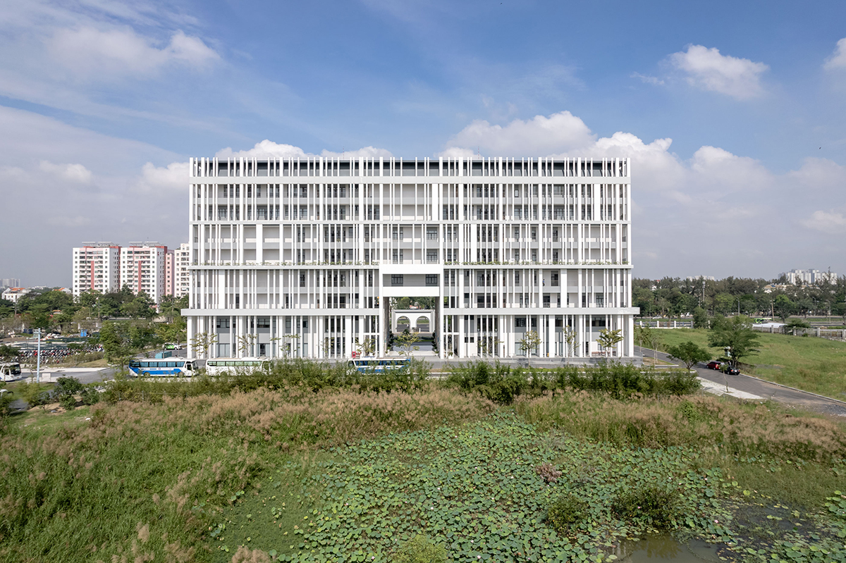 수직형 필터는 책장에 꽂힌 책들처럼 자유롭게 배열되어 있다. 필터의 이중 높이는 건물 외부의 볼륨 비율을 변형시켜 건물을 눈에 띄게 해준다. 다양한 크기의 필터와 통로에 드리워진 그림자의 변화는 외관에서 보여지는 리듬감을 더욱 돋보이게 해준다. 내부 교실의 파사드는 필터가 없어 비와 태양으로부터 보호될 수 있고 유지관리가 쉽다. 교실 벽은 베트남 어선의 색상과 메콩 삼각주의 가정에서 볼 수 있는 청록색에서 영감을 받았다. 이 컬러는 Hung Hau 그룹의 브랜드 아이덴티티를 표현하는 컬러이기도 하다. 태양 리듬에 따라 변화하는 통로는 통풍과 그늘져 있어 하루 종일 생활 활 수 있는 공간이 된다. 높은 난간과 팽팽한 케이블이 잘 보호 해준다. 시끄러운 실내 복도 대신에 이러한 개방형 복도는 학생들이 방과 후에 모일 수 있는 보다 조용한 분위기를 제공해준다.
