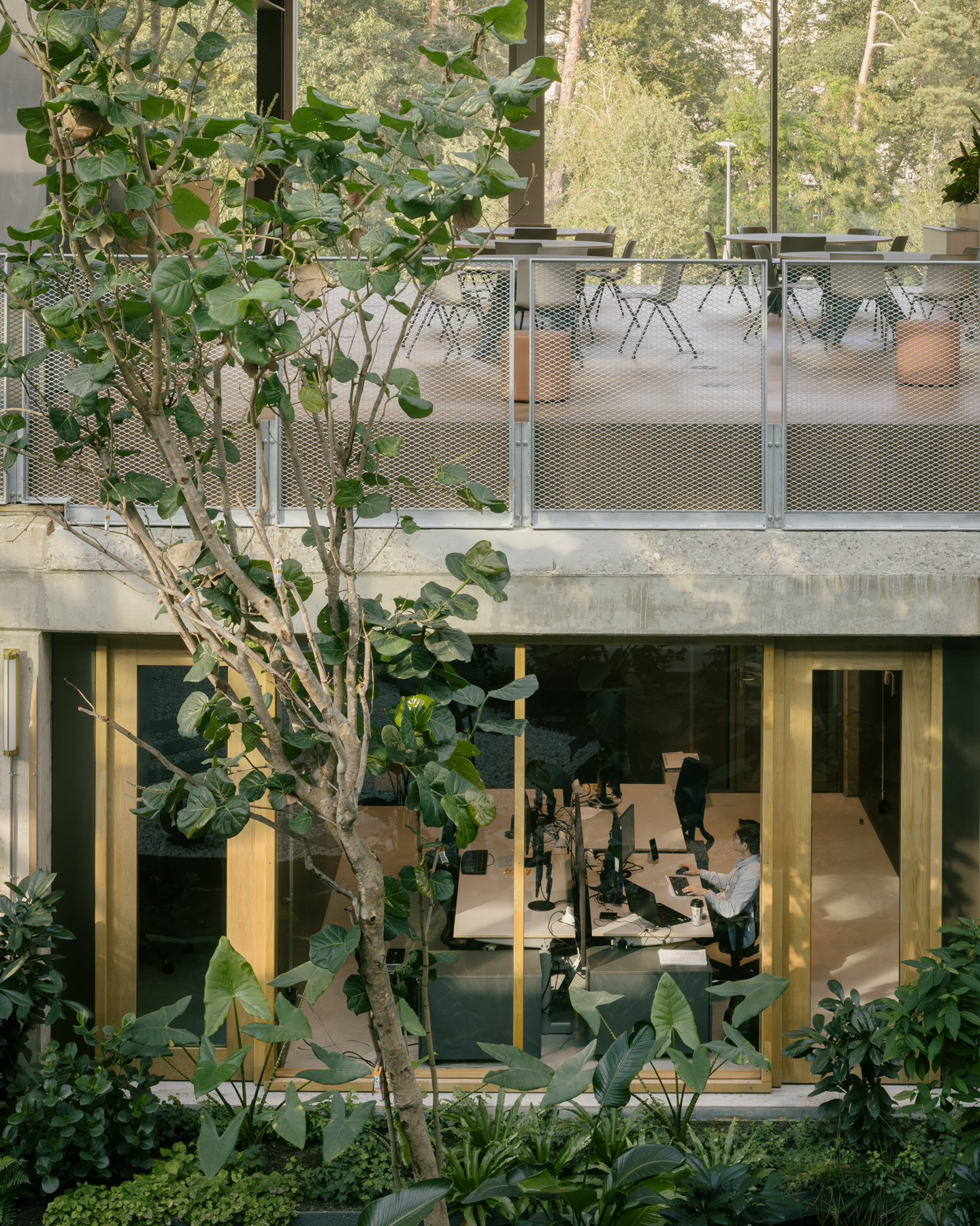 Each person has different needs and preferences, and the building offers various types of spaces, ranging from dynamic to quiet. The floor heights and the atmosphere of the existing building naturally determined the basic distribution. Smaller offices are on the lower floor with a lower ceiling, while larger spaces - education, the restaurant, the 'study and learning center' - are on the upper floor. Open study areas are located near the green atria. The contact with landscape, light, and air make these spaces ideal for collaboration and knowledge sharing. Work happens in enclosed spaces and rooms that prioritize privacy and concentration. A good room acoustic is guaranteed with an acoustic ceiling and upholstery in the interior.