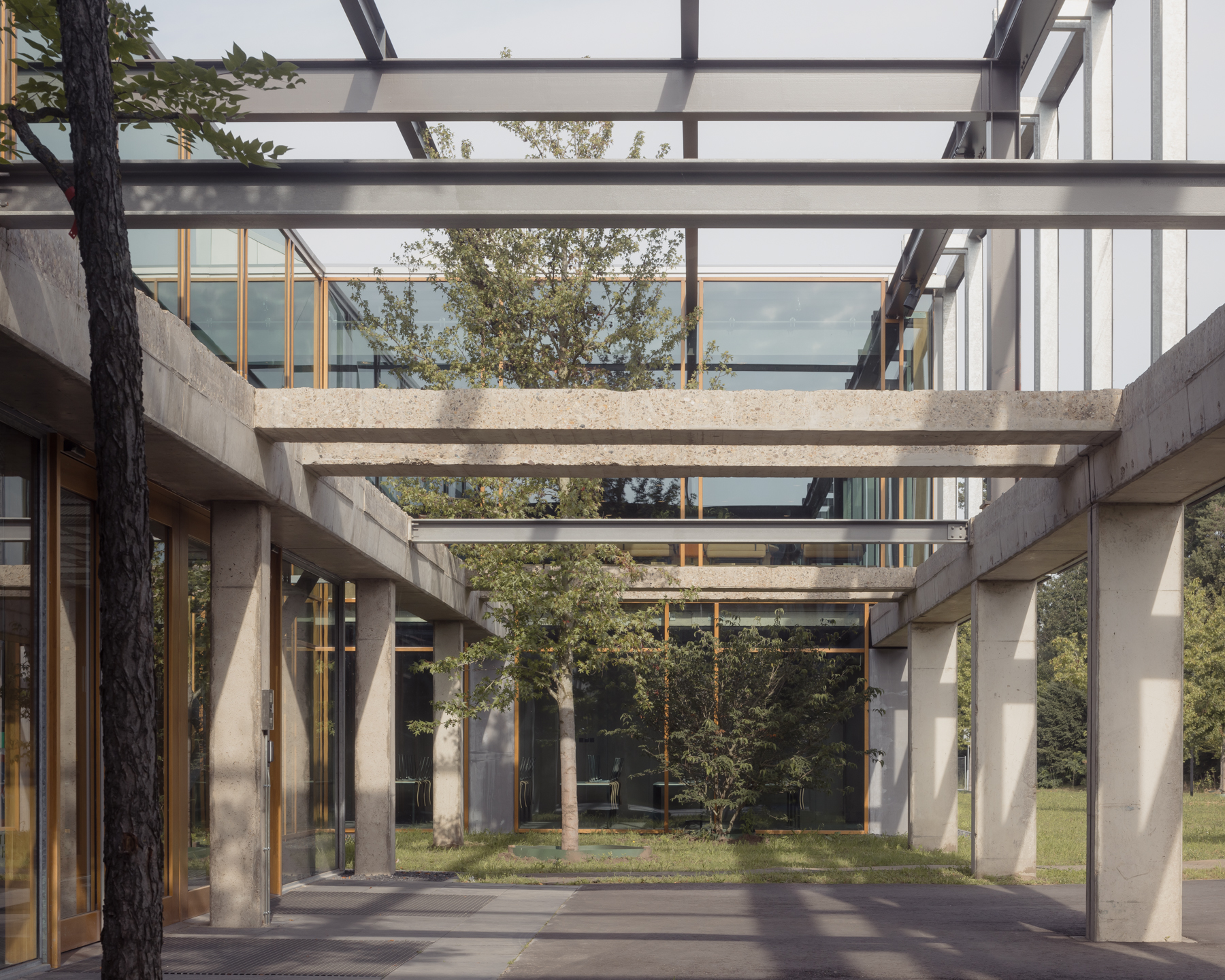 The design focuses on reusing the existing structure. Walls, stairs, facades, and the roof structure of the atria - all new elements are placed on or hung from the existing structure and foundation, saving a significant amount of material. The new steel structural parts are thermally galvanized and demountable. For new elements, circular systems and products were deliberately chosen. The interior facades and exterior ground floor facade are made of oak, and the raised floor is made of bamboo. Demountable steel system walls have been selected for partition walls to allow easy adaptation of the building. These have a material-specific bronze color. The parts of the fixed and loose furnishings are detachable. The materials have been used without paint. Even the table bases are not powder-coated.