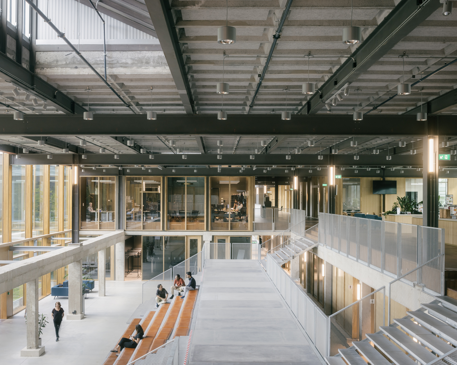 The design bundles the installations for both floors into a single 'air plenum' in the raised floor. This compact clustering of installations keeps the characteristic concrete ceilings in view and maximizes the free height of the ground floor without extra ductwork. Fresh air is introduced at a low speed – and thus high comfort - from the floor, flows into the atria, and is naturally exhausted through the roof. Users can influence the climate directly by opening windows. For part of the year, the building is naturally ventilated. The 'plenum' in the raised floor has no air ducts but directs air directly into the space through floor grilles. This allows for easy relocation of walls and spaces without changing or readjusting the installations. All other installations are accessible by simply lifting a floor tile.