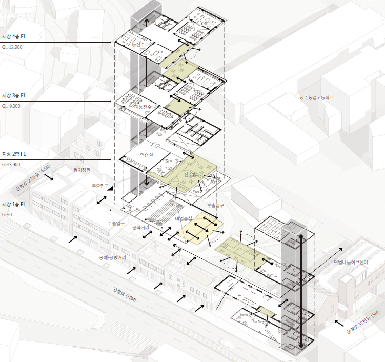 대연습실과 연습실 등 예능전수공간과 전수교육실 등의 전수교육 및 사무 공간의 영역를 수직으로 분리하여 배치했다. 보다 많은 사람들이 방문하고 참여하며 주변으로 열린 공간이 될 대연습실 등이 위치한 예능전수공간을 저층부에 배치하여 주변과의 연계성과 접근성을 확보했다. 기능별로 독립된 영역이 필요한 전수교육 공간 등은 상층부에 배치하여 독립성을 가졌고, 스탠드 마당 등 외부 공간과 공항로의 조망과 남향 채광을 확보했다. 그리고 각 층별/향별로 작은 휴게 공간을 마련하여, 전수교육 및 전시동 이용자들의 소통과 휴식의 공간이 되도록 했다. 각 공간들은 외부 공간과 직접 연결되거나, 스탠드 마당 등 외부 공간을 조망할 수 있는 휴게 및 소통 공간이다.
