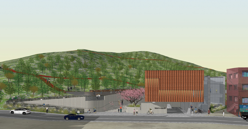 건축물의 재료를 선정하는 과정에서도 주변과 어울림을 위해 주변 지역 건축물의 마감재를 조사했다. 사용 빈도수가 많은 벽돌과 석재를 사용하여 참신하되 두드러지지 않는 모습을 갖도록 신중을 기했다. 또한 인접한 저층 주거지에 일조와 사생활 침해가 일어나지 않도록 건축물이 앉는 방향을 고려하고 계단식 단면을 갖도록 했으며, 지붕에는 저관리형 옥상 녹화 시스템과 태양광 집열판을 설치하여 공원 생태와의 조화 및 친환경적인 건축물이 되도록설 계했다. 완공 후 건축물이 자연스럽게 주변 환경에 녹아들어 지역 사회의 일원이 될 수 있기를 바란다.