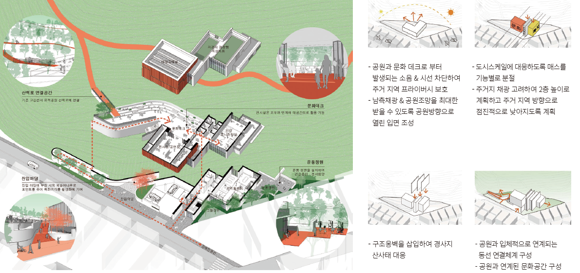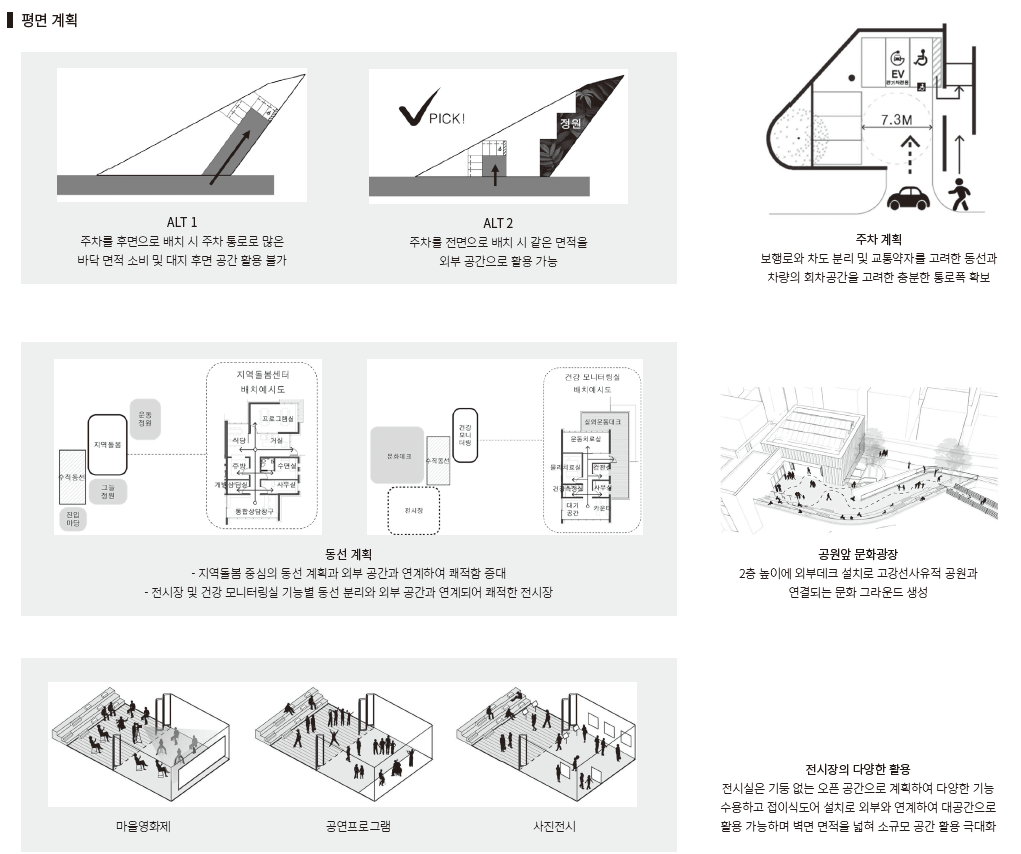 접근이 쉬운 1층에는 지역 노인을 위한 돌봄센터를 배치하고 뒤에 남아있는 여유 공간에 운동과 휴식을 위한 정원을계 획하여 노인들이 신선한 공기를 접하고 외부 활동을 통해 건강을 유지할 수 있도록 고려했다. 2층에는 건강 모니터링실과 청년을 위한 문화공간인 전시 공연장을 배치했다. 문화공간은 공원 산책로와 연계하여 외부에 문화 데크라는 작은 광장을 만들고 문화공간이 완전히 외부와 열려 확장될 수 있도록 계획했다. 전시나 공연 행사가 있는경 우 건물 내외부를 하나로 엮어 행사를 진행할 수 있는 융통성을 고려하고 평상시에는 공원에 산책을 나온 시민들이 쉬어갈 수 있는 휴게소 역할을 할 수 있을 것이다.