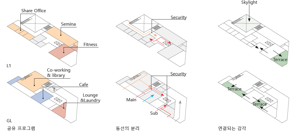 도서관과 co-working 공간을 하나로 묶어 2개층의 열린 공간으로 구성하고 카페와 함께 외부테라스를 이용할 수 있도록 하였다. 입주민도 자연스럽게 공유공간을 거쳐가도록 출입구와 코어를 위치를 조정하였으며, 입주민만을 위한 별도의 전용 출입구를 두어 사용상의 편리함을 더하였다. 입주민 출입구는 작은 마당을 중심으로 커뮤니티 라운지 및 코인세탁실, 무인 택배함을 함께 배치하여 두었다. 2층에는 공유오피스 및 세미나실을 두었으며, 피트니스실은 별도의 외부공간을 사용할 수 있도록 배치하였다.
