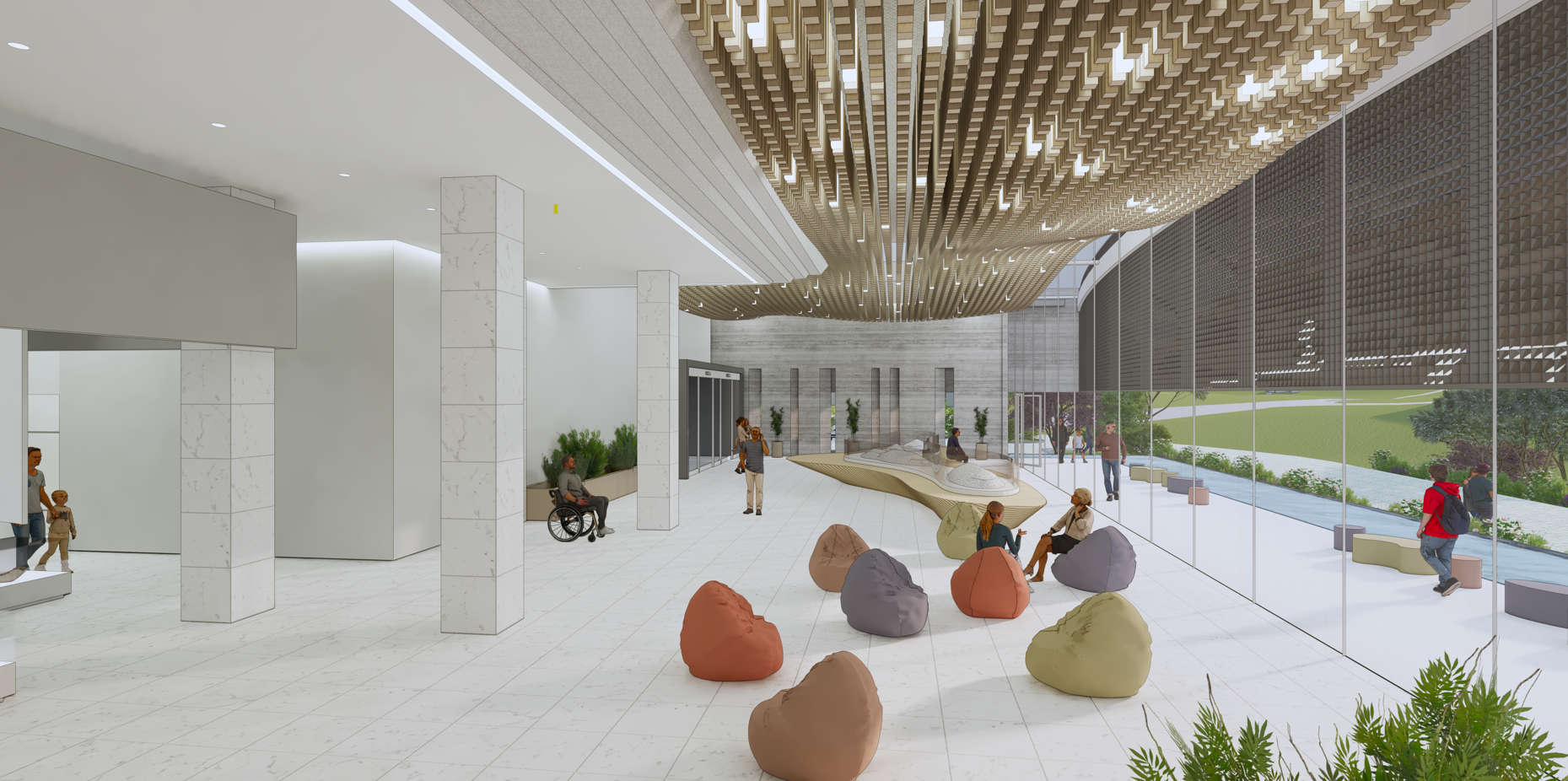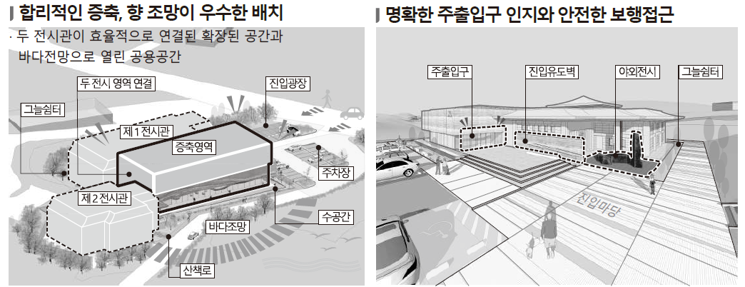 체험형 아트웍과 마을 및 서해 바다를 조망하면서 관람할 수 있는 파노라마전시는 테마에 따라 여행길 같은 경험을 제공합니다. 커뮤니티홀의 개방된 공간은 전시공간, 외부 휴게공간, 순환산책로와 연계되어 밝고 활기찬 박물관으로 계획하였습니다. 상설전시실는 공간 성격에 맞게 여유로운 공간계획과 쾌적한 환경을 조성하였으며, 기획전시실은 다양한 성격의 전시를 수용할 수 있도록 강당, 체험실, 야외전시공간과 연계될 수 있도록 계획하였습니다. 이러한 공간들은 중앙배치된 관리실과 사무실에서 합리적이고 쉽게 관리할 수 있습니다. 이렇게 계획된 여러공간들은 내외부를 넘나들며 각각의 성격에 맞는 다채로운 공간으로 계획하였습니다.