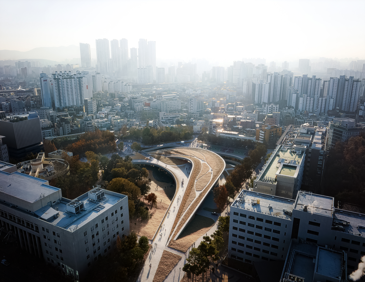 새로운 자연계 캠퍼스 광장은 학교의 중요한 생태 자산인 애기능의 능선과 주변을 둘러싼 건물의 맥락적 통합과 수용을 고려한 형태에서 출발하였으며, 기존 캠퍼스계획의 도상학적 특징과 캠퍼스 안팎의 다양한 동선 축(Axis)이 연결되어 입체적이고 다이내믹한 풍경으로서의 상징을 제시하고자 하였다. “The Valley”는 외기에 면하는 부분을 극대화한 지하 광장으로, 적극적인 외부공간을 계획하고 그 주위로 다양한 프로그램에 대응 가능한 가변형의 교사시설을 배치하였다. 일사 조절을 위한 처마 디자인, 그리고 애기능의 자연대류를 고려한 배치 및 평면 계획은 전통 건축·공간의 지혜를 활용한 부분이며,