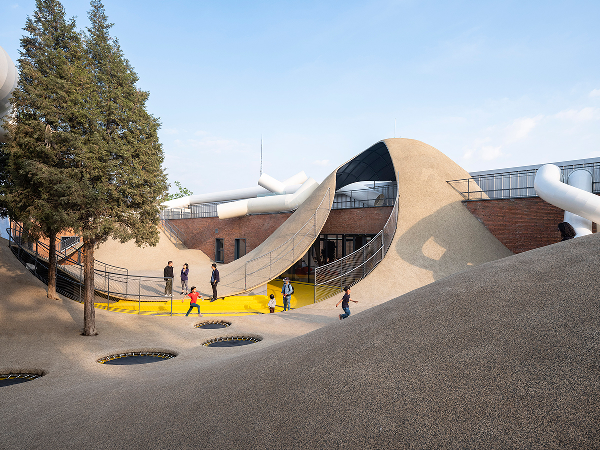 3. 마운드: 균형(Balance)과 의사 결정의 자유와 관련된 감각 발달을 향상한다.마운드를 통해 아이들은 탐험을 하고, 다양한 속도의 경사를 초월하여 위험과 편안함을 결정할 수 있다. 지형 아래의 영역을 활용하여 추가적인 놀이 공간을 만들었다. 테라스 층에서 여러 틈 또는 미끄럼틀을 통해 접근할 수 있다.
