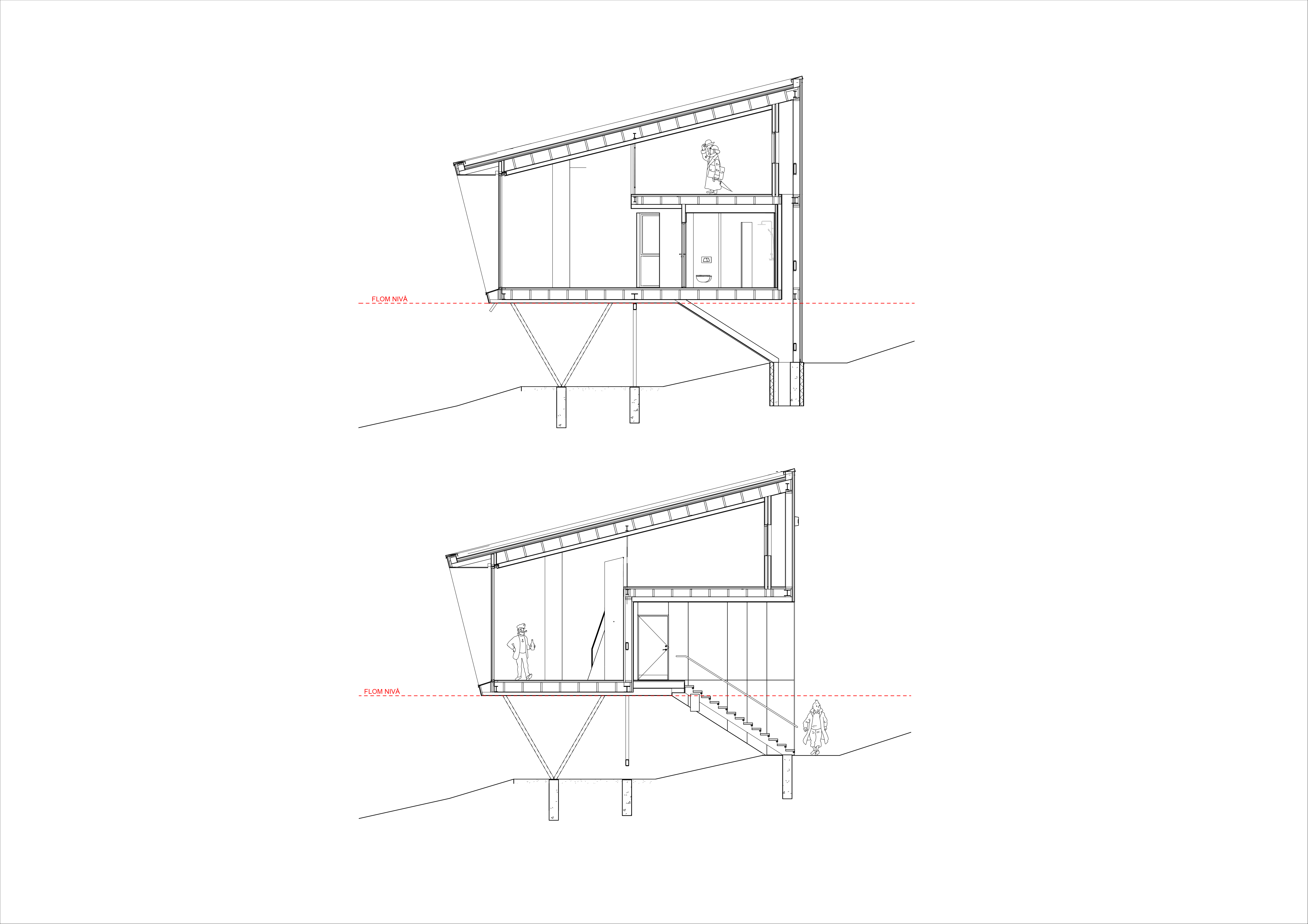 Where required the buildings are raised on stilts above the flood level. Only the restaurant which connects to the existing bar, kitchen and spa area is placed below the flood level and designed to withstand flooding through water resistant material use, with all technical installations placed a minimum of 1,4m above the floor. The raised buildings also create a variety of covered outdoor spaces for the guests and allows a visual transparency through the buildings towards the waterfront.