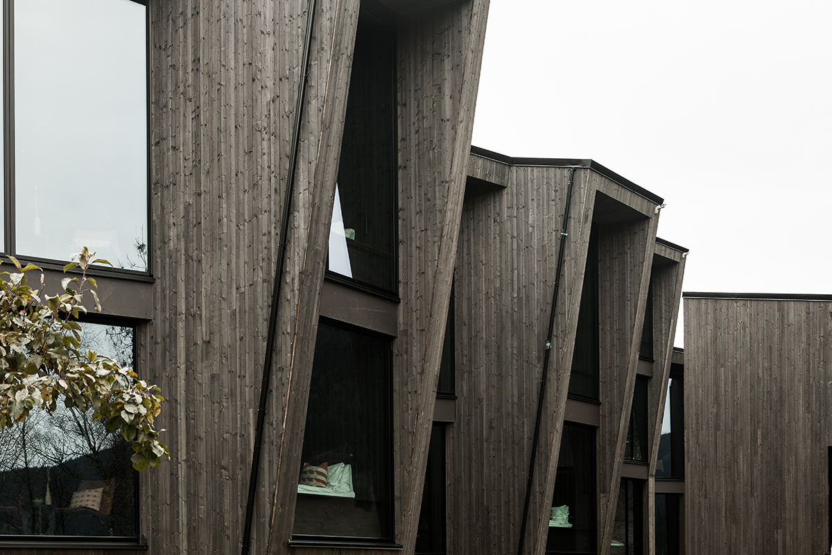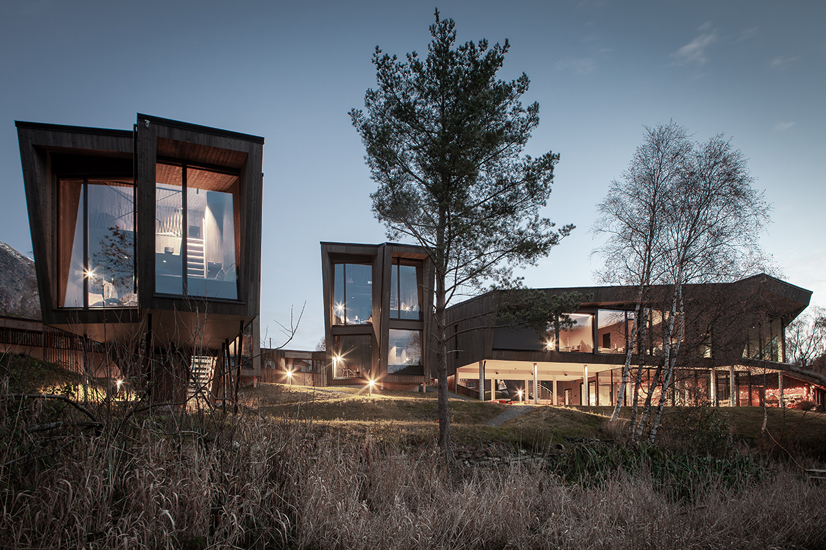 The buildings are formed to fit the landscape and compact site, and open for views both between and from inside each building. Each room gives the private experience of contact with the surrounding landscape and views over the river and lake towards the mountains.