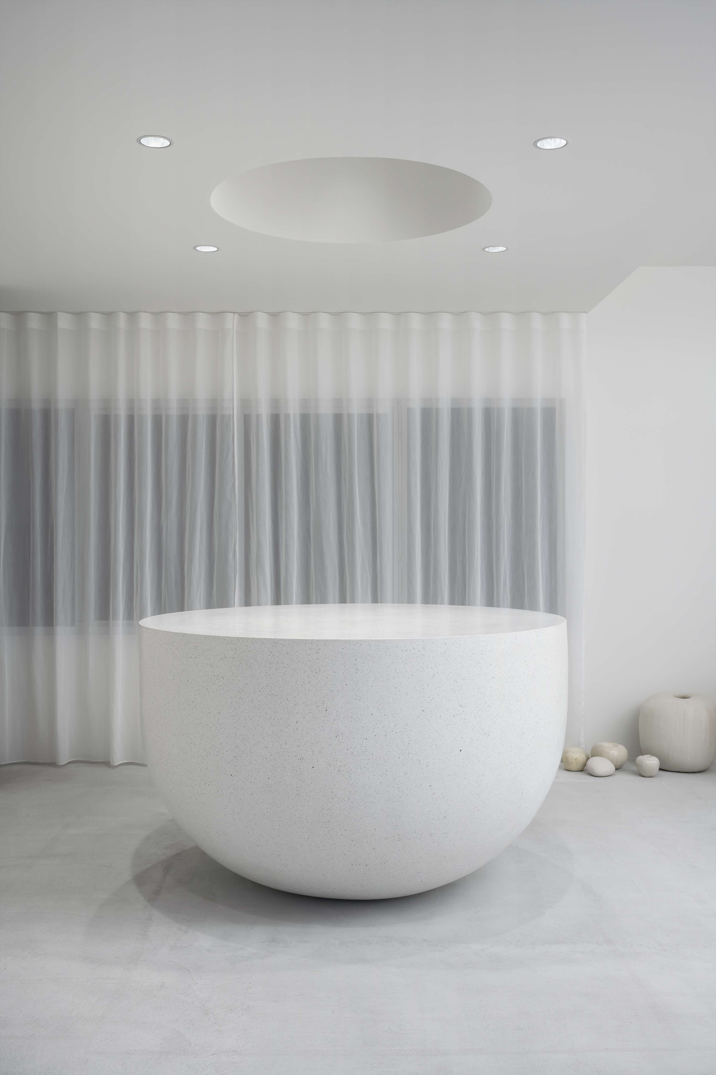 As a substitute for natural light, a dome-shaped luminous ceiling was planned to run from the entrance to the back of the establishment, emphasizing the characteristic depth of the space as a key element. The solid constructions in the homogeneous space, such as trees in a meadow or large rocks on a riverbank, were chosen and spaced as landmarks where people would gather in an undefined space. The seating is arranged so that the views and reflections in the mirrors intersect, creating a changing landscape as people move around, with each seat positioned to embrace the construction.
