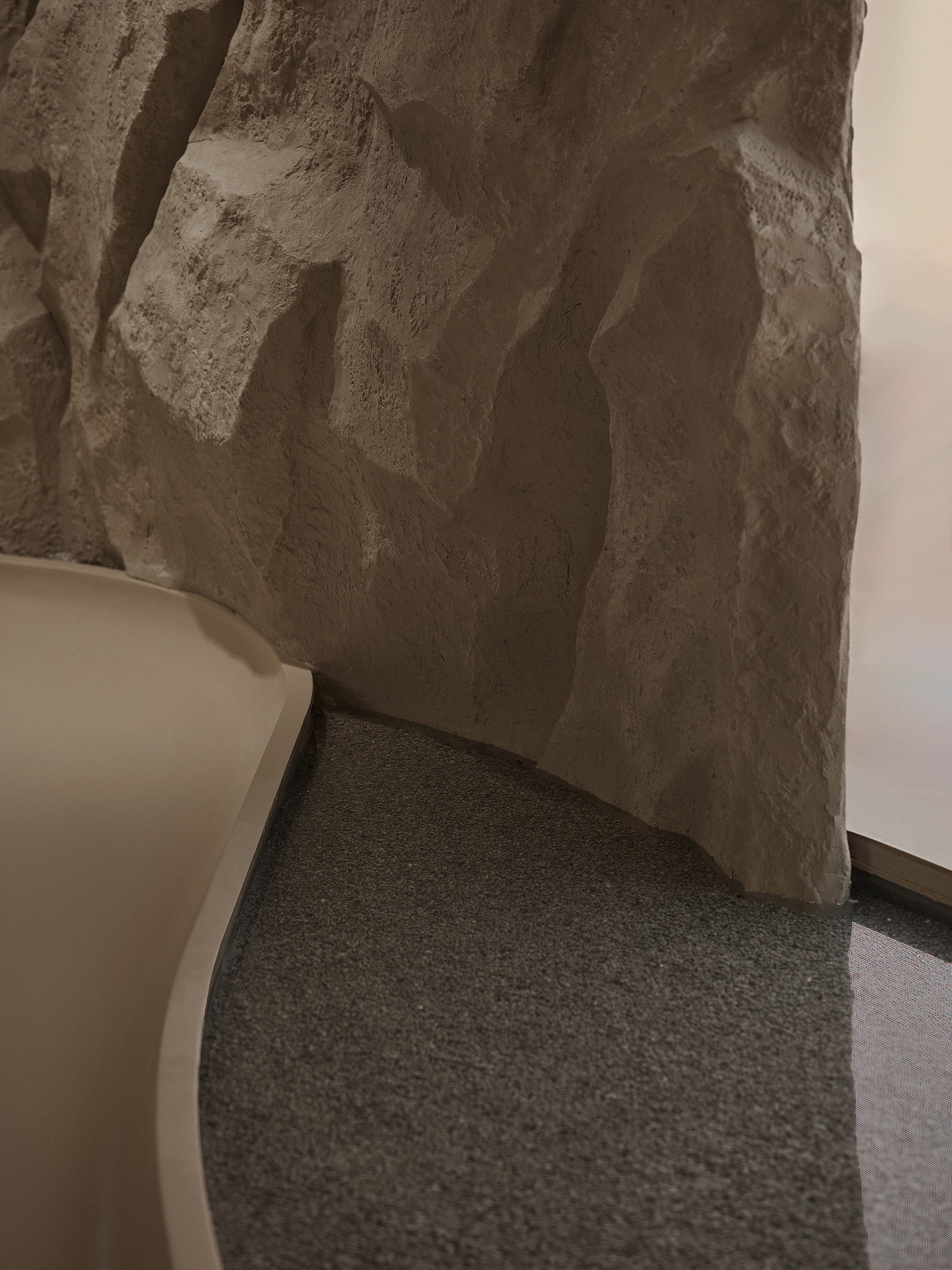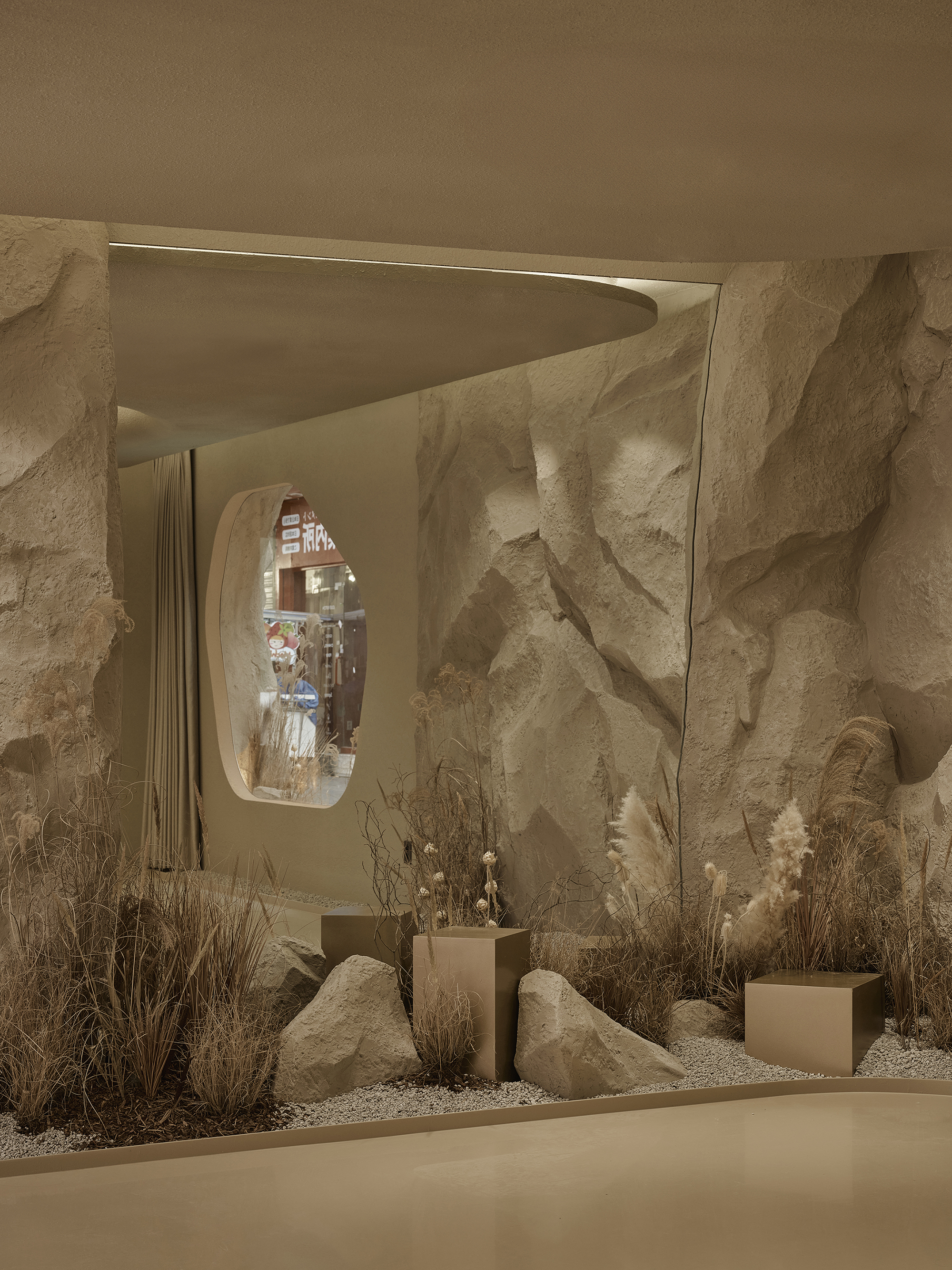 1층은 브랜드의 철학과 아이덴티티를 반영한 전시 공간이고, 2층은 제품 테스트와 소셜 이벤트를 위한 라운지와 판매 공간이다. 이 공간들은 빈 공간을 통해 복잡하게 연결되어 있으며, 훼손되지 않은 자연의 개념과 현대적인 미학이 매끄럽게 조화를 이루는 조형물을 수용하고 있다. 외부 암벽 파사드를 통해 구내에 들어서면 1층 실내는 유기적인 산책로를 모사해 사막과 바위 풍경을 연상시키는 따뜻한 갈색 톤으로 미감 있는 자연의 개념을 재해석한다. 관람객들은 갈대 풍경을 헤치며 구불구불하게 휘몰아치며 흔들리는 물의 물결을 만나고, 미디어 벽에서 자연의 풍경을 목격하며 바위의 거친 질감을 느껴 '손대지 않은 자연'을 주제로 항해하는 몰입감 있는 경험을 제공한다. 갈대숲에서 영감을 받은 계단에 오르면 2층에 화장품을 직접 체험하고 구매할 수 있는 공간을 만나게 된다. 1층에서 뿜어져 나오는 임팩트 있는 바위조각은 그 빈자리를 시각적으로 선명하게 남아 있다. 바위조각으로 계단식으로 올라가는 2층의 천장에 설치된 조명은 양쪽 층의 은은한 자연광 분위기를 유지하며 전체적인 분위기를 돋보이게 한다.