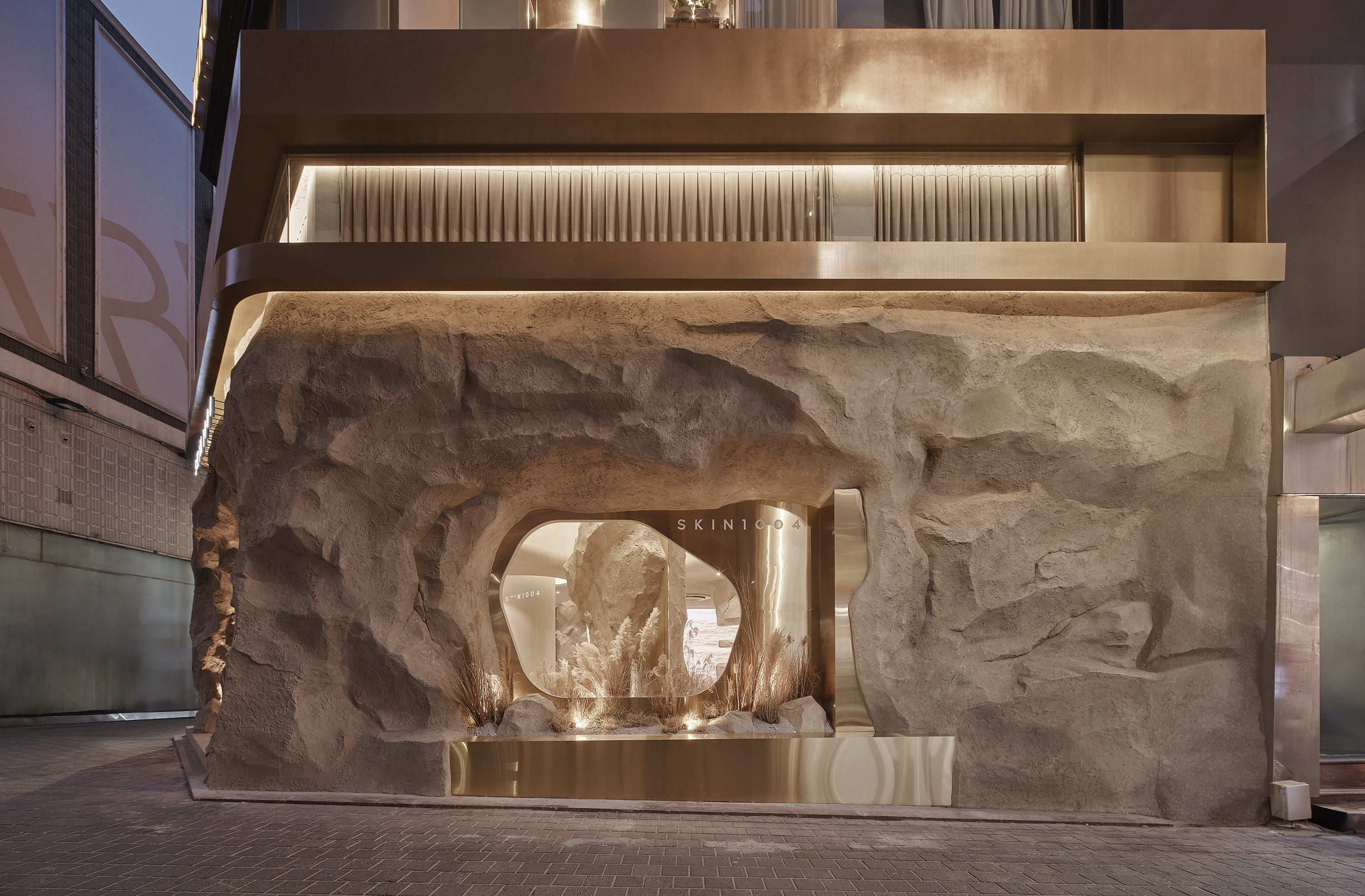 디자인은 도시 환경 내에서 다양한 풍경을 혼합하여 독특한 경험을 제공하는 것을 목표로 한다. 외부의 북적거리는 도시와 의도적인 대비는 매혹적인 공간을 만들어 호기심을 유발하고 방문객들에게 흥미로운 탈출을 제공한다. 플래그십 스토어의 파사드는 기존 명동의 유리 매장 전면에서 벗어나 강렬한 바위 질감을 과감하게 구현했다. 입구와 창문에 황동 금속을 전략적으로 접목한 것은 스킨1004의 현대적인 브랜드 철학을 전형적으로 보여주며, 바위로 상징되는 훼손되지 않은 자연의 원시적인 요소를 첨단 기술을 통해 화장품으로 변형시킨다. 곡선의 창문과 황동 벤치, 세심하게 큐레이션된 조경은 단순한 2차원 패턴을 넘어 입체적인 공간 연출에 기여한다.
