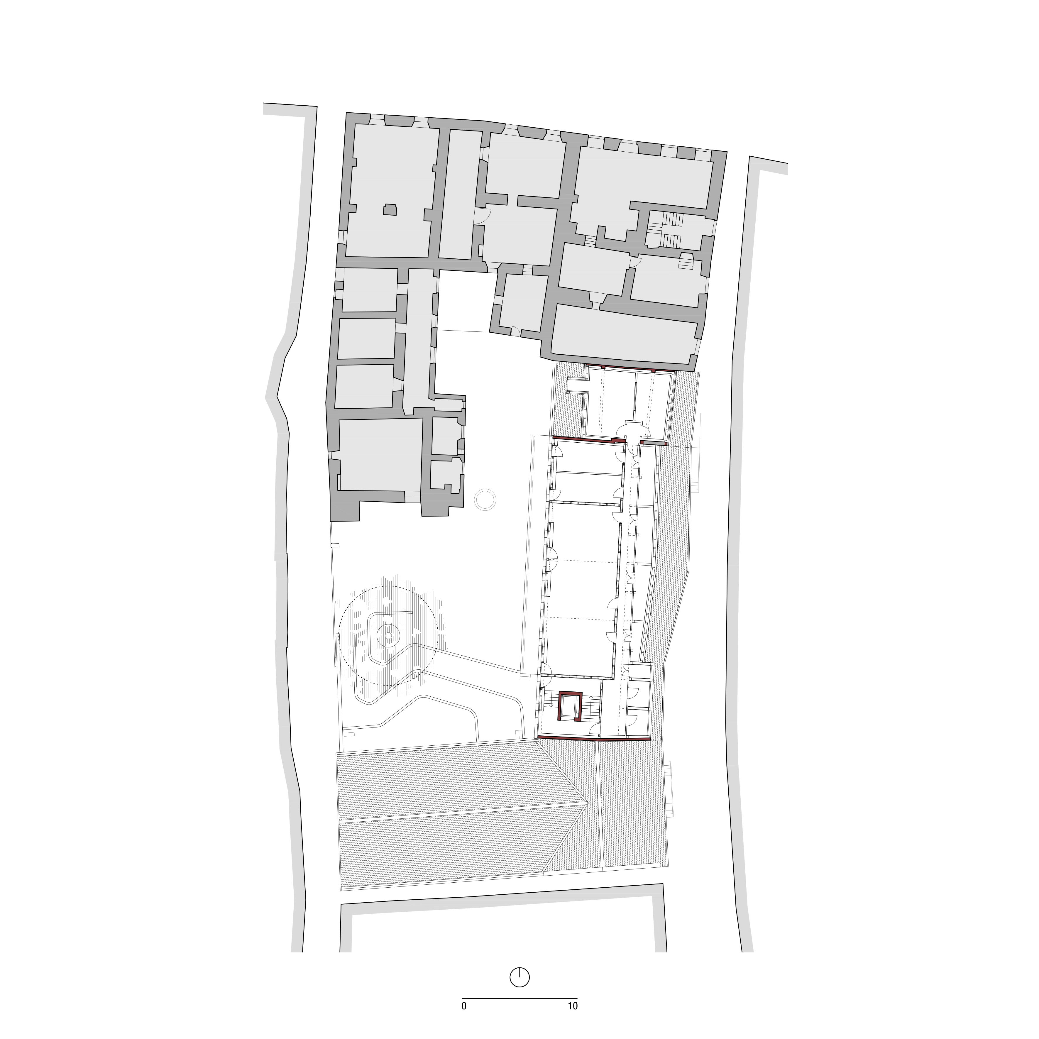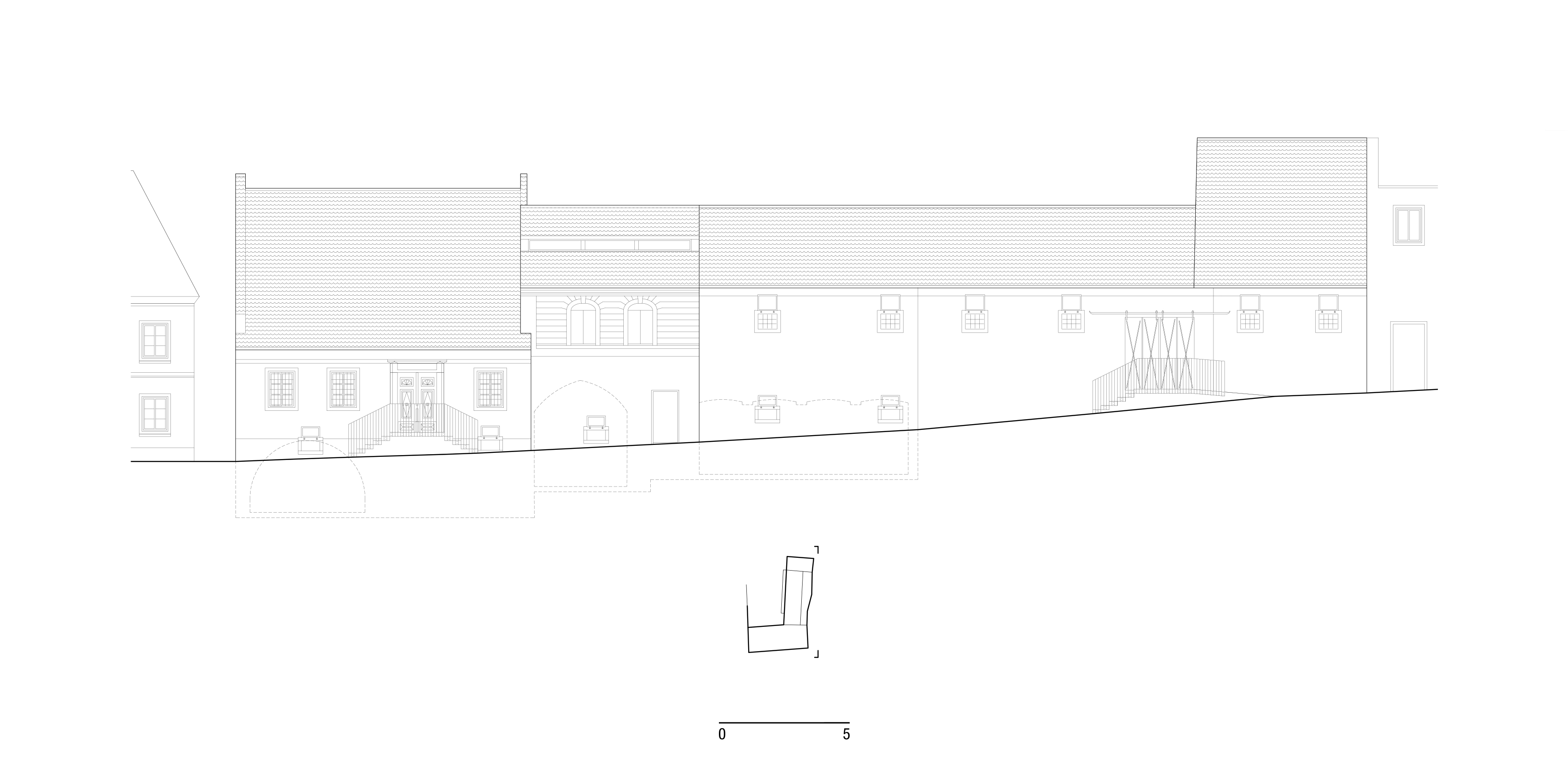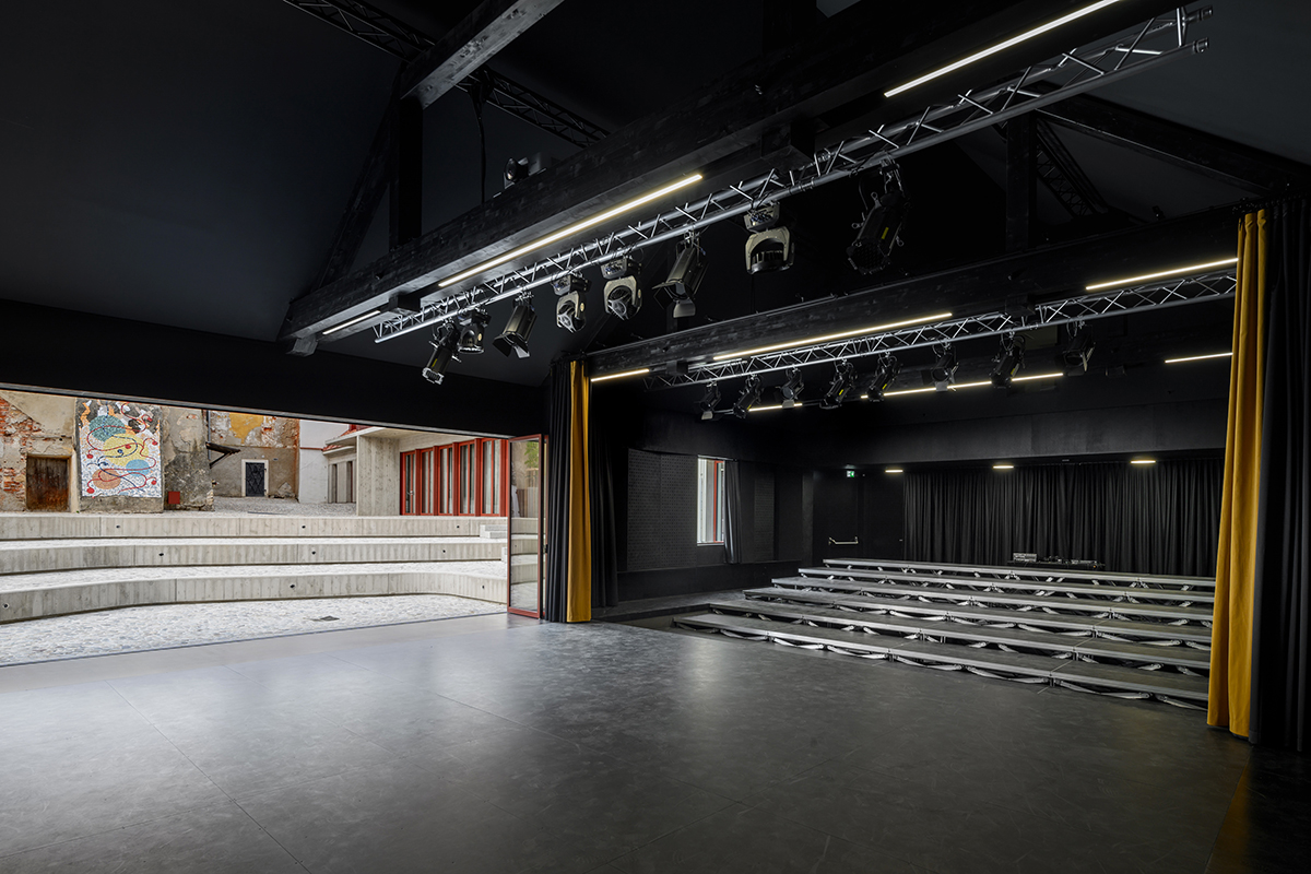 The project's central theme revolves around bridging the old and the new, providing solutions to the challenges posed by the site and the program. On one side, there's a cluster of diverse structures at varying elevations and the immediate urban context. On the other side, the challenge lies in designing for highly diverse user groups with varying and unpredictable needs. As a result, the spaces within the new complex needed to offer maximum flexibility, accommodating various unconventional uses. Both halls can fully open on different occasions, seamlessly connecting to the courtyard. The large hall, purposefully designed as a versatile event space, boasts adjustable stage platforms that can also be utilized for outdoor events in the multipurpose auditorium. The integration of the old and the new is distinctly evident: on the ground floor, the walls of the old houses create the ambiance of the interior facade. In the attic, a corridor is ingeniously positioned at the juncture, illuminated by a longitudinal skylight – a pivotal element in the roof facade that demarcates the transition between the old and the new, offering a captivating view of the old city tower.