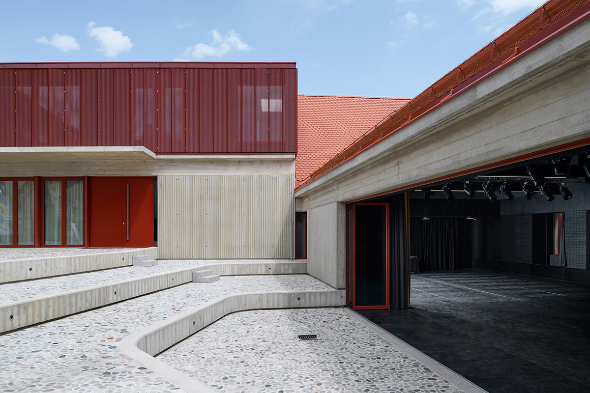 The selection of materials, inspired by diverse character of the old city center, ingeniously incorporates existing elements, thoughtfully reimagined for a contemporary context. Archaeological excavations unearthed numerous river pebbles, formerly used for paving the historic city center. To honor the area's heritage, these pebbles were reused, restoring Ptuj's traditional color palette to the streets, squares and also to the new cultural center. This sustainable choice also aligns with today's environmental imperatives. The architectural design of the building embraces simplicity, highlighting the fundamental elements of walls, cornices, and roofs. The building's aesthetic is deeply rooted in a tectonic logic, eloquently narrating the very essence of its construction. Surrounded by narrow streets, it invites visitors to engage intimately with its exterior. In response, the building features a profiled structure of visible concrete, accentuated by wooden semicircular formwork. This design choice not only humanizes the imposing walls but also encourages the gradual accumulation of patina over time, deepening its connection to the historical context.
