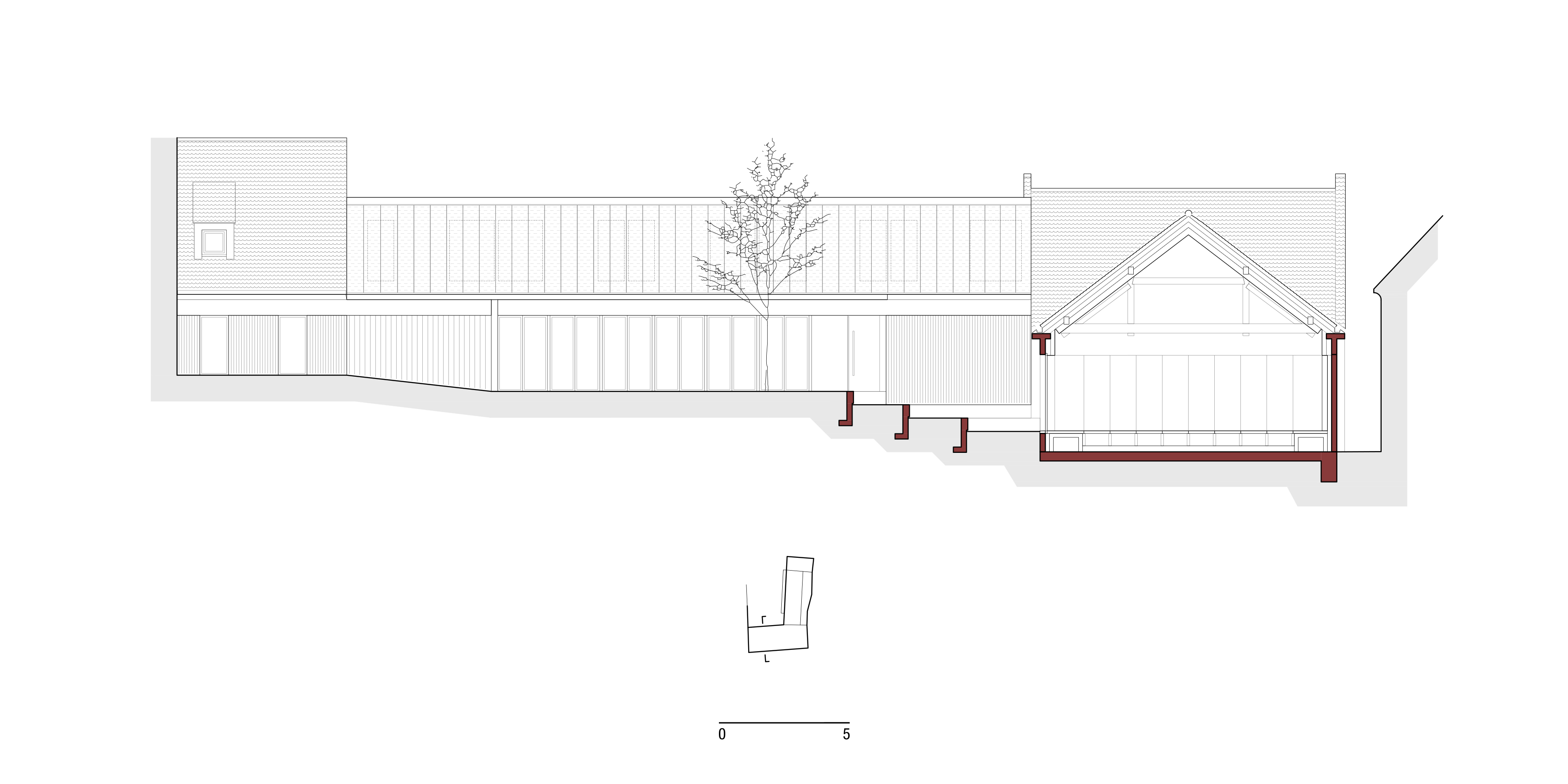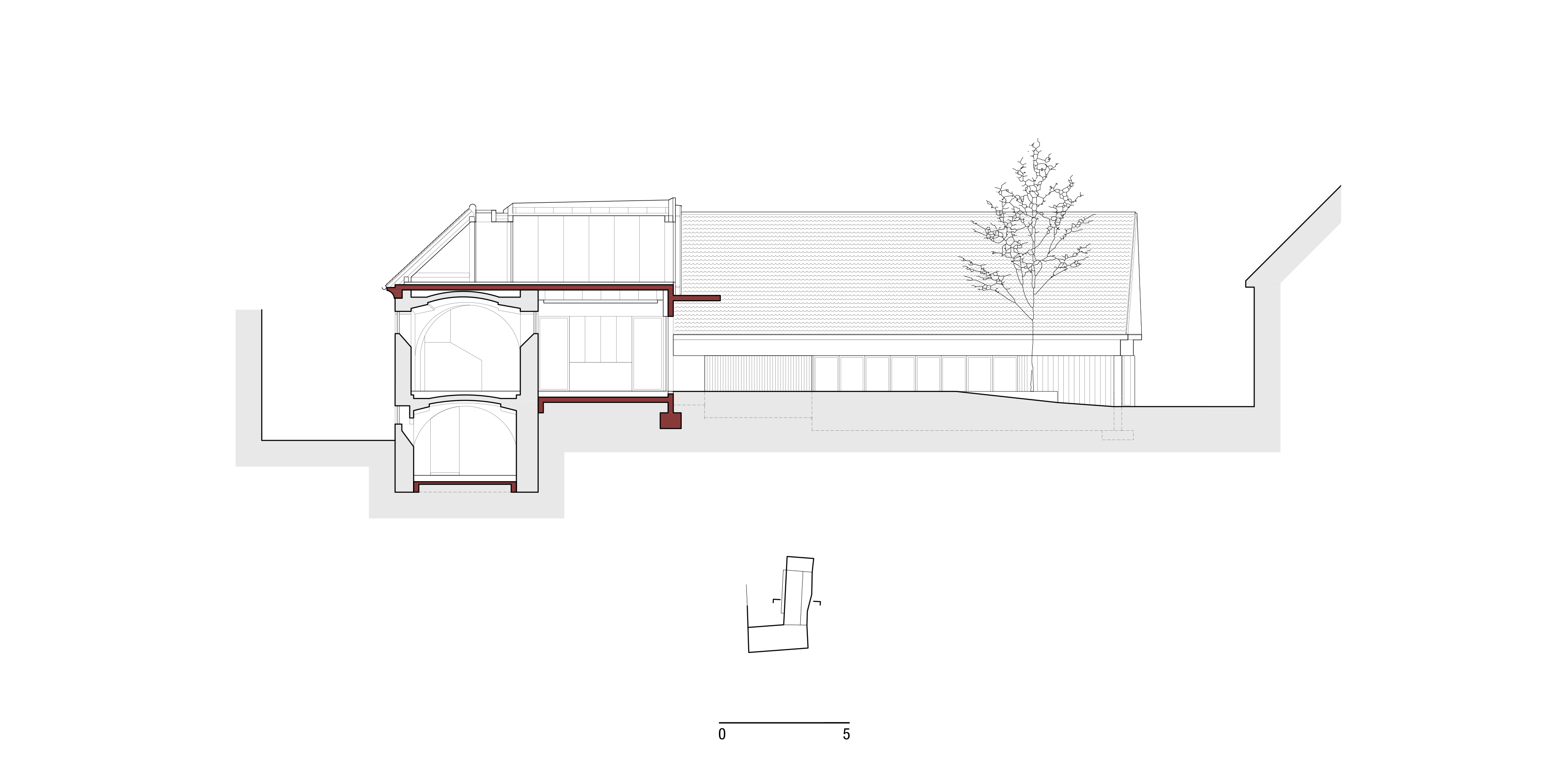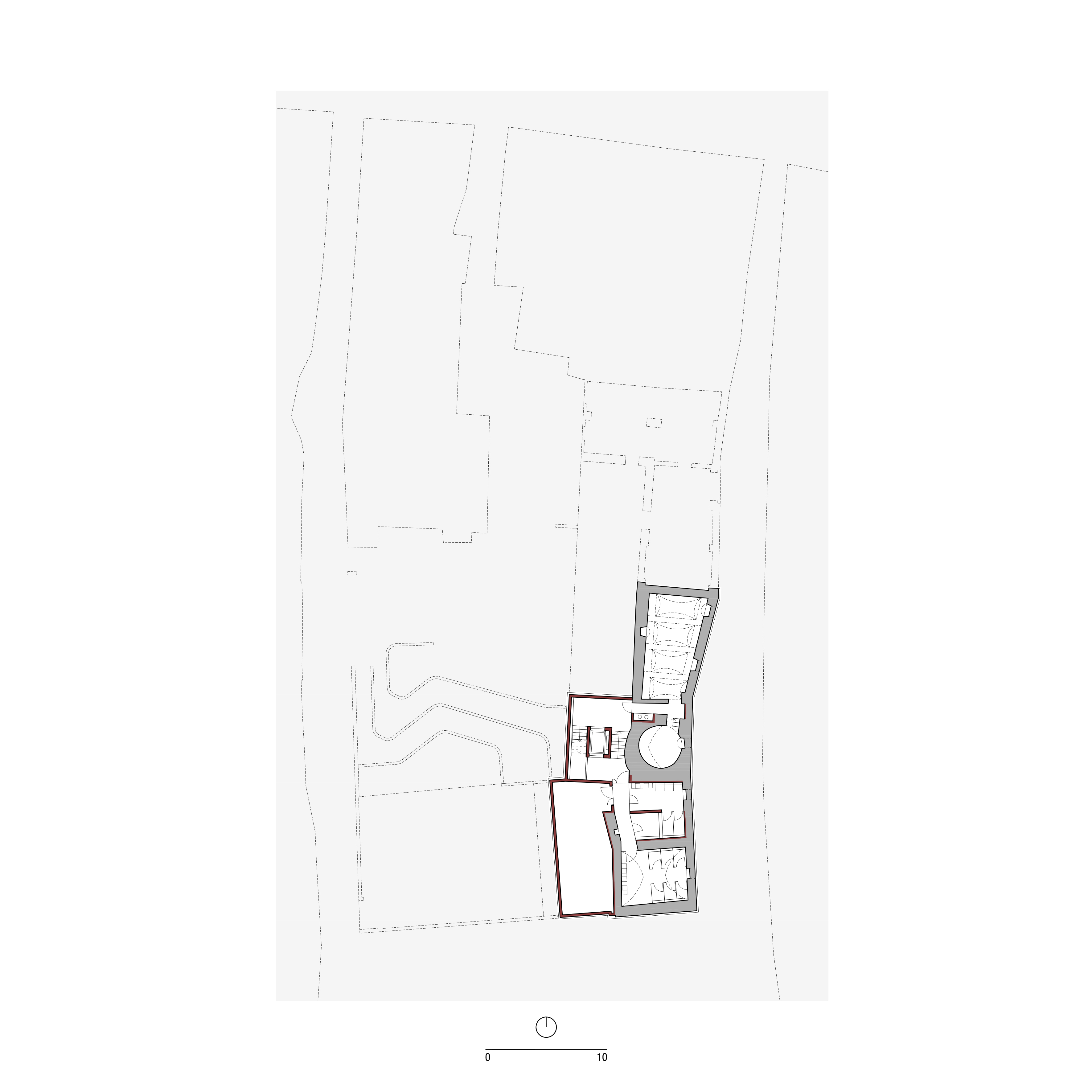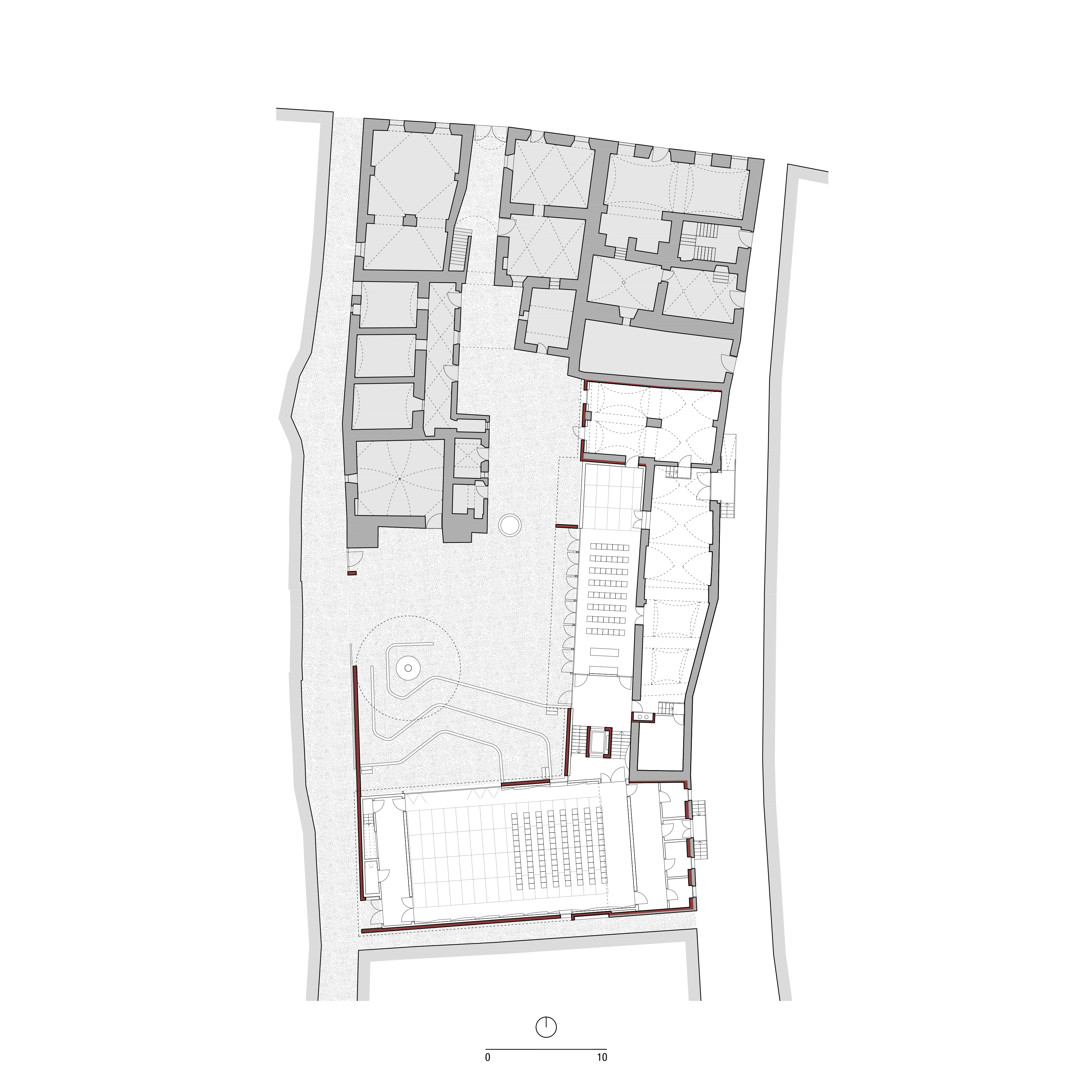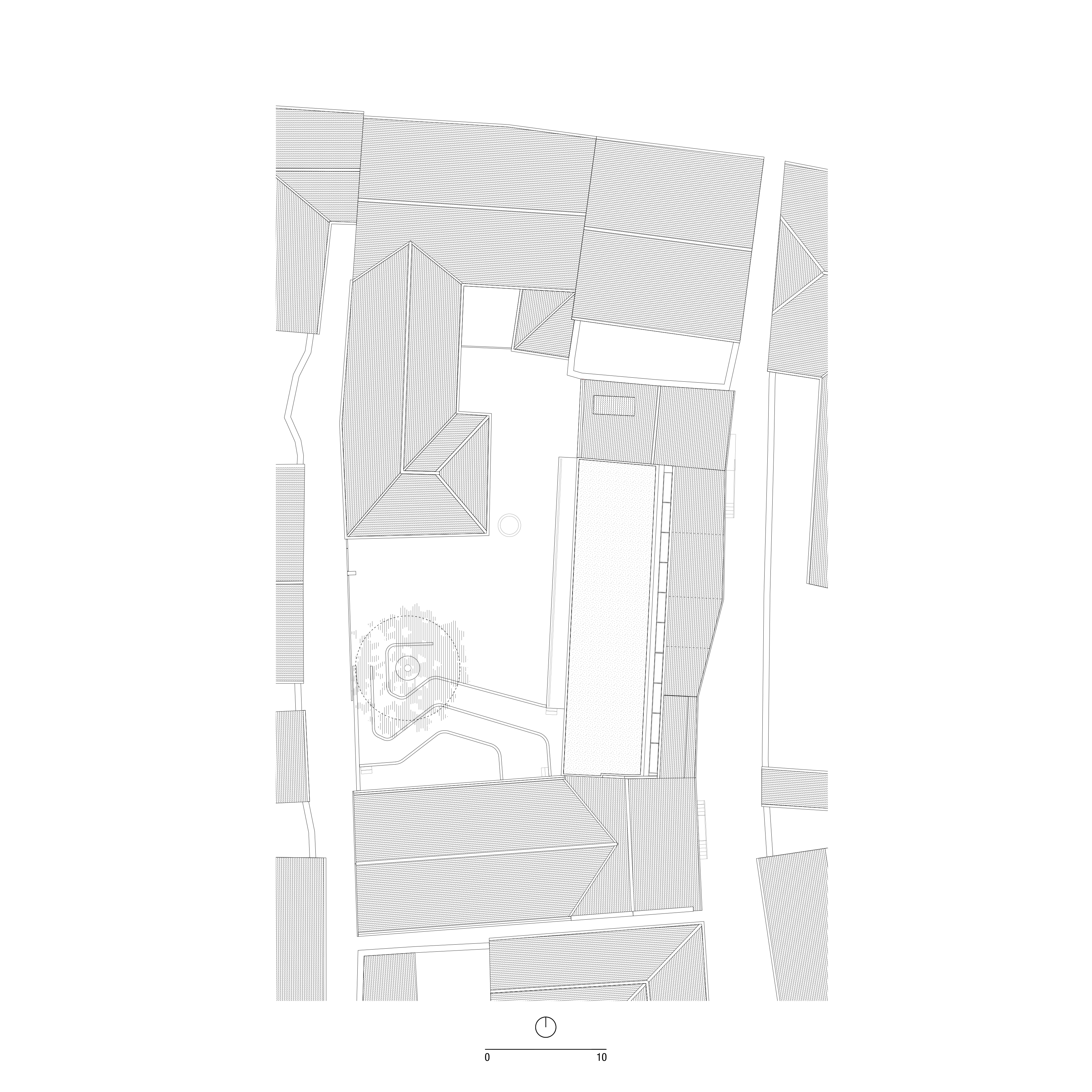 The project's central theme revolves around bridging the old and the new, providing solutions to the challenges posed by the site and the program. On one side, there's a cluster of diverse structures at varying elevations and the immediate urban context. On the other side, the challenge lies in designing for highly diverse user groups with varying and unpredictable needs. As a result, the spaces within the new complex needed to offer maximum flexibility, accommodating various unconventional uses. Both halls can fully open on different occasions, seamlessly connecting to the courtyard. The large hall, purposefully designed as a versatile event space, boasts adjustable stage platforms that can also be utilized for outdoor events in the multipurpose auditorium. The integration of the old and the new is distinctly evident: on the ground floor, the walls of the old houses create the ambiance of the interior facade. In the attic, a corridor is ingeniously positioned at the juncture, illuminated by a longitudinal skylight – a pivotal element in the roof facade that demarcates the transition between the old and the new, offering a captivating view of the old city tower.