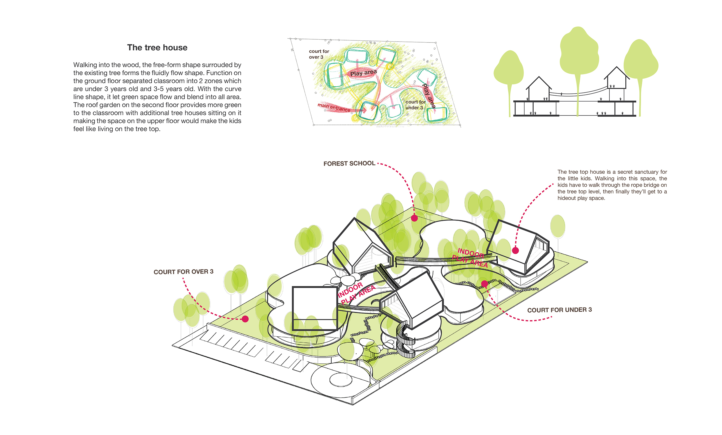각 동마다 교실 뒤편으로 야외 학습이 가능한 공간이 있고 건물 전체가 초목으로 둘러싸여 있다. 각 교실 앞에는 PM2.5 상황이나 열대기후로 인한 폭우, 과도한 일조량과 같은 기상이변 상황에서 다양하게 활용할 수 있는 실내 놀이 공간이 있다. 위층으로 올라가면 쿠킹클래스, 아트클래스, 소프트짐, 다목적홀 등 다양한 기능을 위한 트리하우스가 각각 있다. 박공 지붕 아래로 넓은 공간 두어 많고 숨을 수 있는 공간, 놀이를 위한 구조 공간, 모험공간 등 다양한 놀이틀이 될 수 있는 공간을 만들었다.