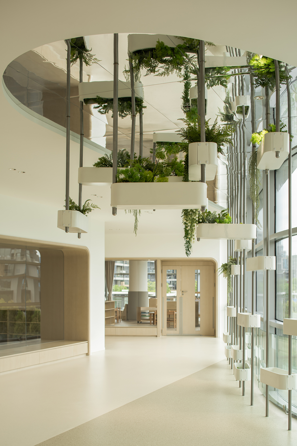 Cloud Kindergarten is located in Chengdu's LuxeLakes, near one of those early water surfaces. The 16 classes of kindergarten are integrated into the technologically advanced building volume.