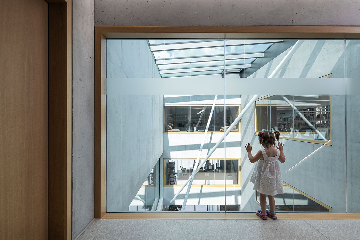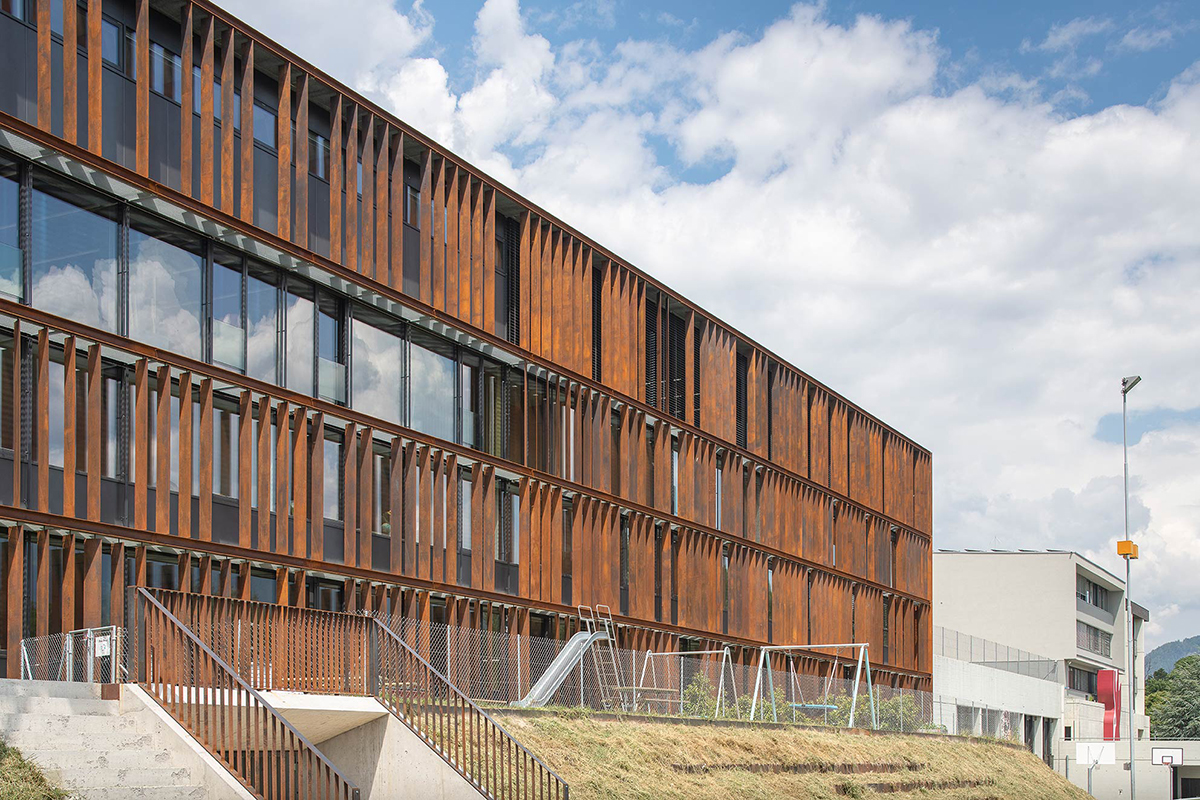 The school extension is the result of an open architectural competition held in 2014. The jury appreciated the precision of how the new building fits into the steep natural slope of the site, and its ability to link the various outdoor spaces on the plot, located on different levels.