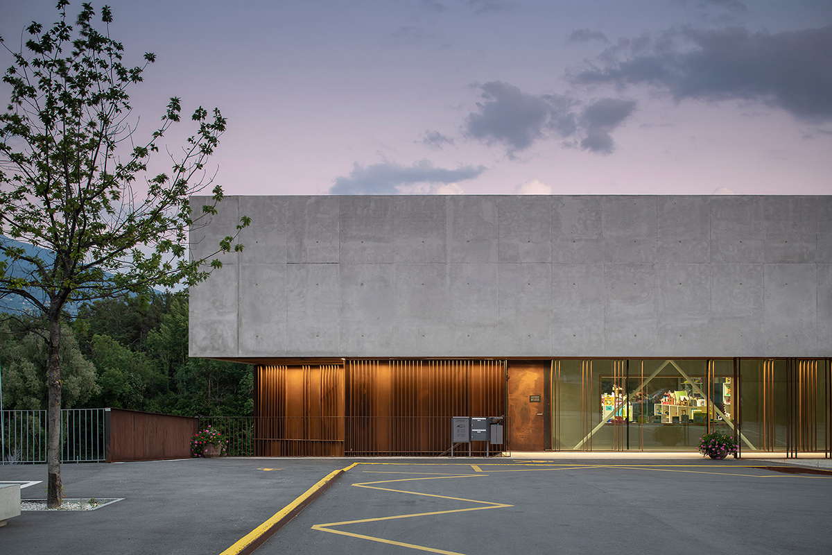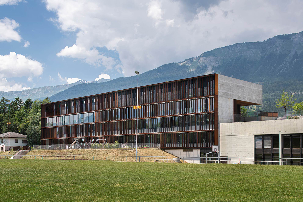 At an altitude of 880 m, the commune of Grimisuat, located on the sunny side of the Alps and ten minutes from the city of Sion, needs to expand its school infrastructure. In addition to classrooms, the building program includes a library, a meeting room for 300 people, storage space for the municipal archives and changing rooms for outdoor sports activities.