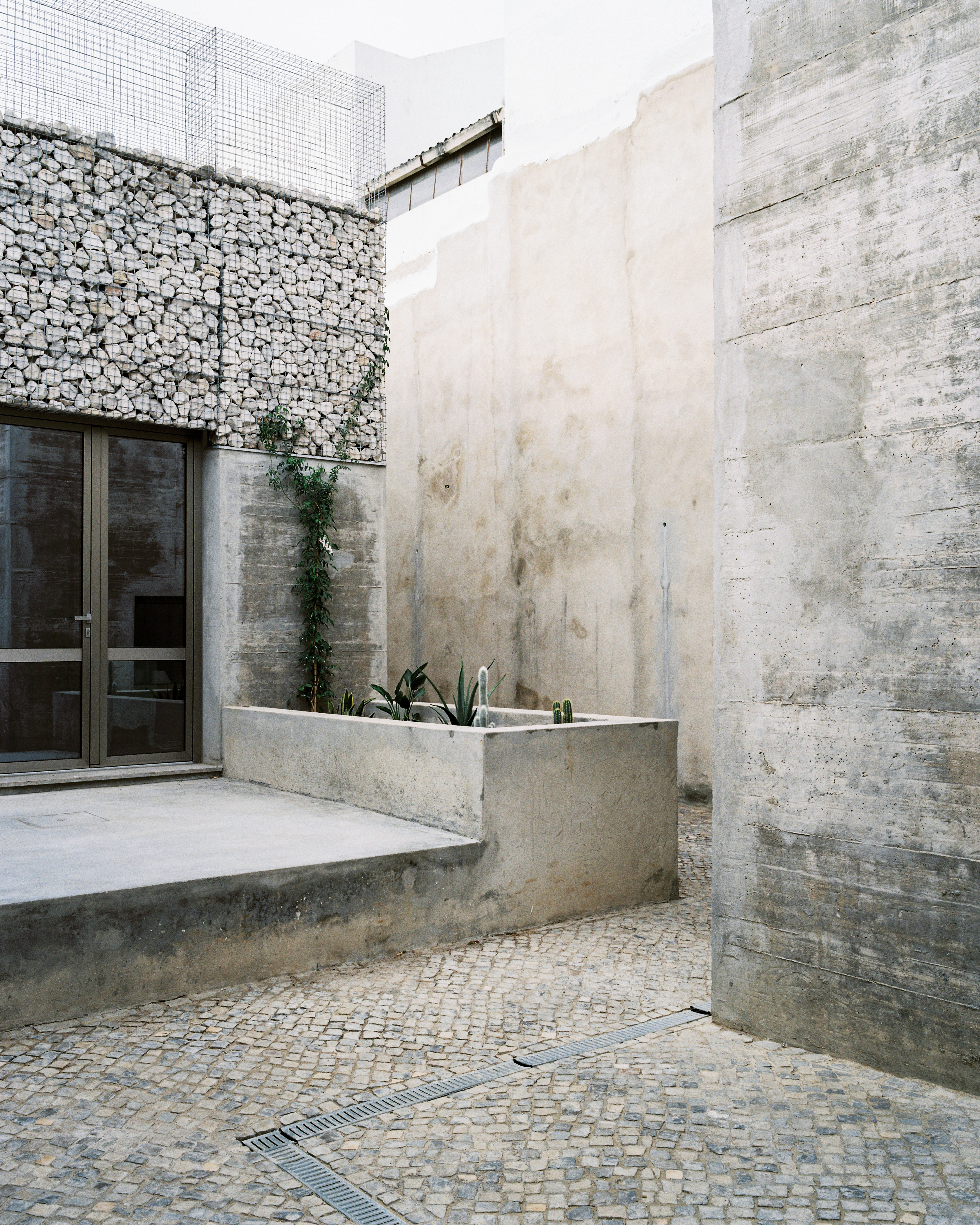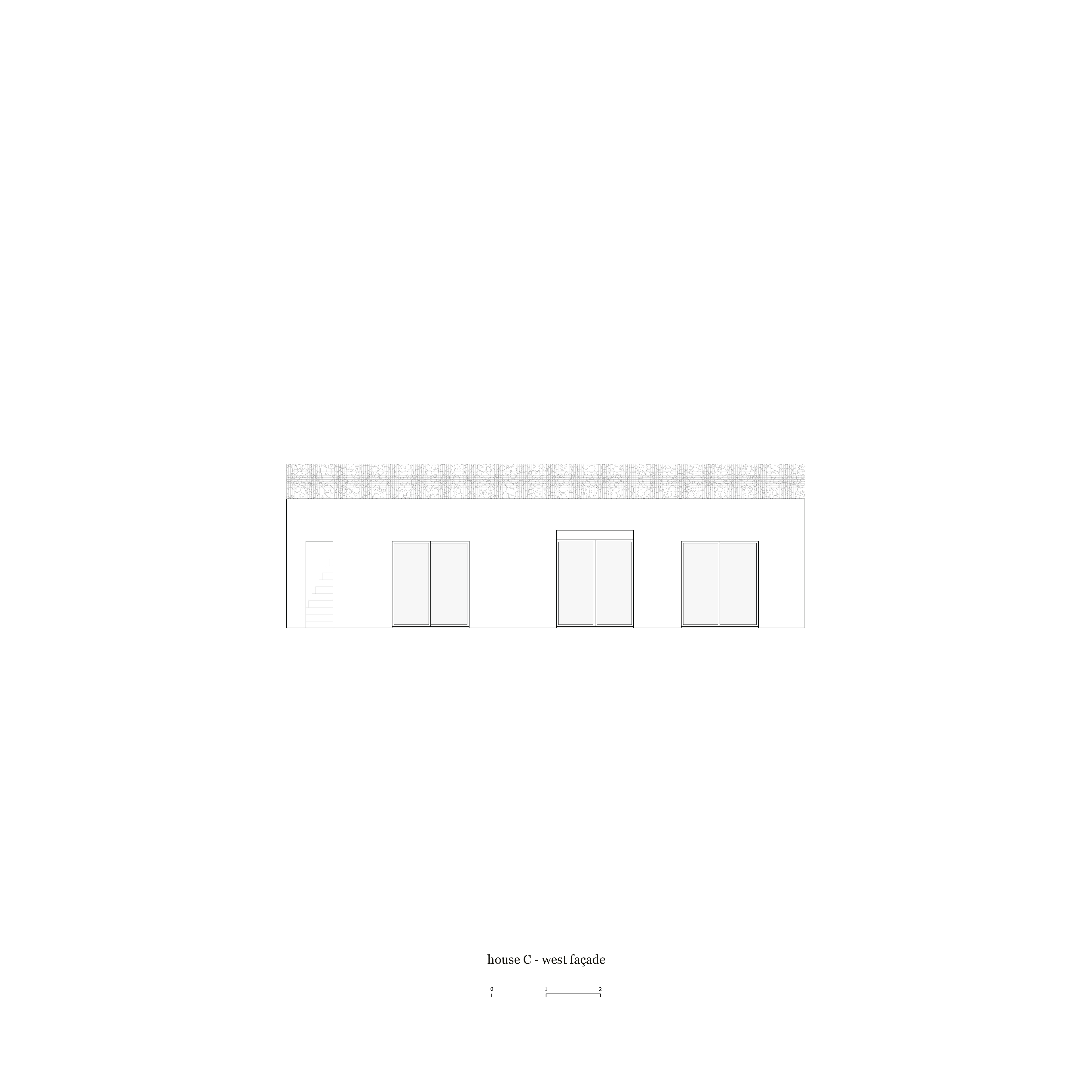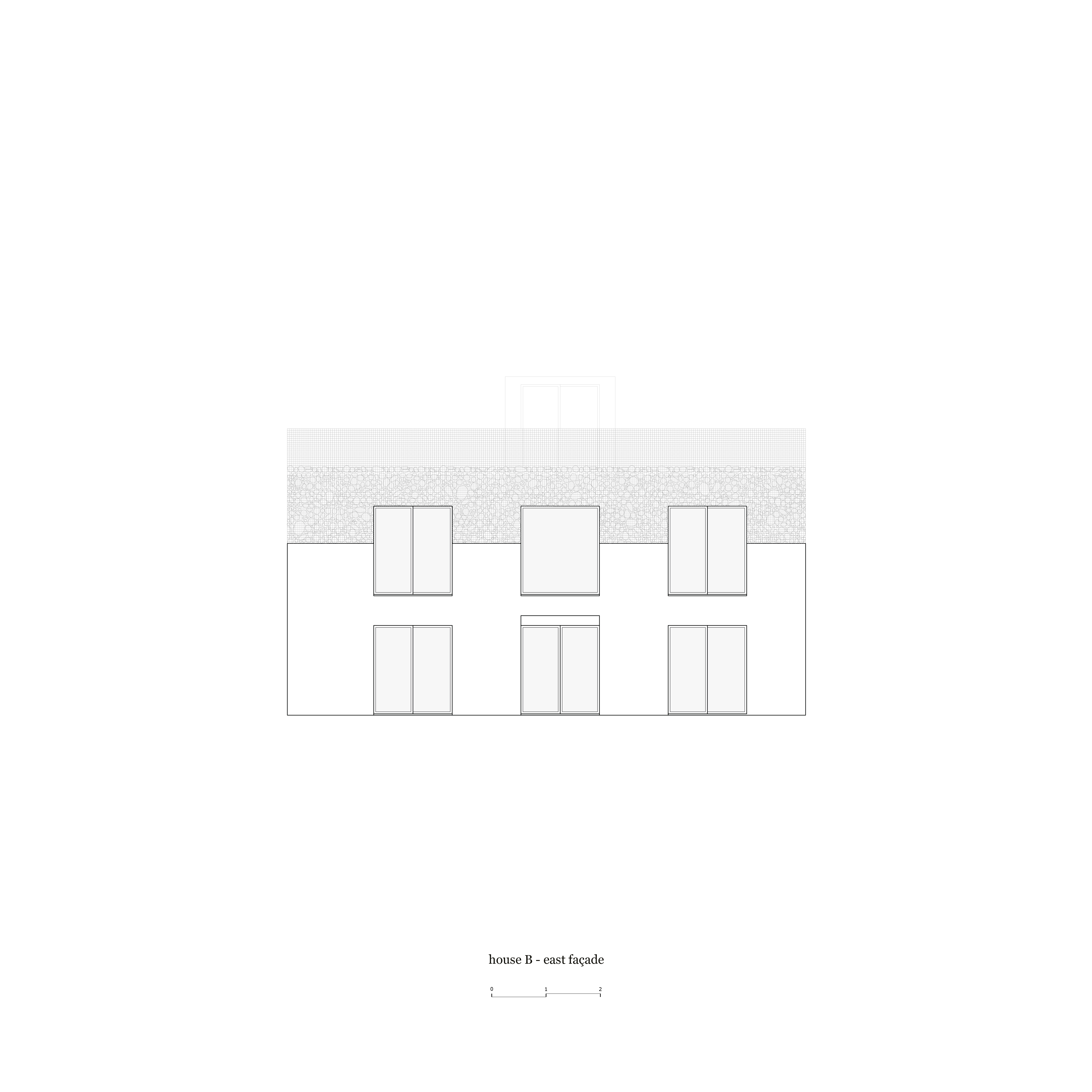 Three concrete façades of three houses are set around a courtyard. Each façade displays a different arrangement of the same constructive principle: a wall of exposed concrete rises from the ground, then, at a certain moment, a metal grid emerges from the concrete to contain a variety of local stones stacked on top of each other, until finally, the grid contains nothing but air.