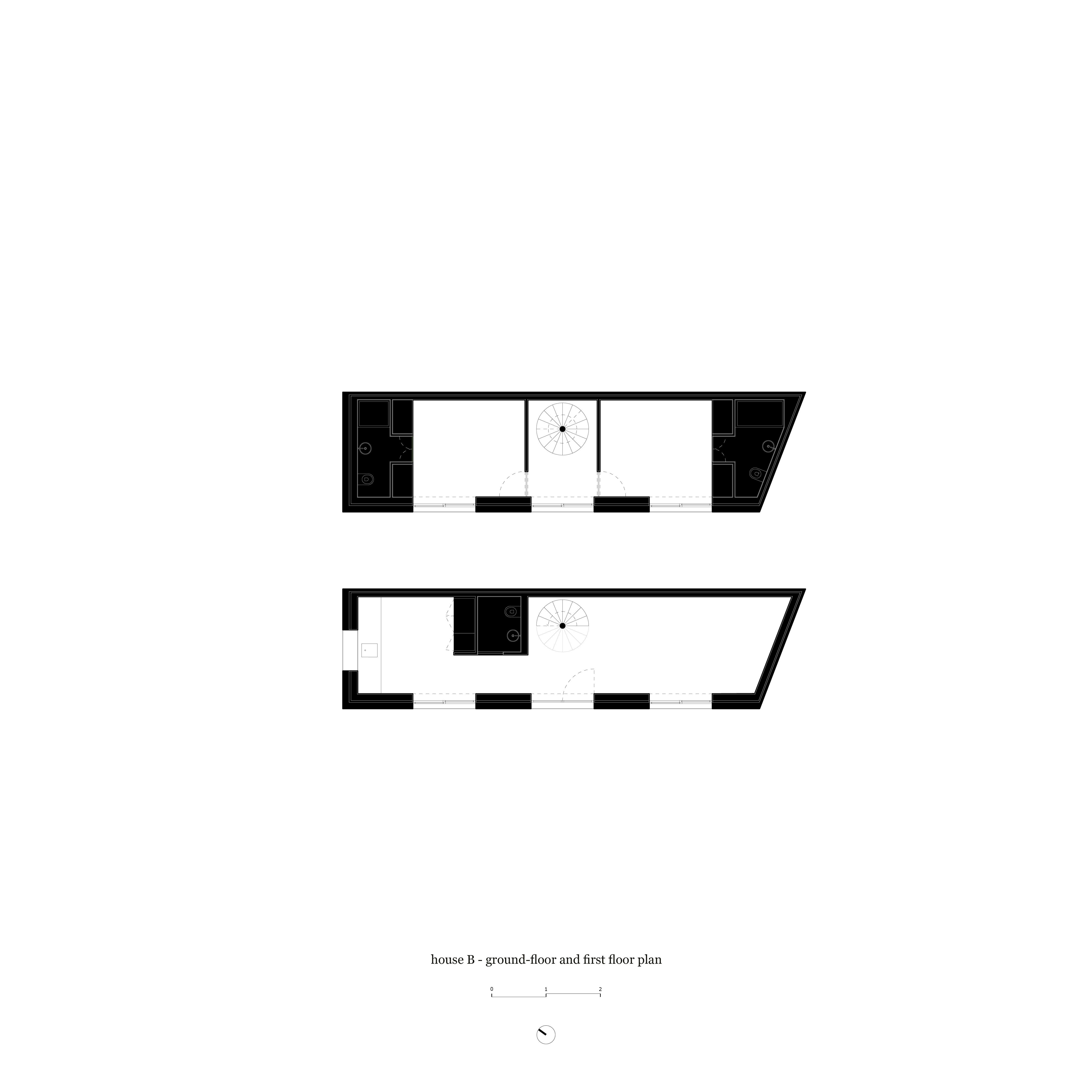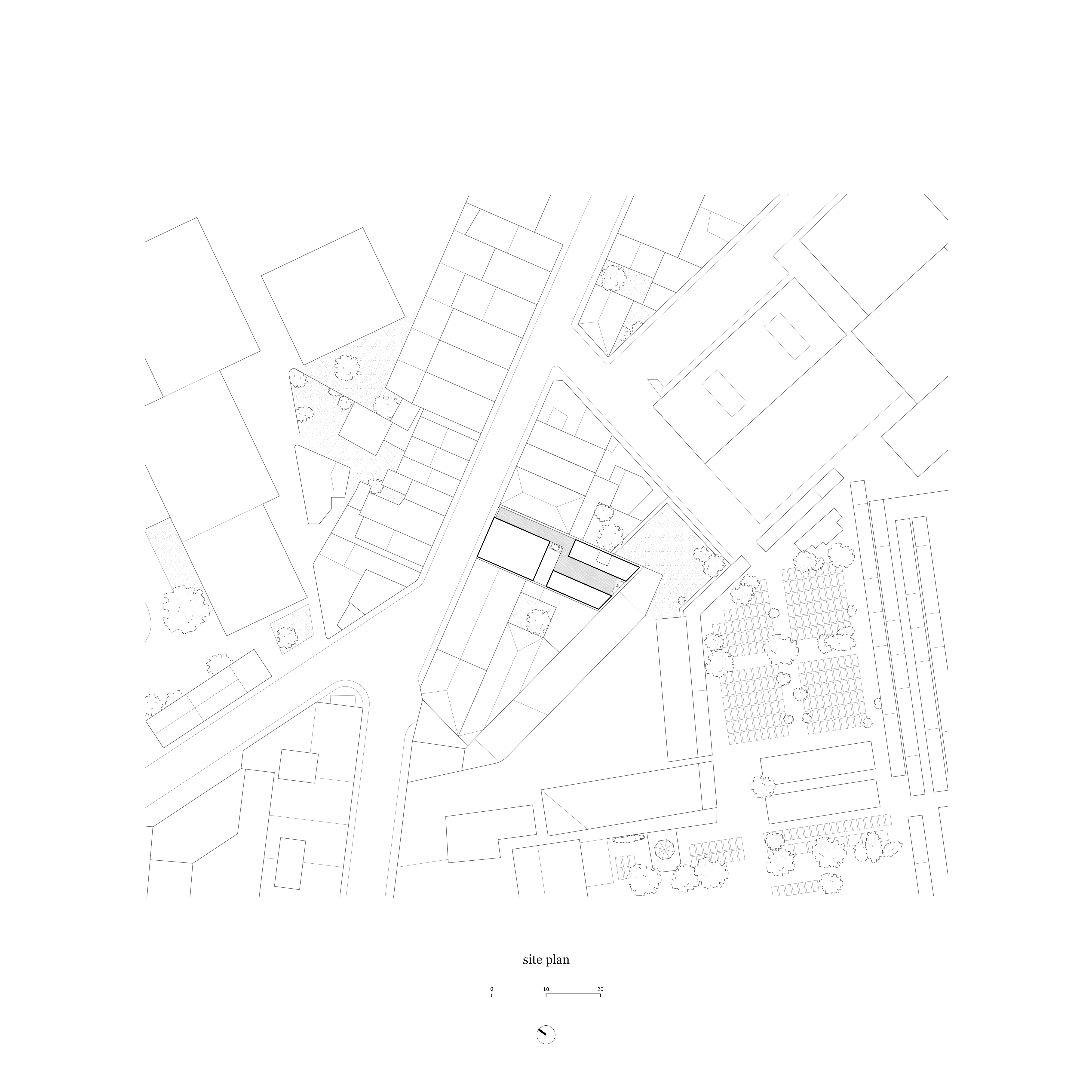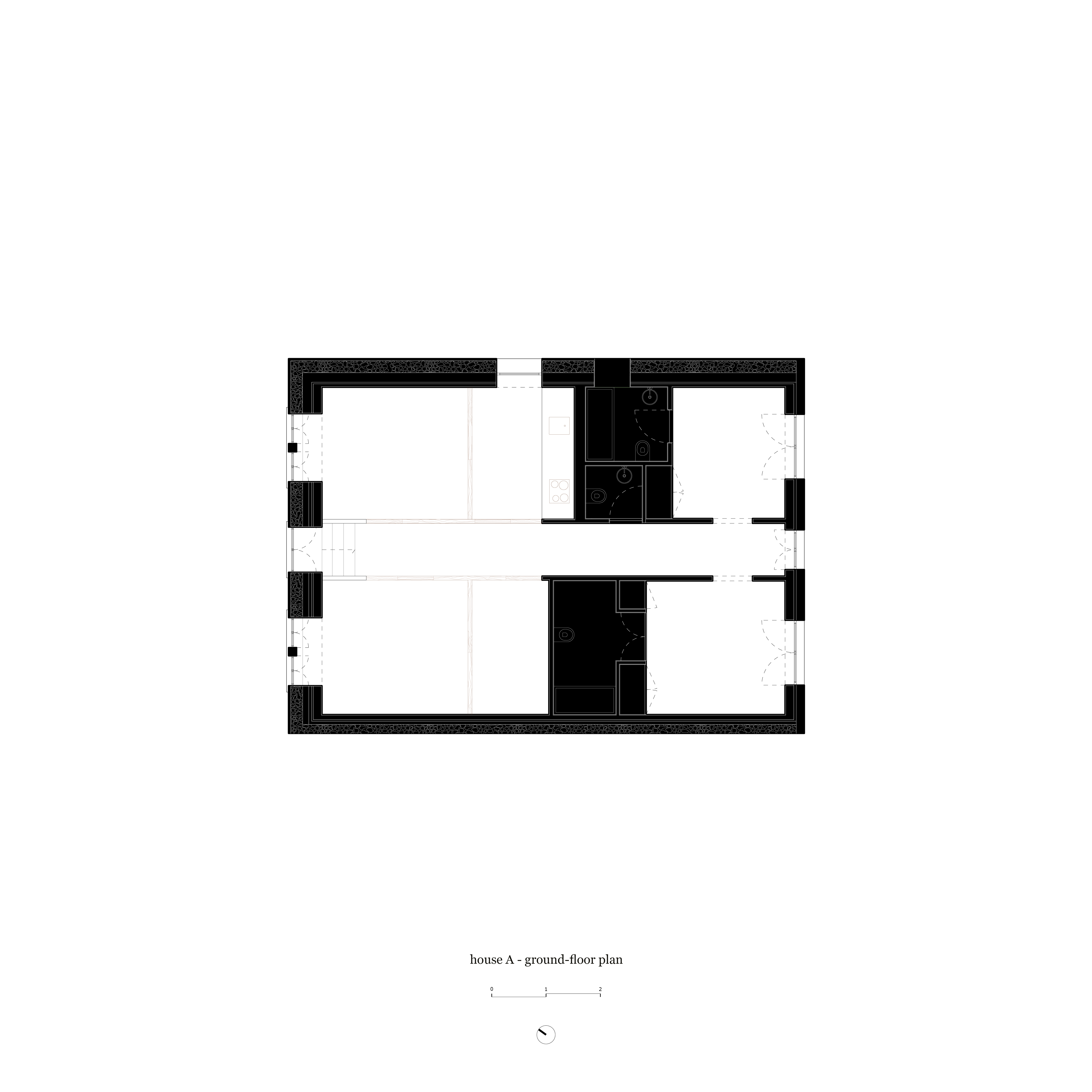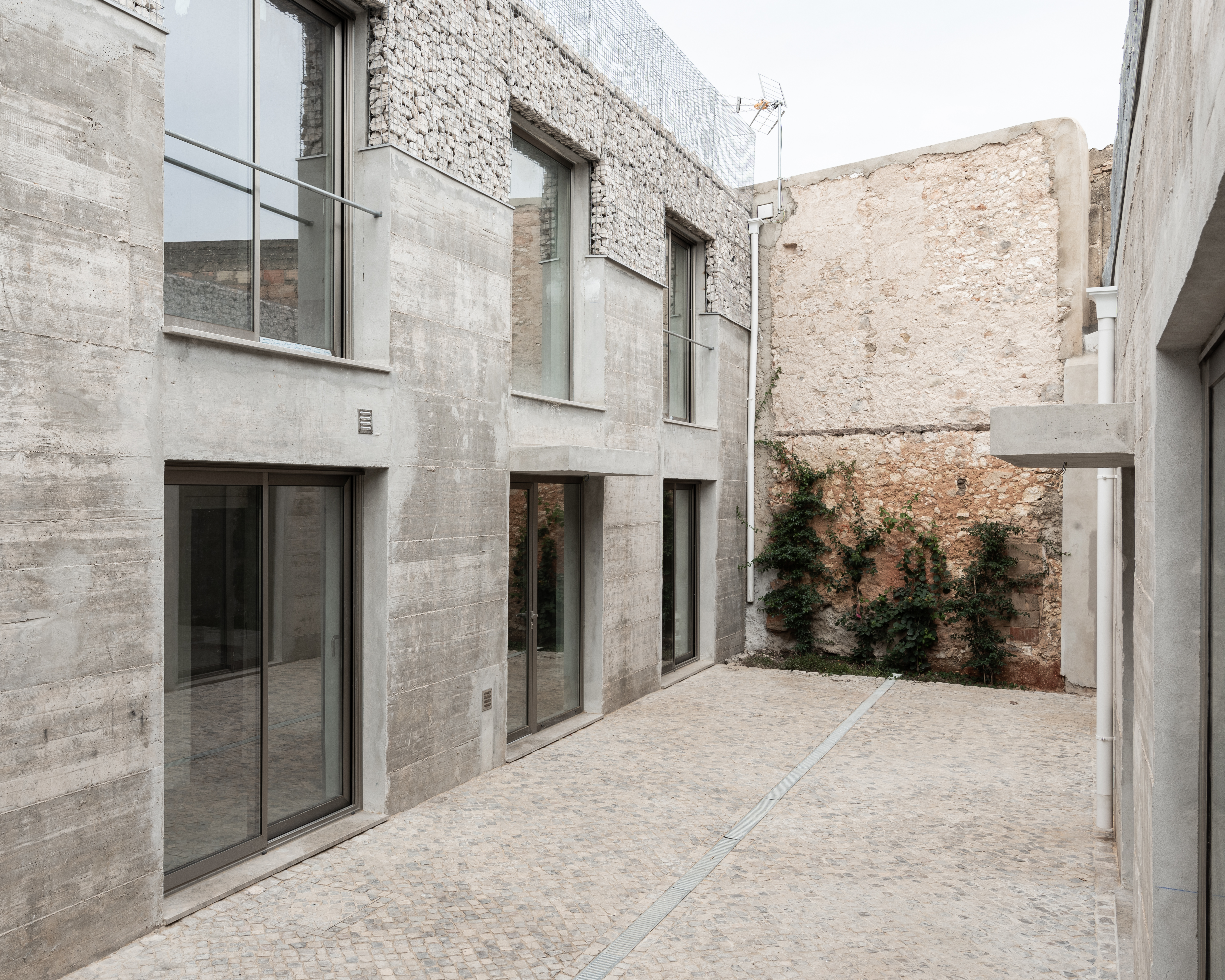 Three concrete façades of three houses are set around a courtyard. Each façade displays a different arrangement of the same constructive principle: a wall of exposed concrete rises from the ground, then, at a certain moment, a metal grid emerges from the concrete to contain a variety of local stones stacked on top of each other, until finally, the grid contains nothing but air.
